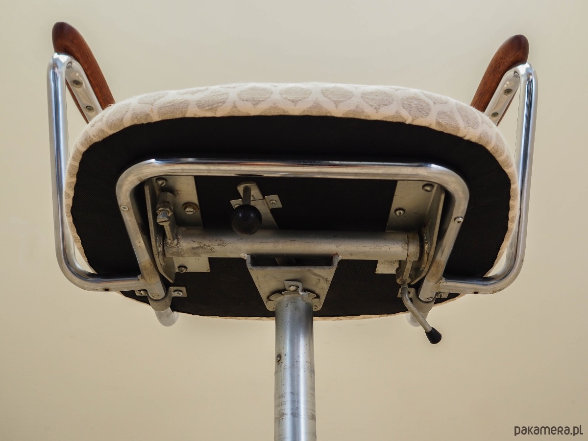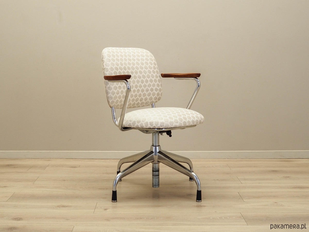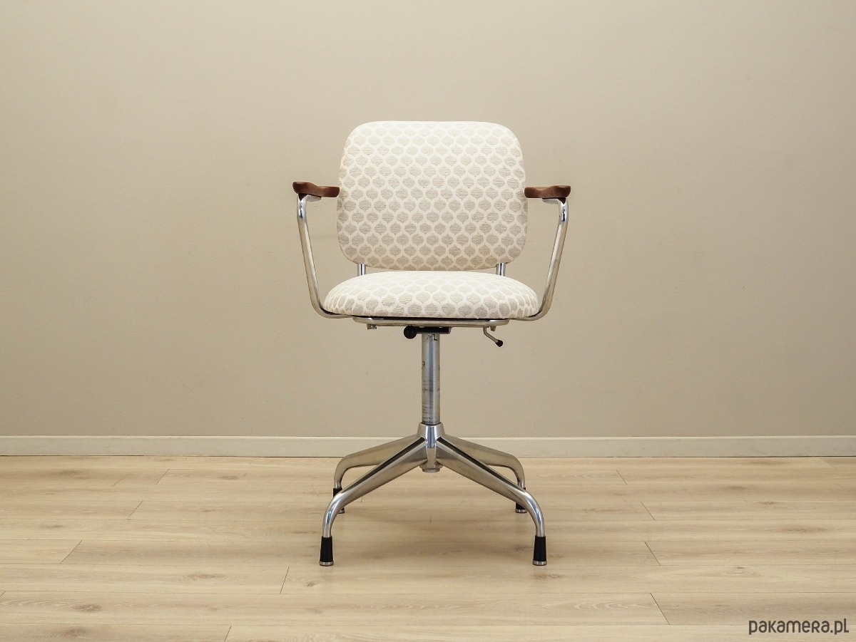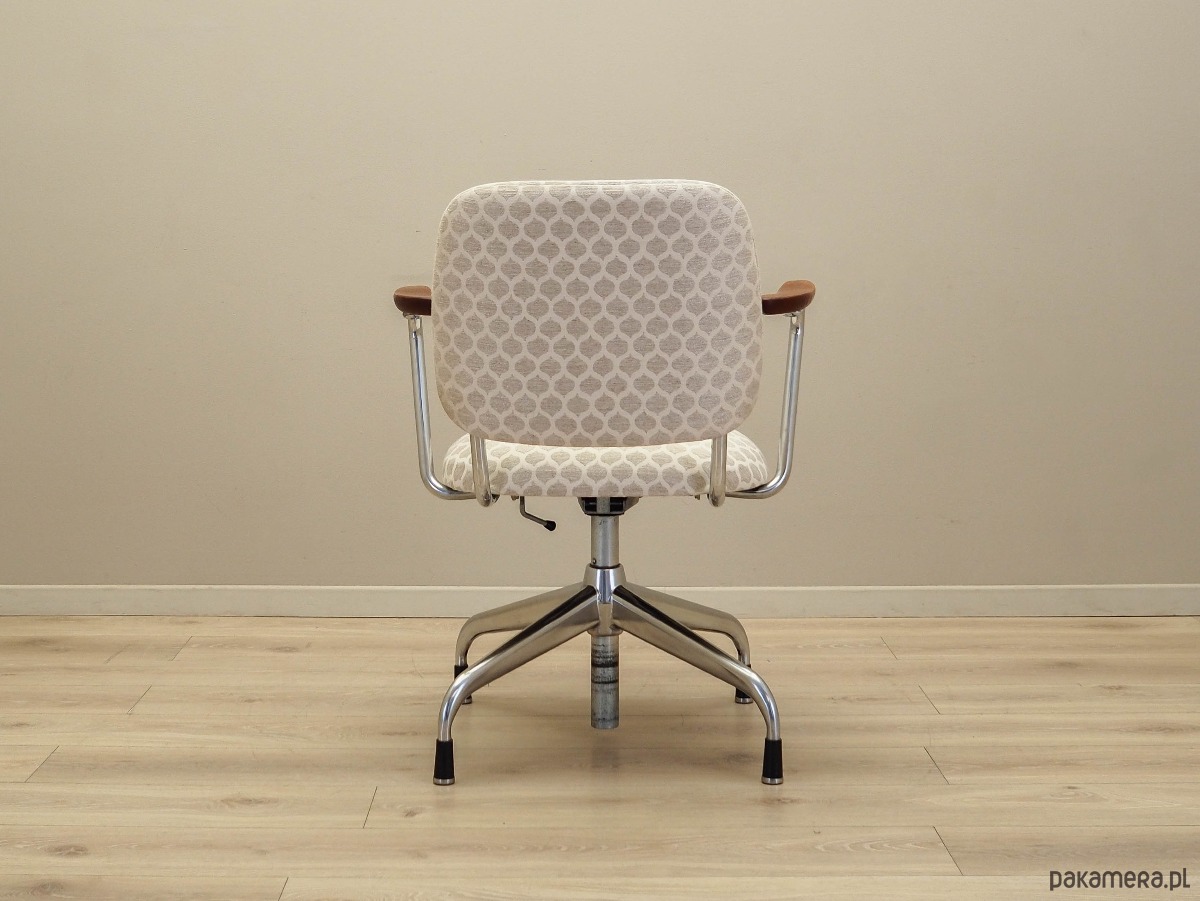Podstawa oraz konstrukcja wykonane z metalu w kolorze srebrnym. Podłokietniki wykonane z litego drewna tekowego. Fotel został poddany renowacji tapicerskiej, tkanina wymieniona na nową. Tapicerka została wykonana w kolorach beżowym i białym, wykorzystana została wysokogatunkowa tkanina. Dodatkowym atutem jest możliwość regulacji wysokości oraz pochylenia.