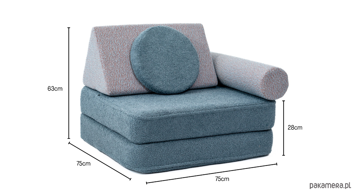 Fotel Playlo ma szerokość 75 cm i 75 cm głębokości. Jego wysokość całkowita to 63 cm, przy wysokości siedziska 28 cm.