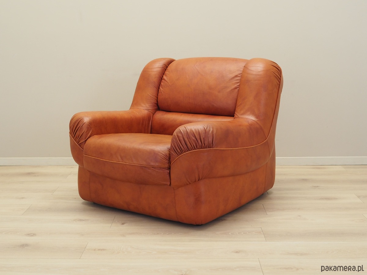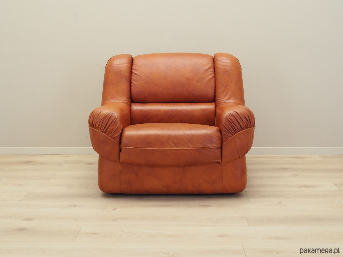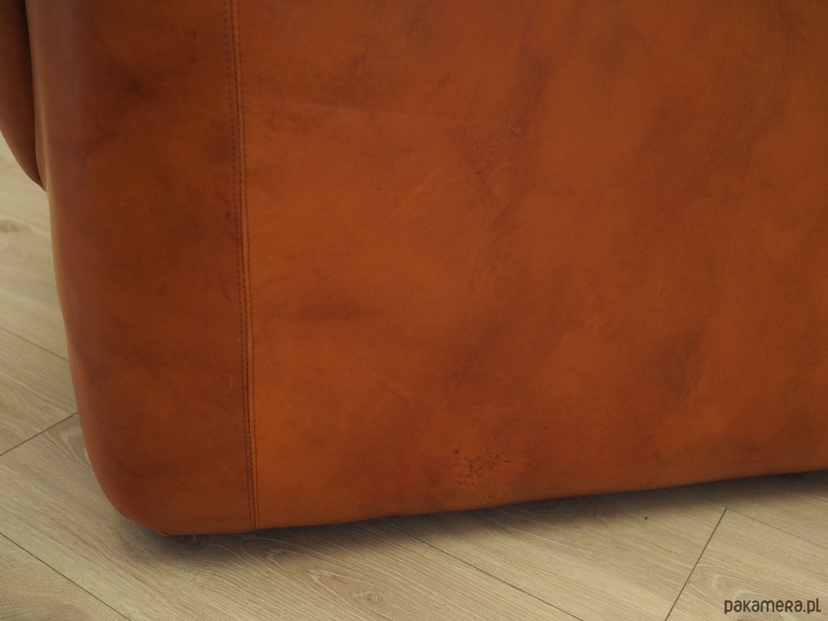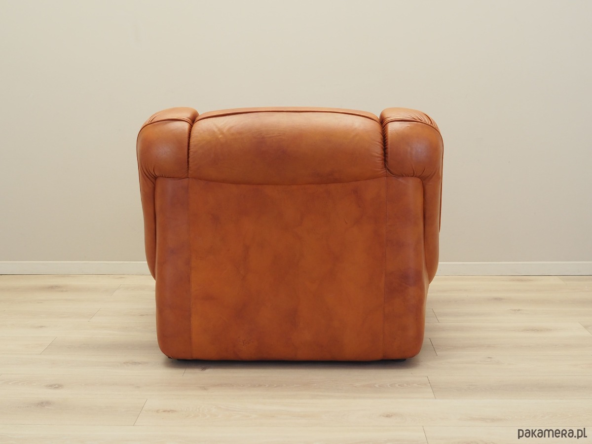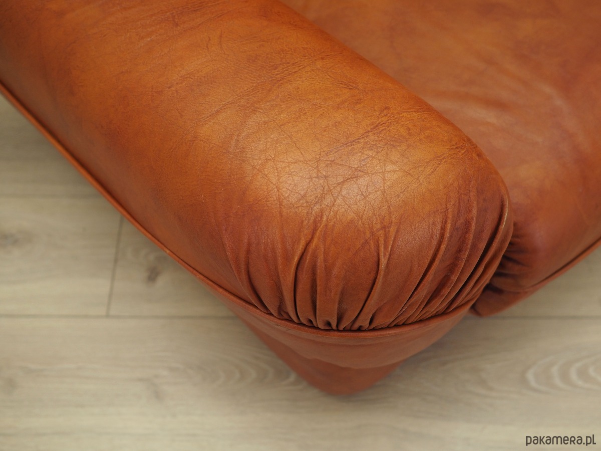 Nogi wykonane z tworzywa sztucznego. Fotel został zachowany w oryginalnej skórze. Tapicerka została wykonana w kolorze pomarańczowym, wykorzystano wysokogatunkową skórę naturalną. Dostępne dwie sztuki. Cena dotyczy jednej sztuki.