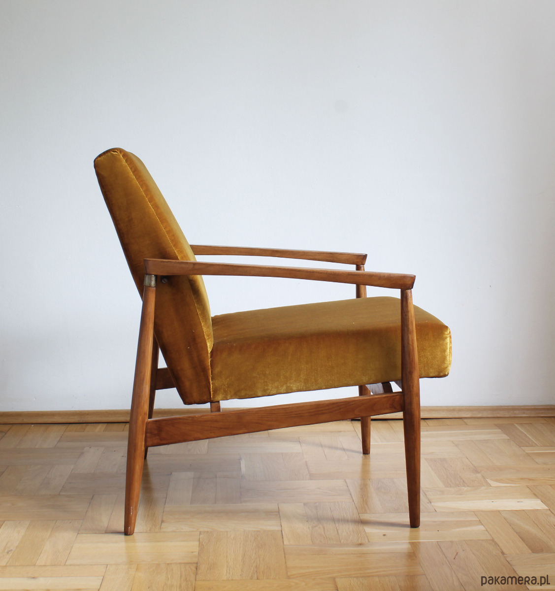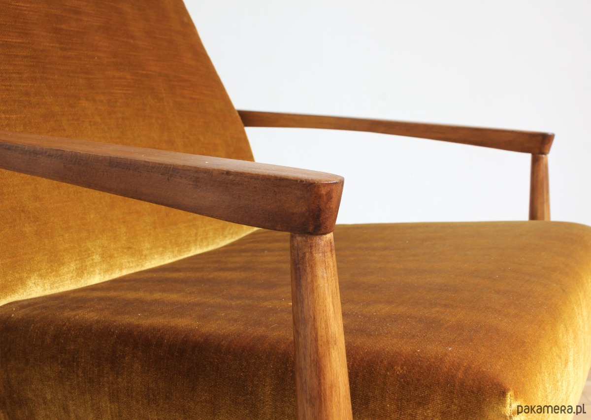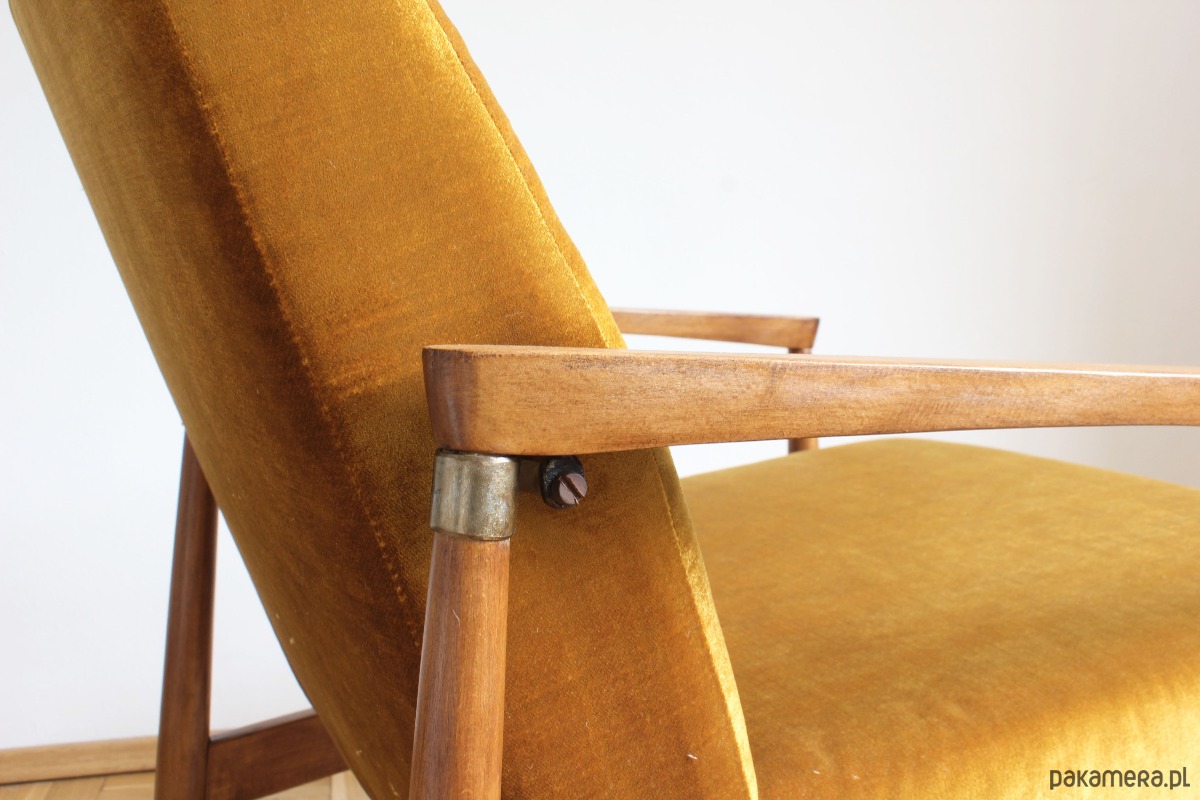 Fotel jest po gruntownej renowacji tapicersko-stolarskiej. Konstrukcja wykonany z drewna dębowego. Drewniane nogi zostały gruntownie oczyszczone, wybarwione na kolor ciemny dąb i pokryte lakierem w półmacie. Charakterystyczny kształt fotela to ikona czechosłowackiego designu. Tapicerka wykonana z wysokiej jakości aksamitu w złoto-żółtym kolorze.