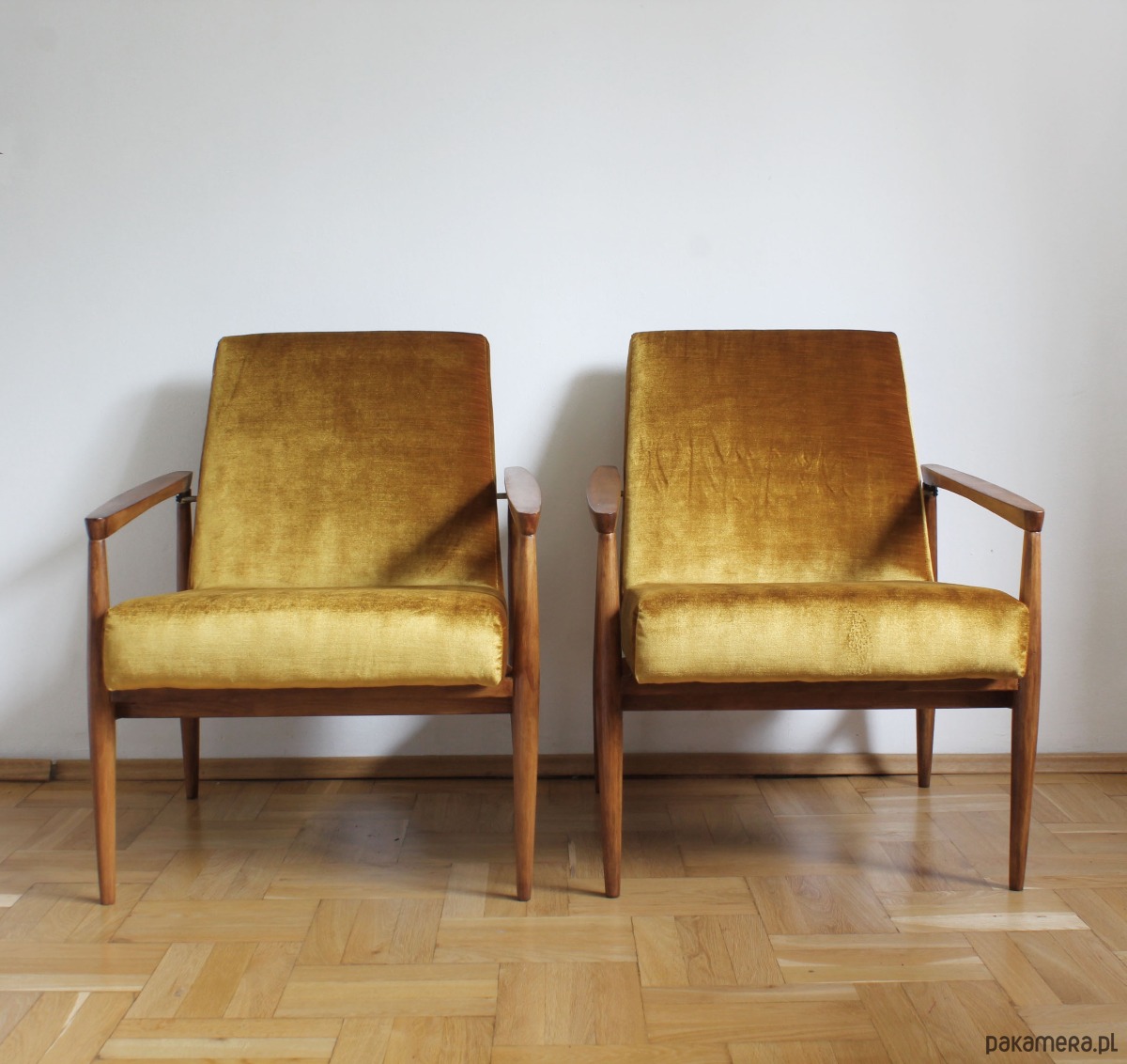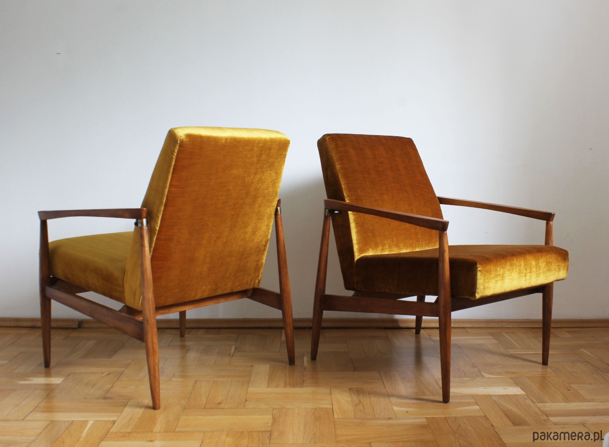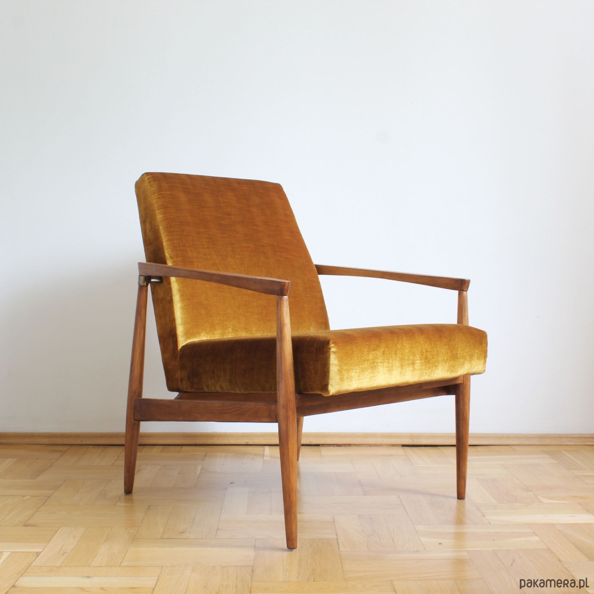 Fotel jest po gruntownej renowacji tapicersko-stolarskiej. Konstrukcja wykonany z drewna dębowego. Drewniane nogi zostały gruntownie oczyszczone, wybarwione na kolor ciemny dąb i pokryte lakierem w półmacie. Charakterystyczny kształt fotela to ikona czechosłowackiego designu. Tapicerka wykonana z wysokiej jakości aksamitu w złoto-żółtym kolorze.