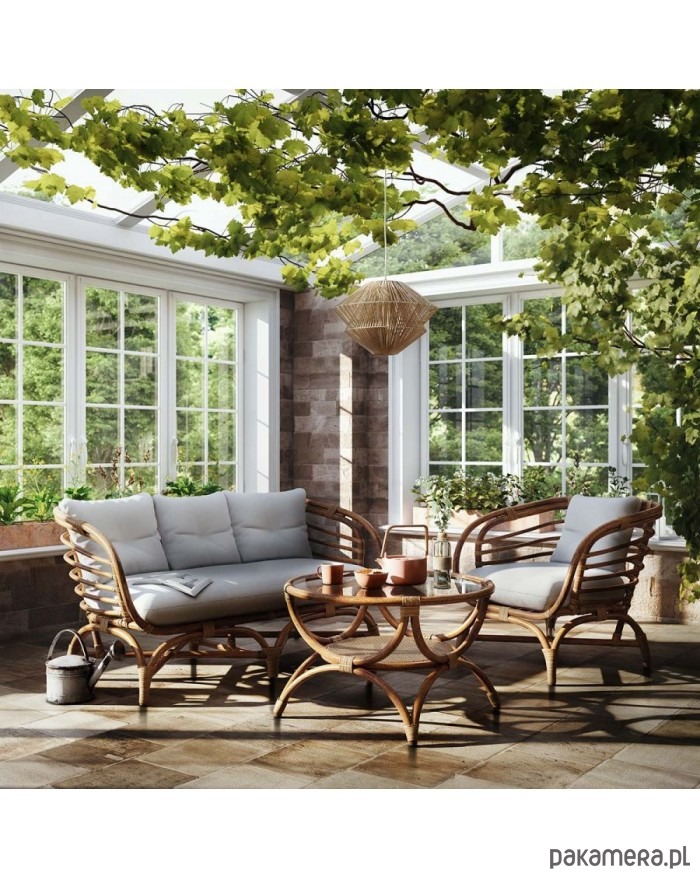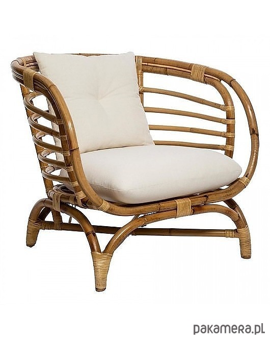 Piękny fotel ogrodowy wykonany w całości z giętego rattanu i wikliny. W kolorze naturalnym. Solidny. Dodatkowo posiada wygodną poduchę w kolorze kości słoniowej, wypełnioną pianką poliuretanową.