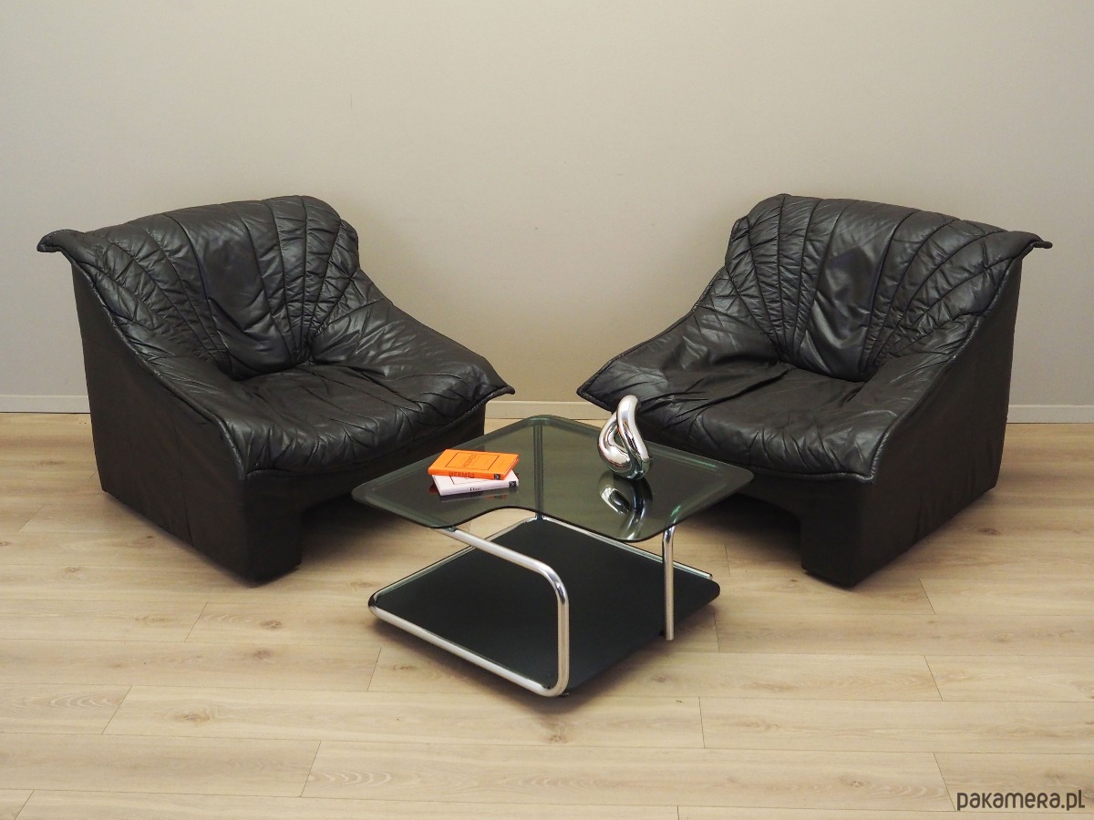 Konstrukcja została wykonana z drewna. Fotel pokryty jest oryginalną wysokiej jakości skórą naturalną. Skóra została wykonana w kolorze ciemnobrązowym. W naszej ofercie dostępny jest również drugi, identyczny fotel - razem stworzą niepowtarzalny zestaw.