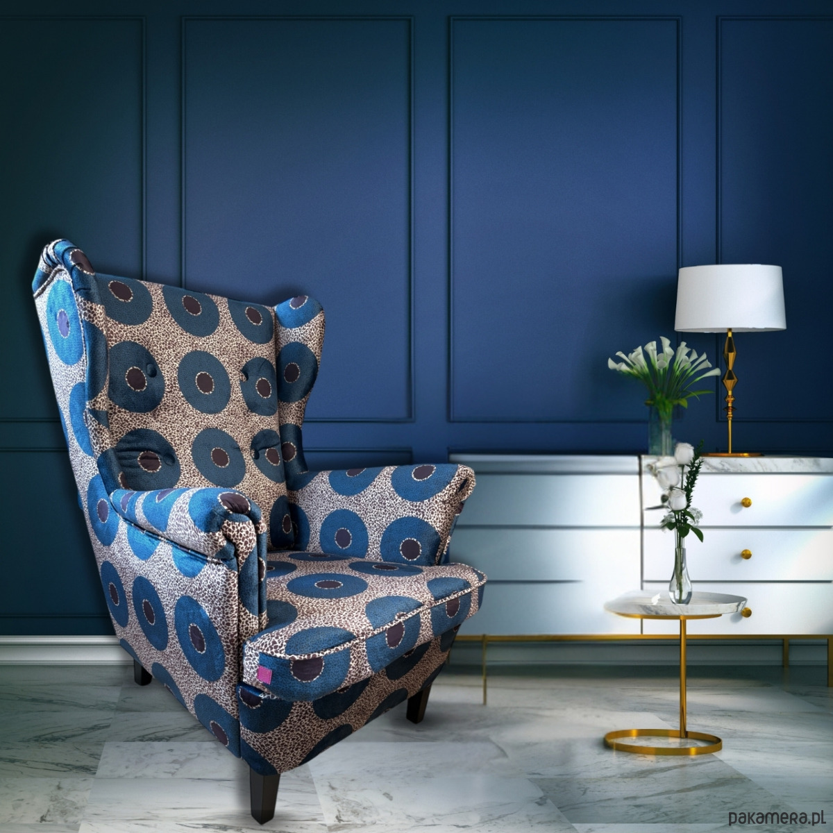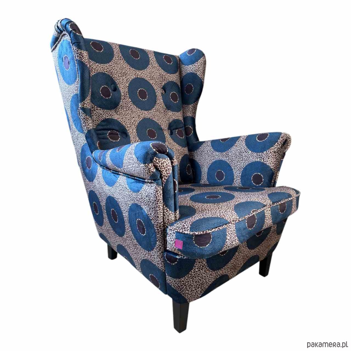 Niezwykły, oryginalny fotel uszak. Jedyny taki na polskim rynku. Piękny, zaprojektowany przez nas wzór na mięsistej tkaninie welurowej. Bardzo elegancki ale jednocześnie w ekstrawaganckim stylu. Nadaje wnętrzu pazura. Pasuje do salonu, sypialni lub gabinetu. Idealnie wpasuje się do każdej aranżacji wnętrza której nada wyjątkowości.