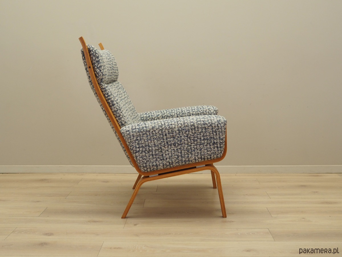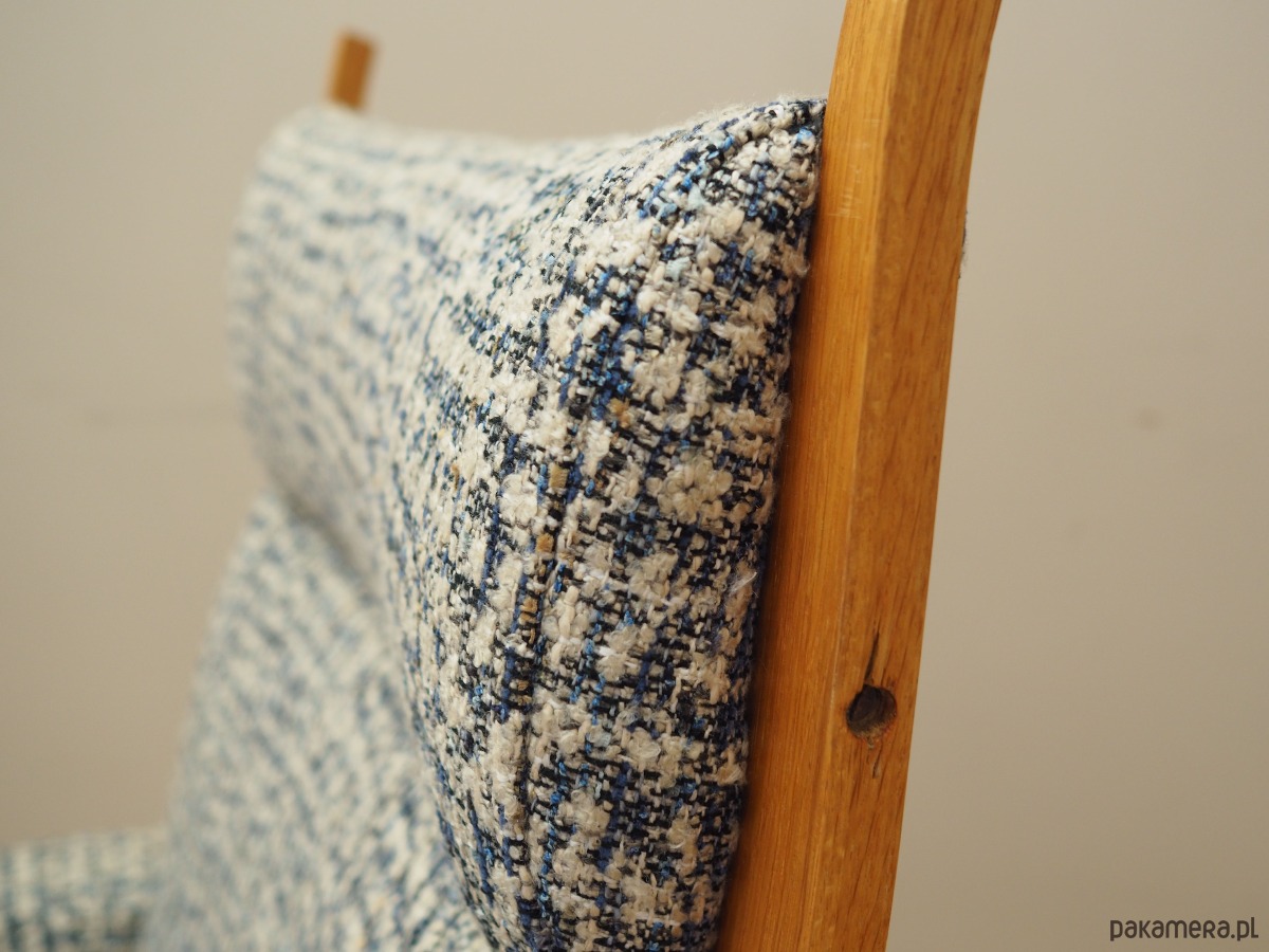 Konstrukcja wykonana ze sklejki pokrytej fornirem dębowym. Fotel został poddany renowacji tapicerskiej, tkanina wymieniona na nową. Wykorzystana została wysokogatunkowa tkanina melanżowa w kolorze niebieskim.