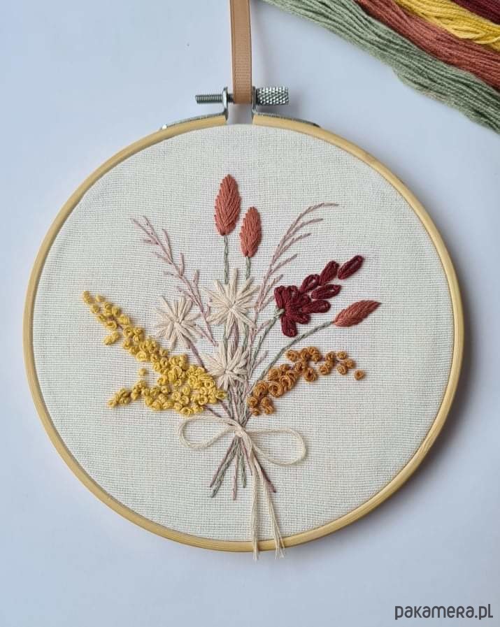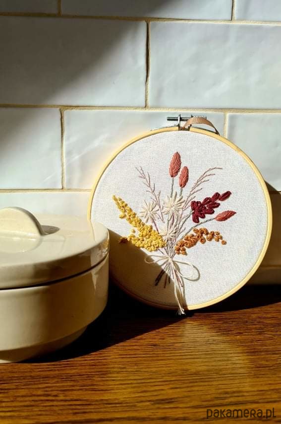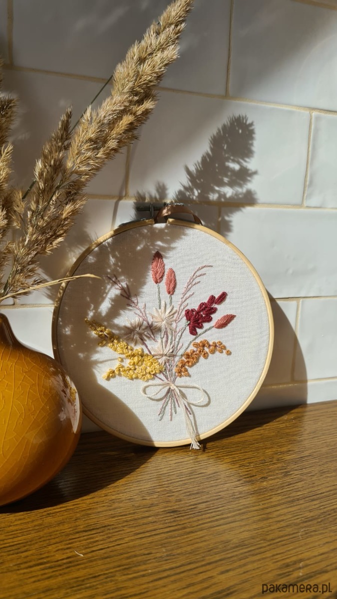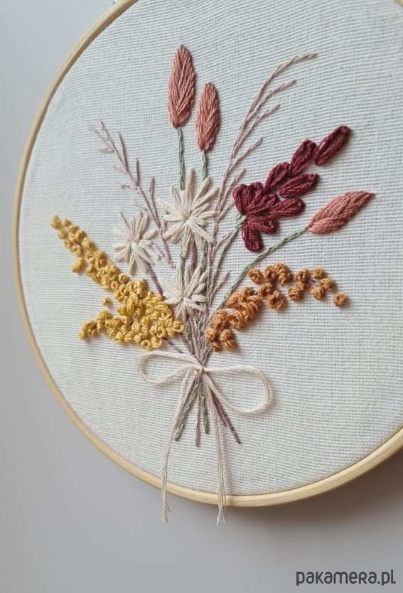 Kwiaty haftowane na tamborku o średnicy 15cm, na materiale z bawełny.