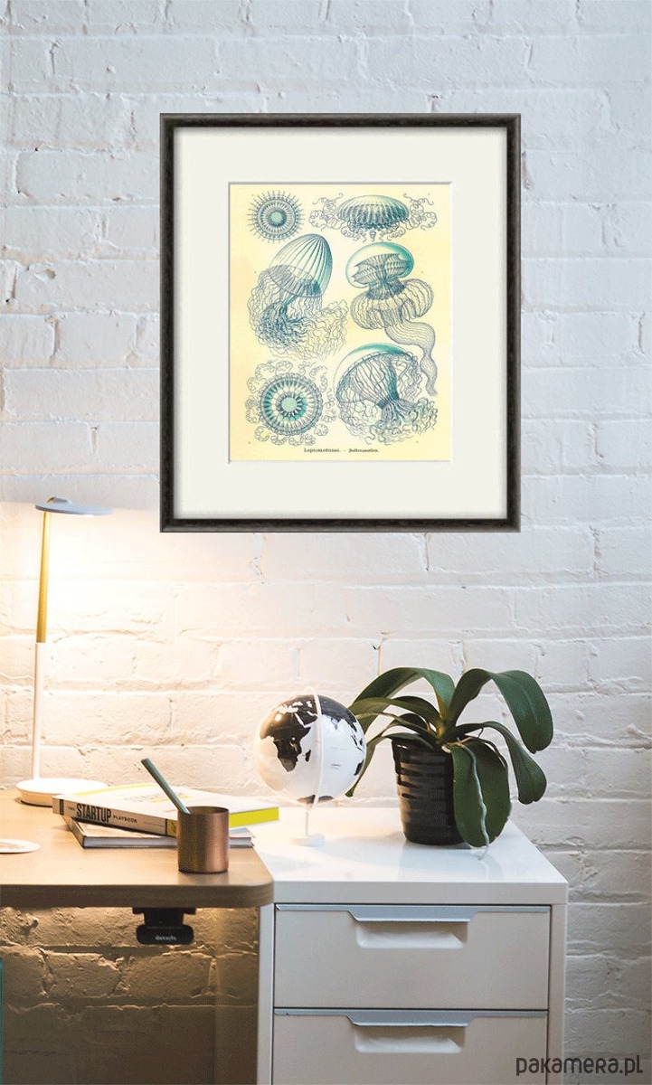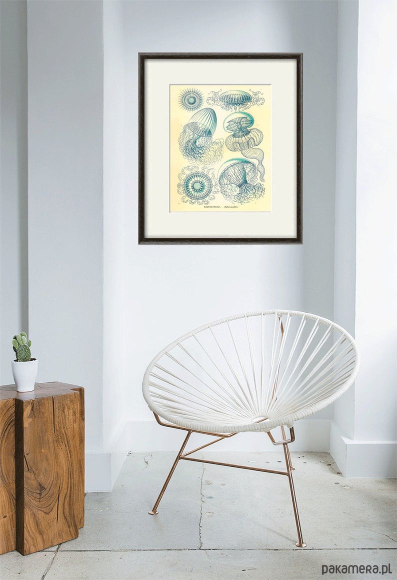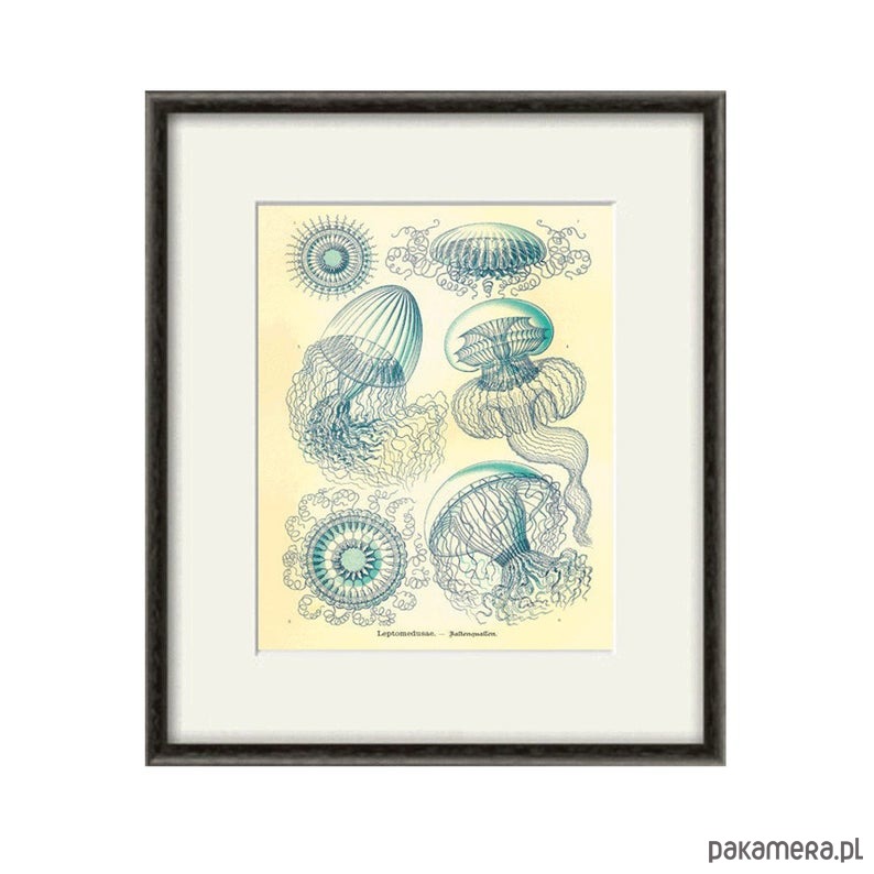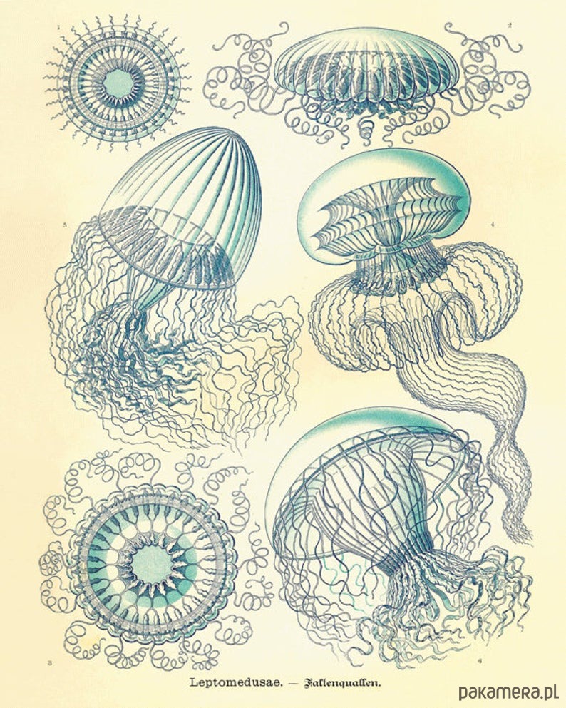 Grafika wielobarwna przedstawiająca meduzy. Wysokiej jakości reprint oryginału z XIX wieku. Autor oryginału Ernst Haeckel, niemiecki lekarz przyrodnik i podróżnik