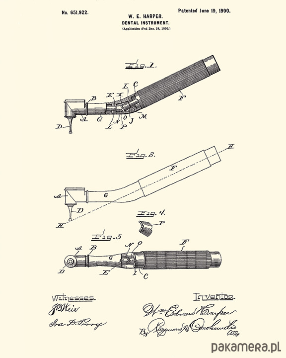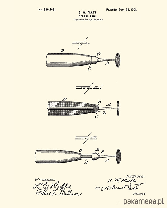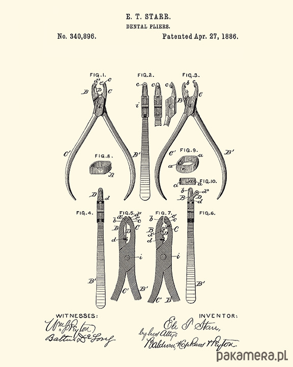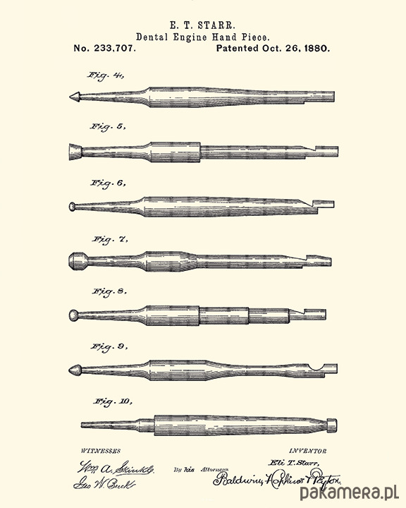 Zestaw 6 grafik z przełomu XIX i XX w rysunki zgłoszeń patentowych przedstawiające narzędzia i dentystyczne . Obrazy przetworzone cyfrowo