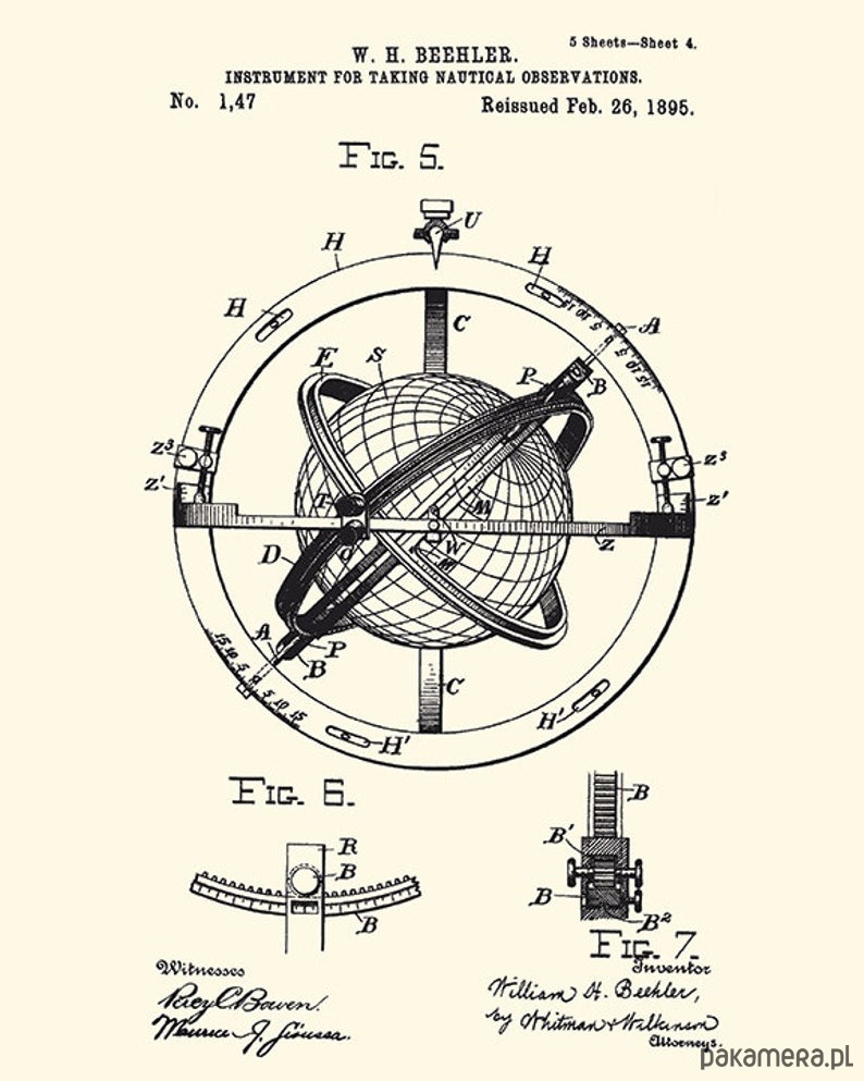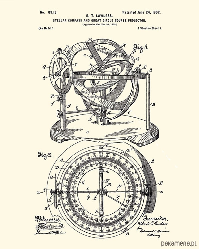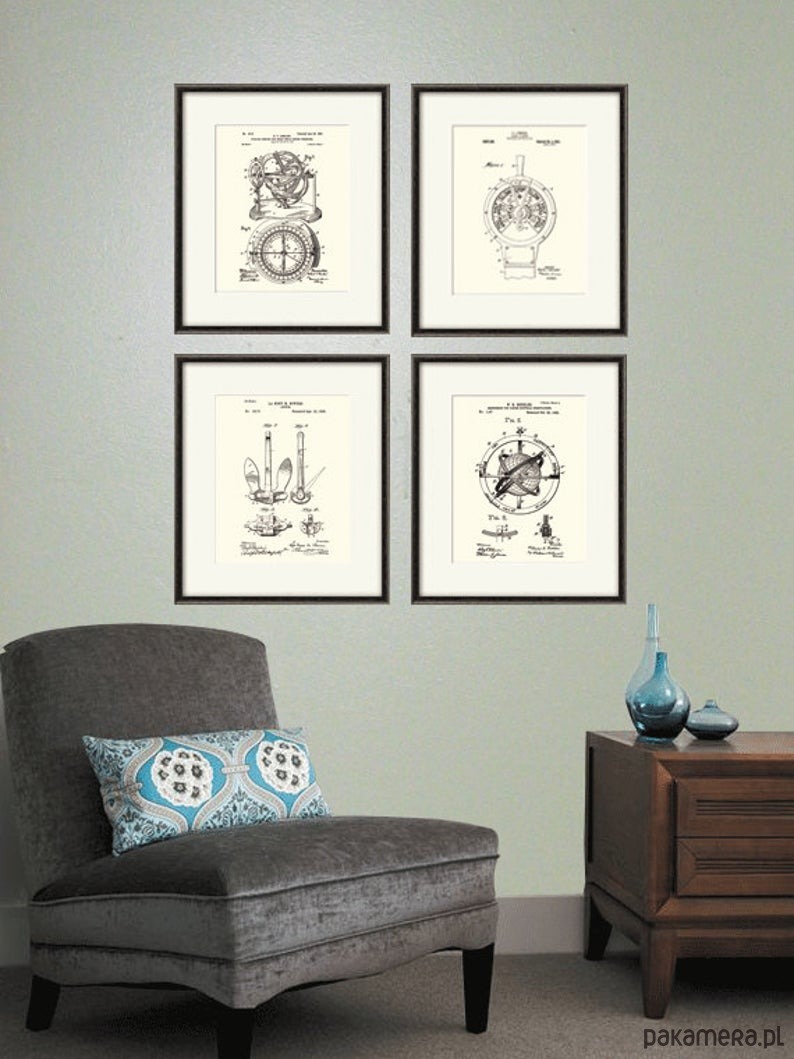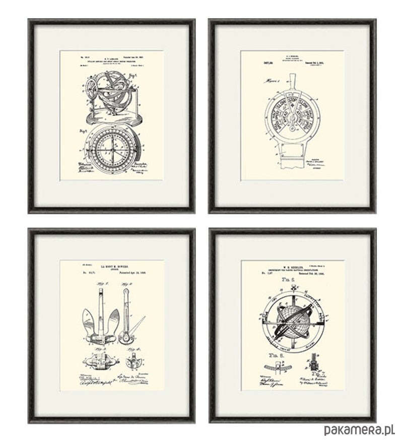 Zestaw 4 grafik z początku XX w rysunki zgłoszeń patentowych przedstawiające żeglarstwo i przyrządy nawigacyjne . Obrazy przetworzone cyfrowo