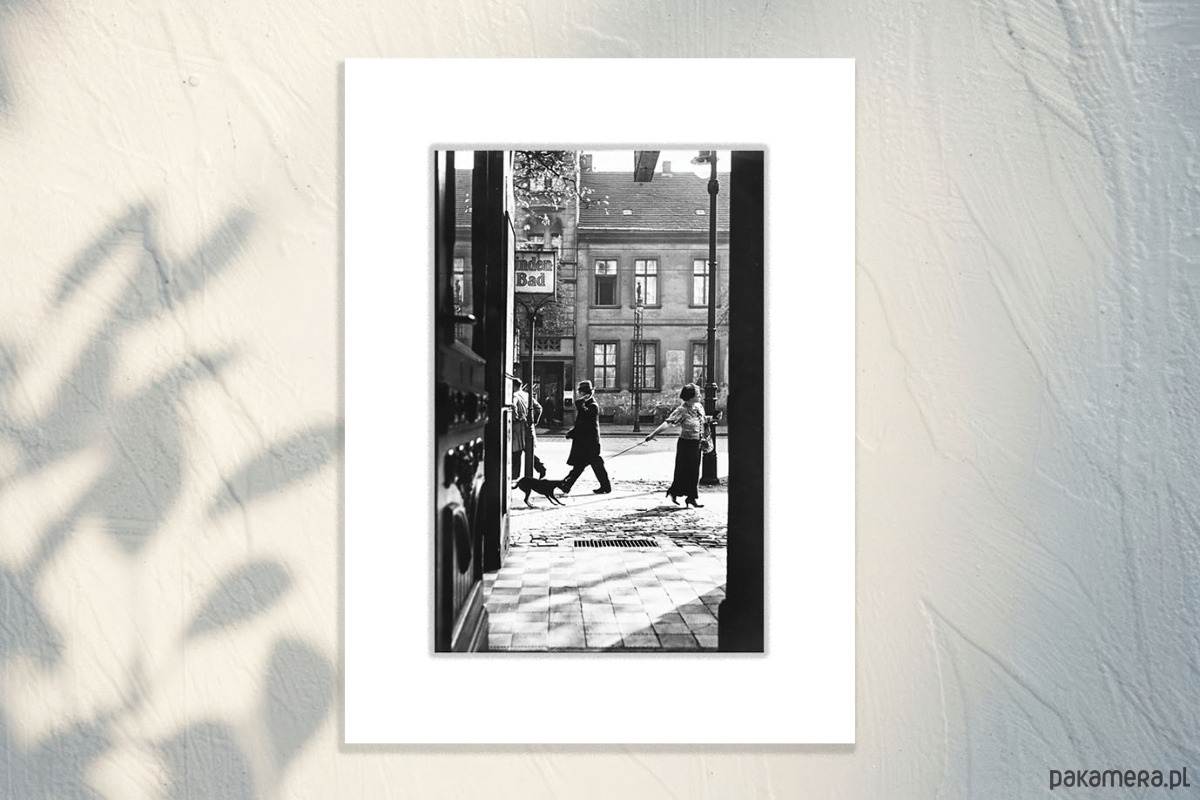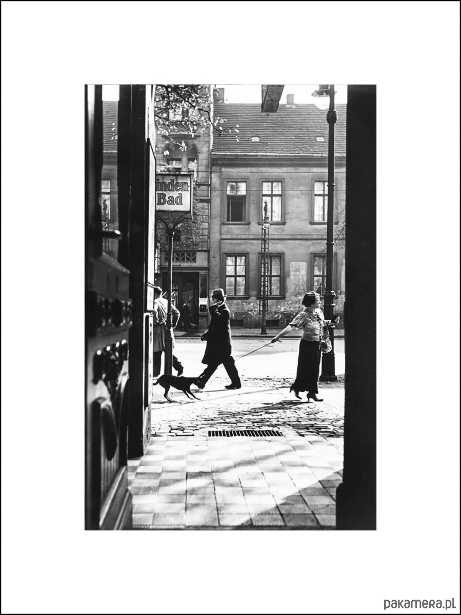 Tę nastrojową scenę uliczną uchwycił Roman Vishniac, znany fotograf, znany z dokumentowania życia żydowskiego w Europie Środkowej i Wschodniej przed II wojną światową. Zdjęcie przedstawia zwyczajną scenę – kobietę odciągającą psa na nasłonecznionej brukowanej ulicy, obok której przechodzi mężczyzna. W tle napis „Linden Bad” przywołuje atmosferę miejsca – prawdopodobnie niemieckojęzycznego miasta z lat 30. XX wieku. Talent Vishniaca do odnajdywania cichej poezji w codzienności jest tu w pełni widoczny: geometria cieni, faktury kamienia i szkła oraz wzajemne oddziaływanie ludzi z otoczeniem tworzą subtelną, ponadczasową historię.