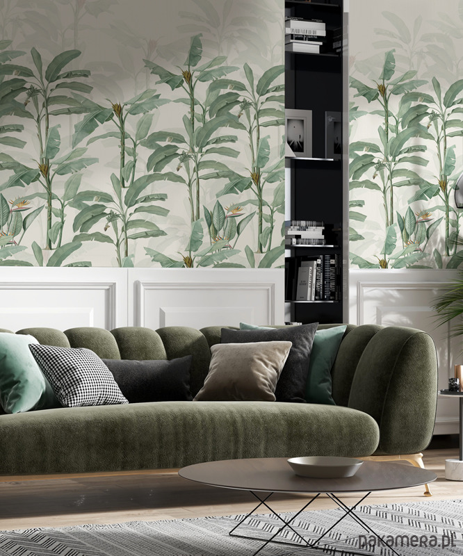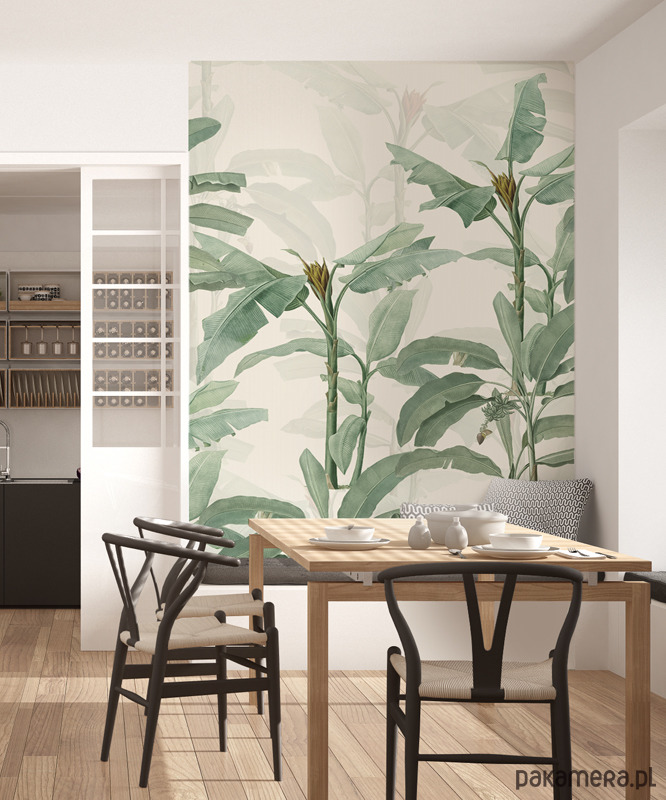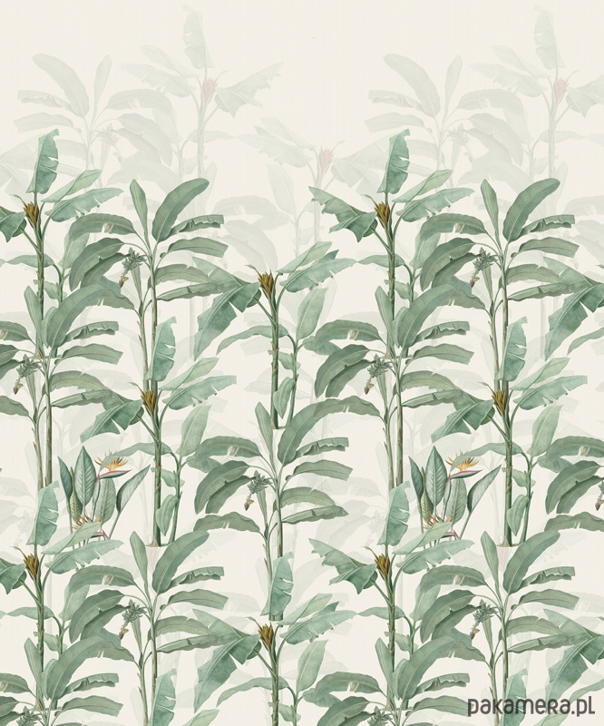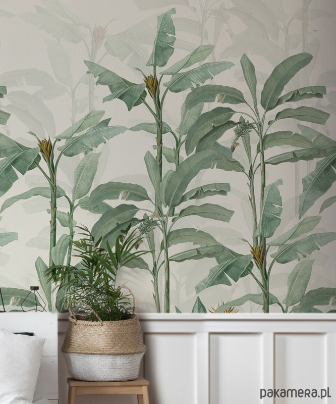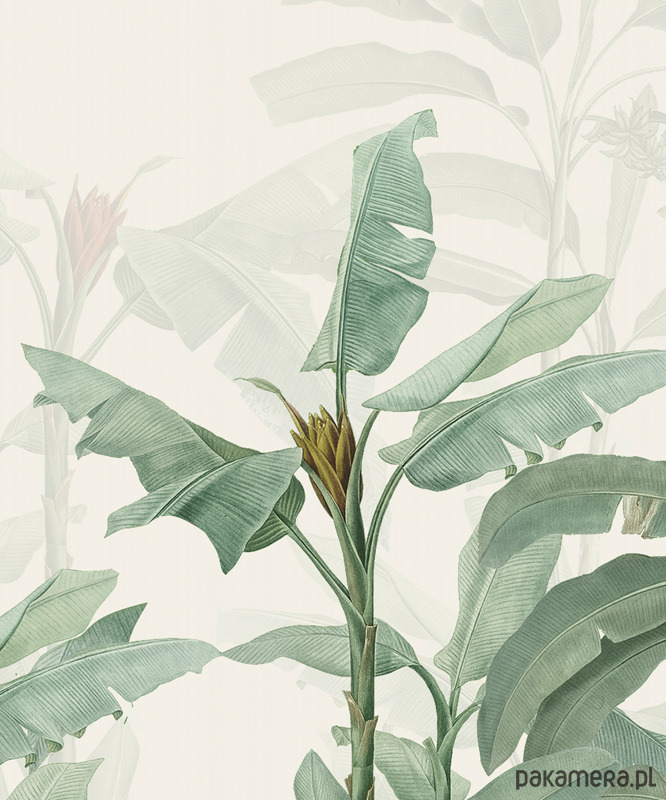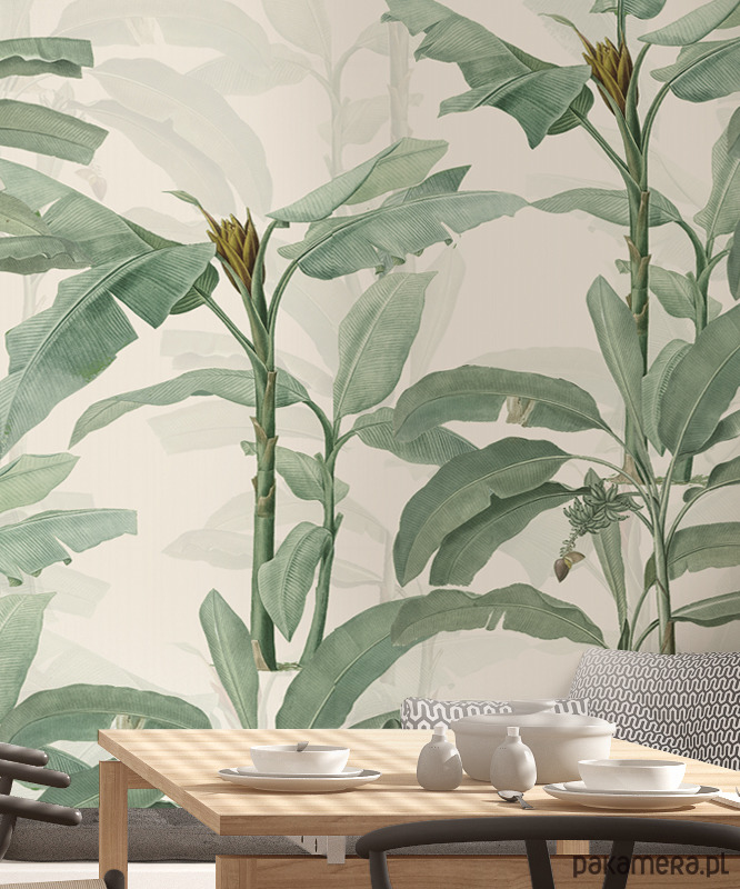 Botaniczna tapeta z drzewkami bananowca na tle w kolorze ecru. Otocz się zielenią! Odmień swoje wnętrze , poczuj radość i energię natury. Stwórz swoją własną, indywidualną przestrzeń do życia.