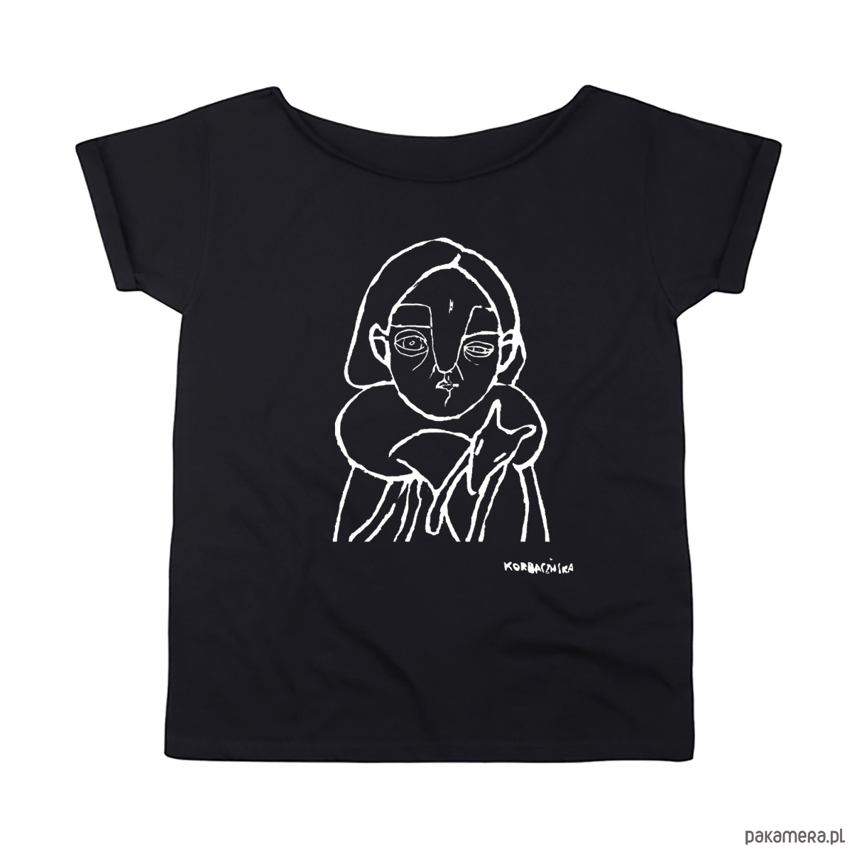 Ta czarna koszulka z białym konturowym obrysem inspirowanym obrazem Pauliny Korbaczyńskiej to dowód na to, że siła tkwi w prostocie.