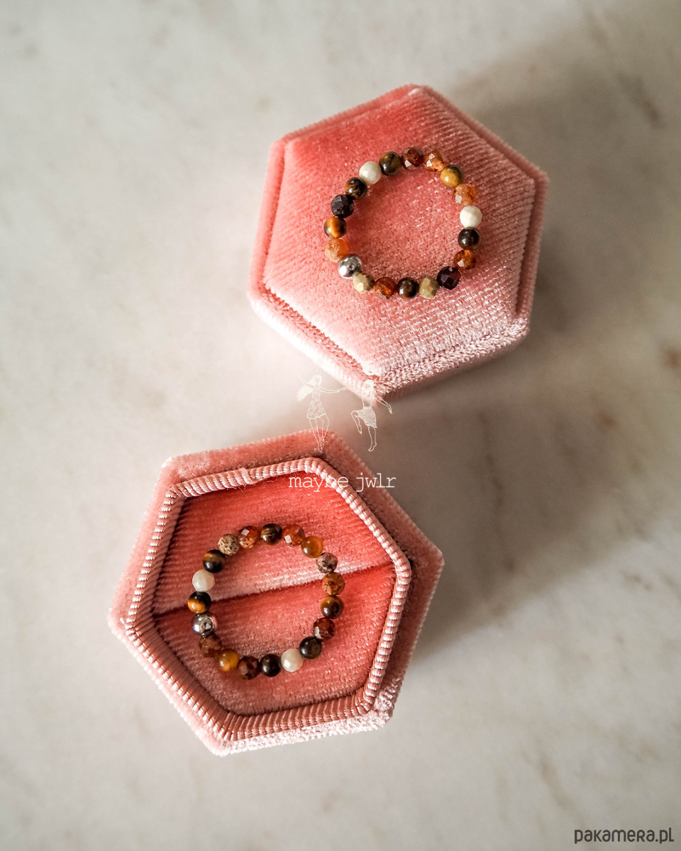 Całość pierścionka Fox została skomponowana tak aby się wyróżnić, głównie zostały wykorzystane granaty, kamienie rzeczne, oko tygrysa.