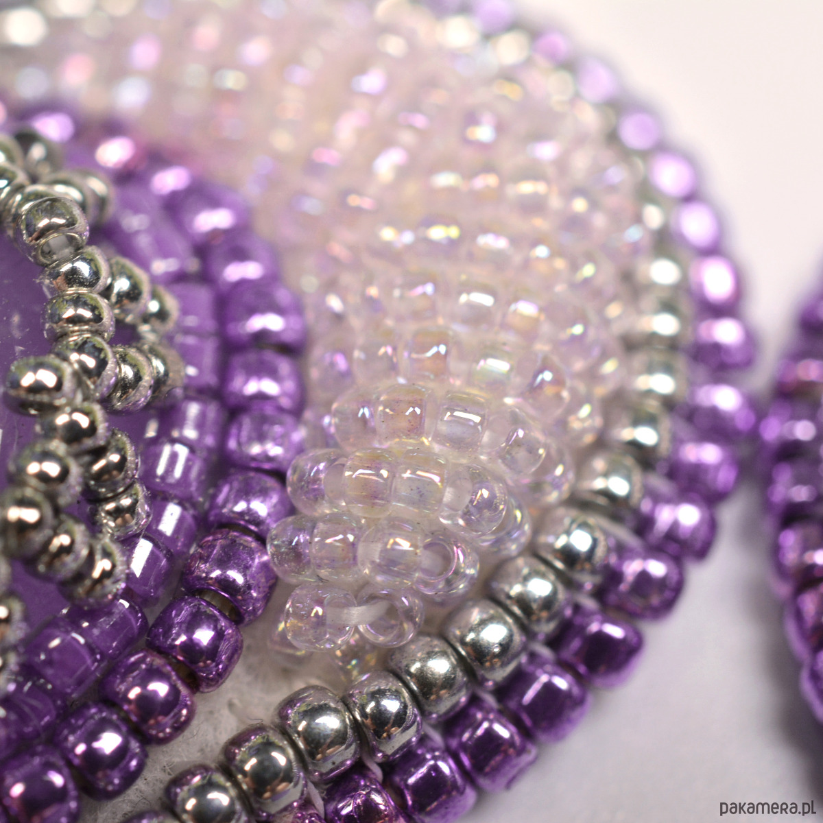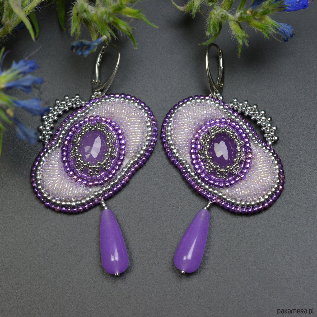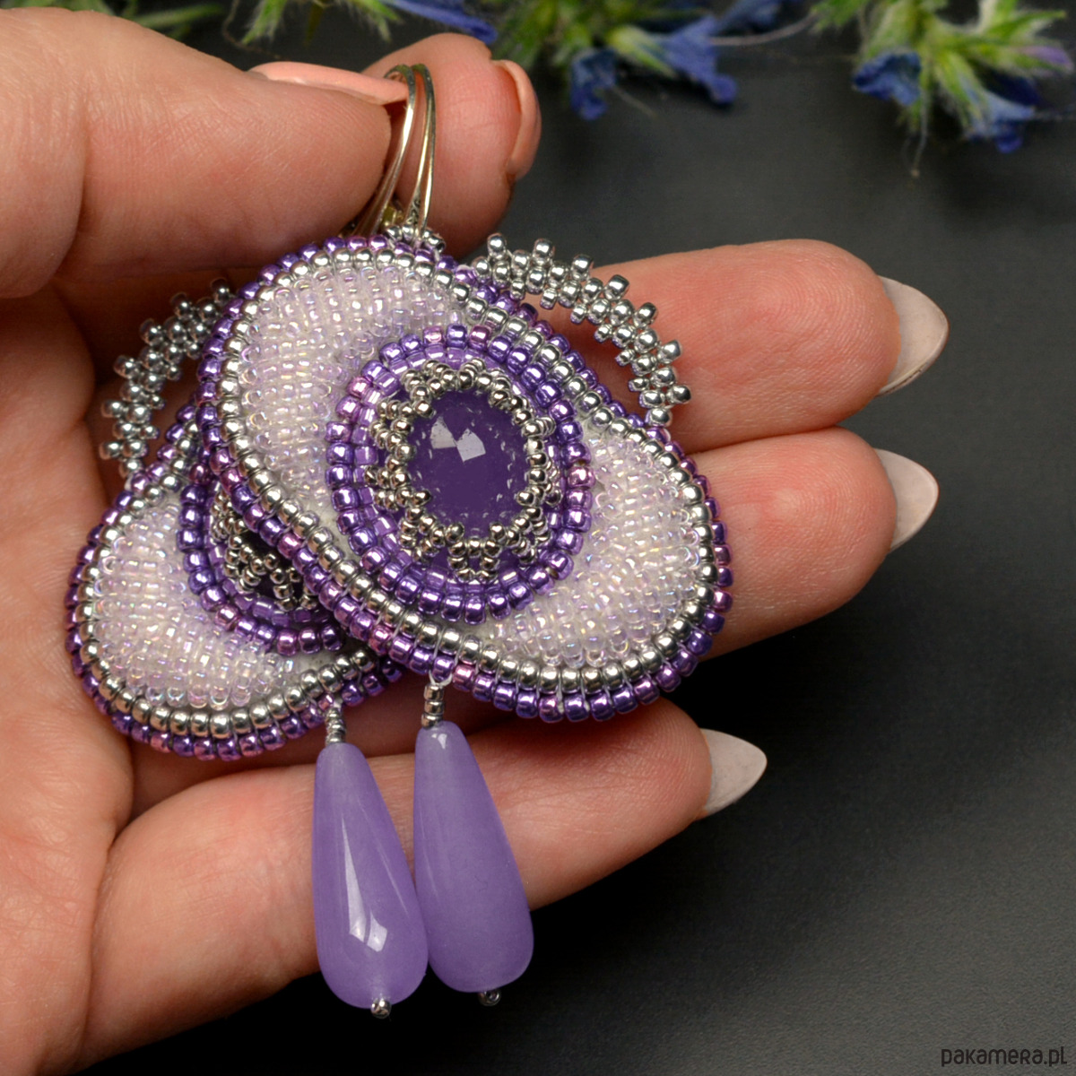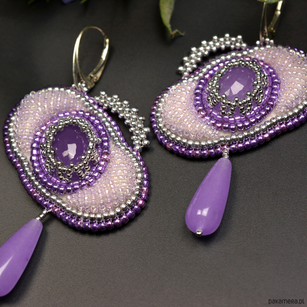 Ich serce stanowią fasetowane kaboszony fioletowego agatu i długie krople jadeitu. Oplotłam je najwyższej jakości japońskimi koralikami Toho i Miyuki w kolorze srebrnym i odcieniach fioletu.