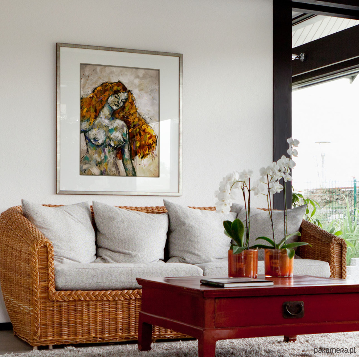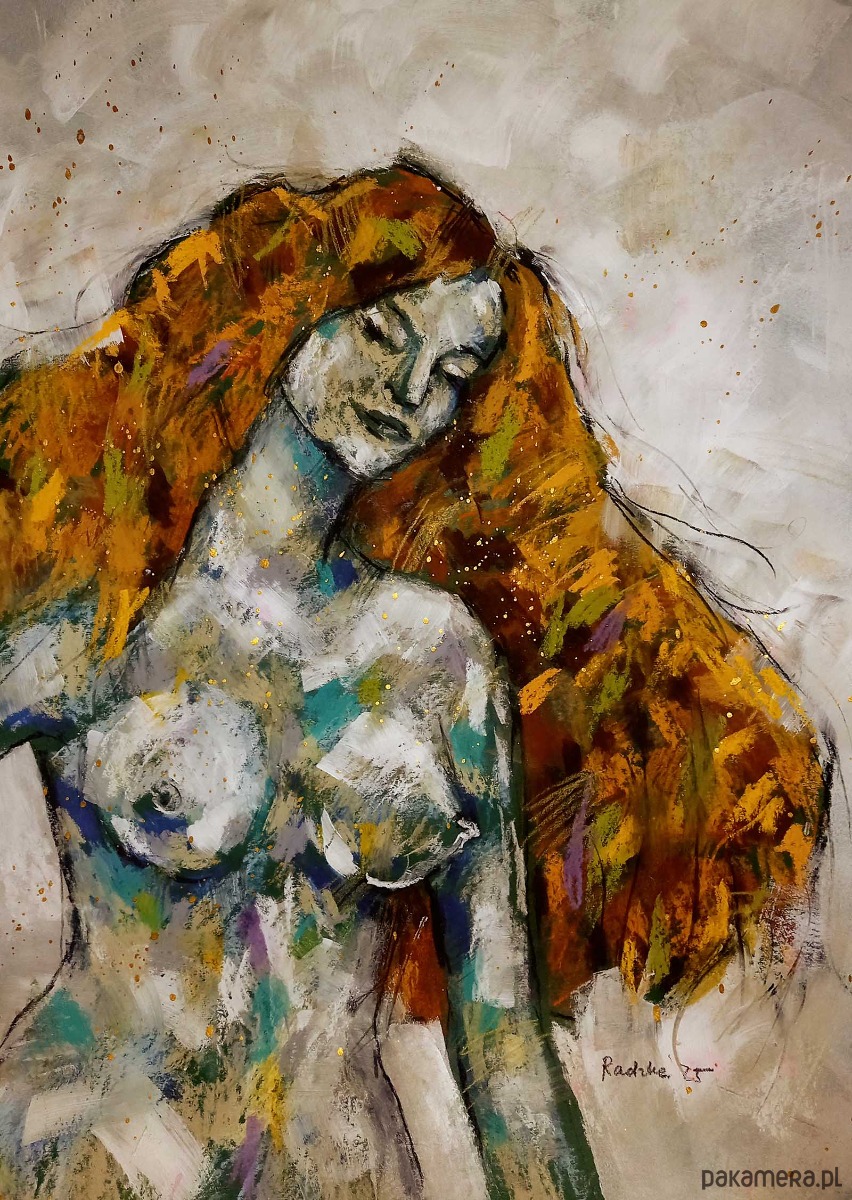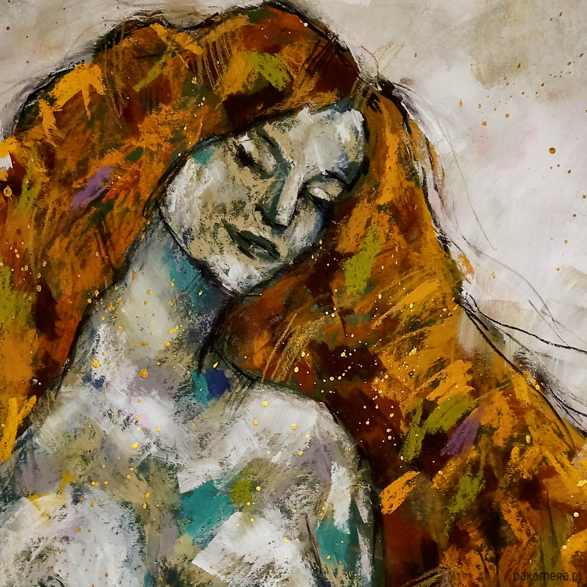 Rysunek wykonany pastelami suchymi, węglem, akrylami, złotym tuszem i złotą kredką na brystolu 50x70 cm, zabezpieczony fiksatywą, bez ramy. Na życzenie tworzę symulację kolorystyczną passe partout pasującego do rysunku. Kolory mogą nieznacznie odbiegać od oryginału w zależności od ustawień monitora. Pracę wysyłam w tubie przesyłką priorytetową.