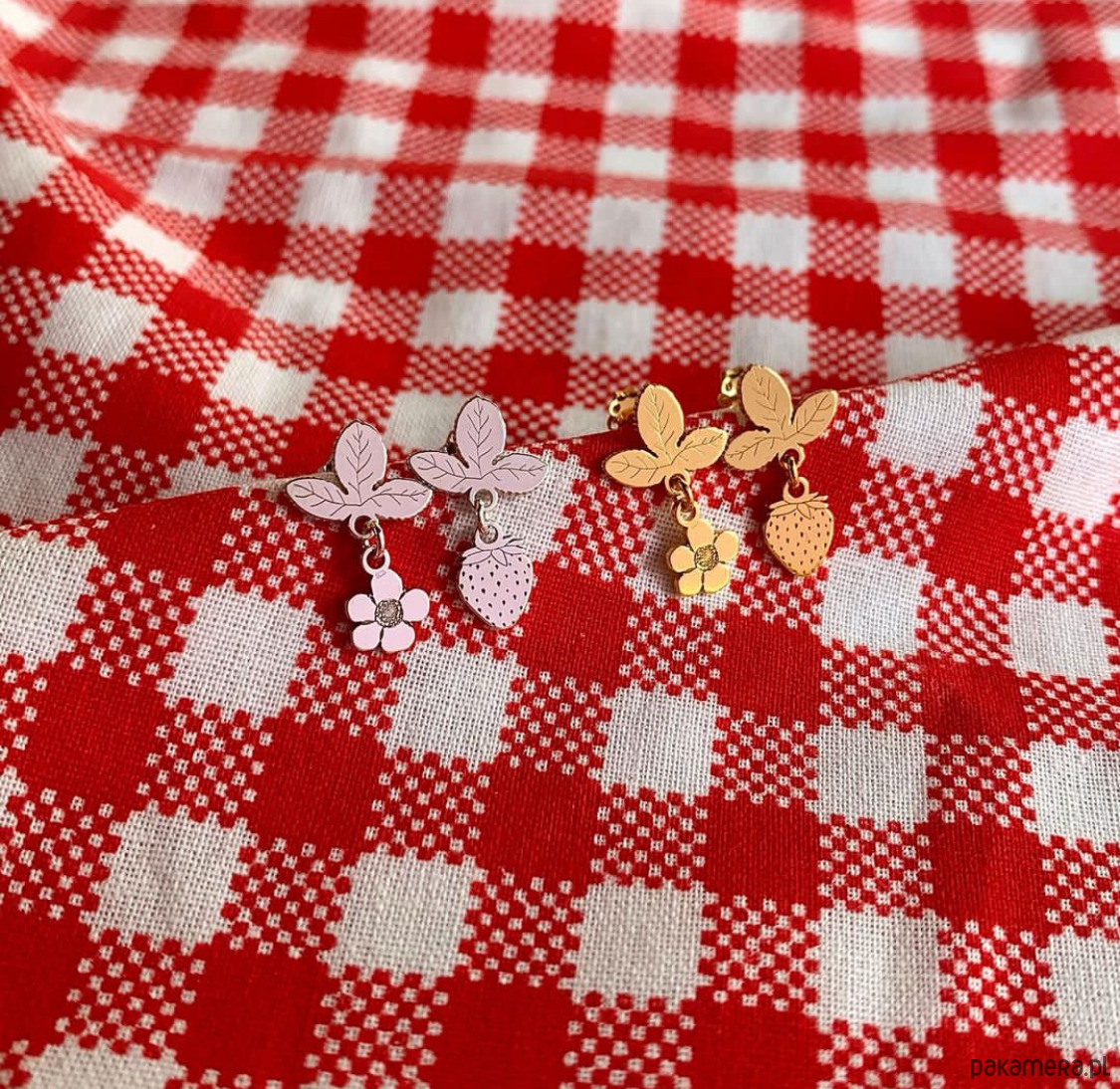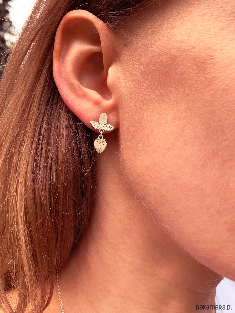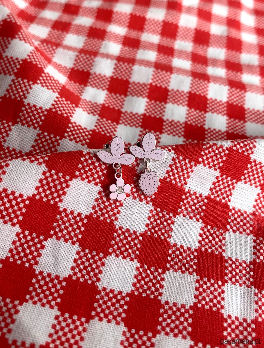 Kolczyki z najnowszej kolekcji Strawberries & Cherries z drobnymi zawieszkami truskawki oraz kwiatka truskawki