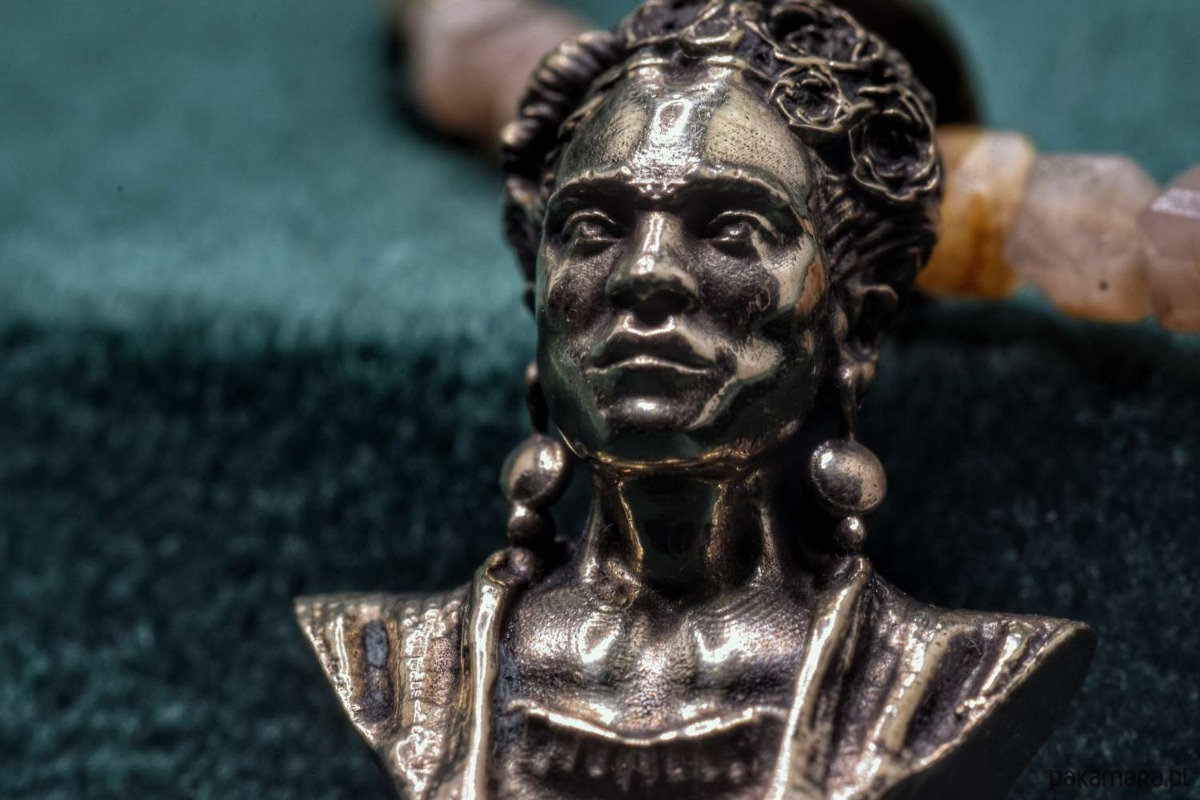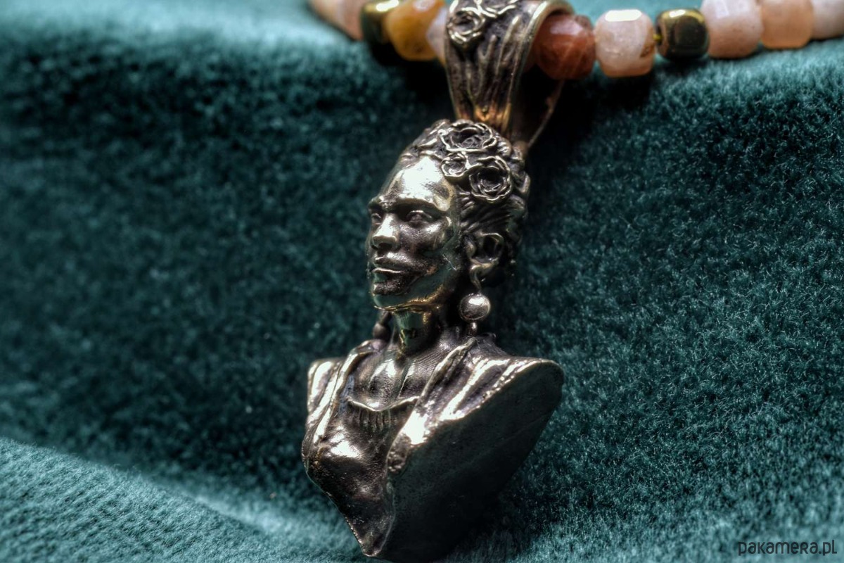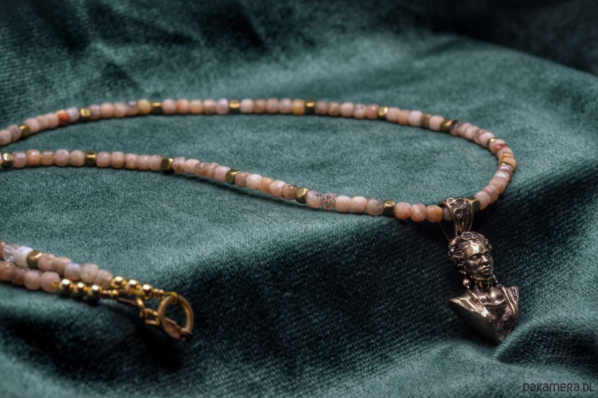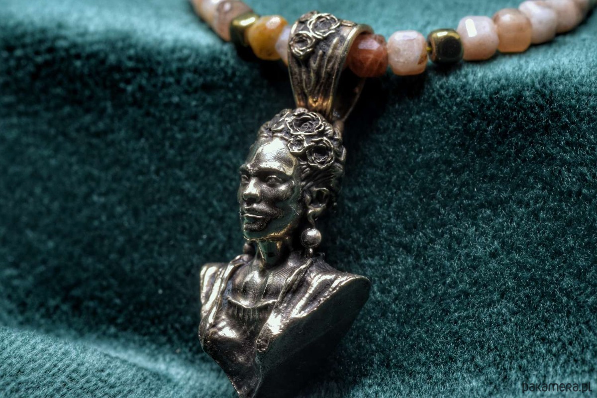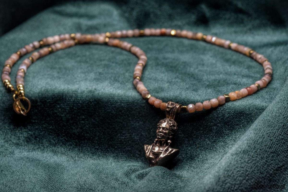 Naszyjnik z Fridą. Odlany z brązu. Na naturalnych kamieniach (hematyt oraz kamień słoneczny)
