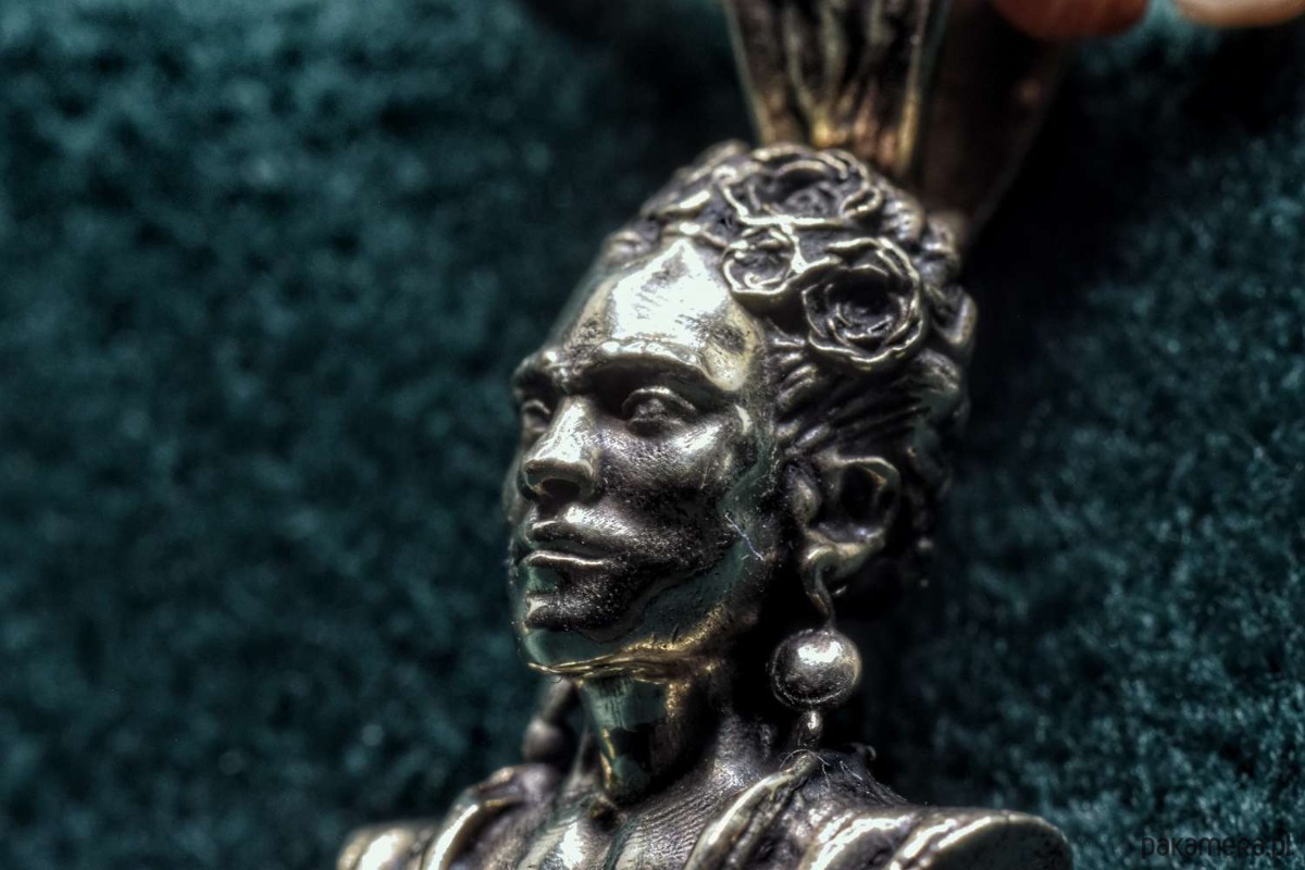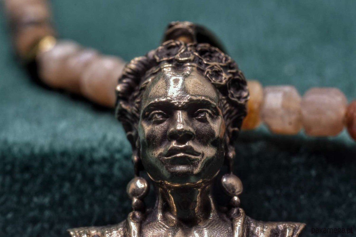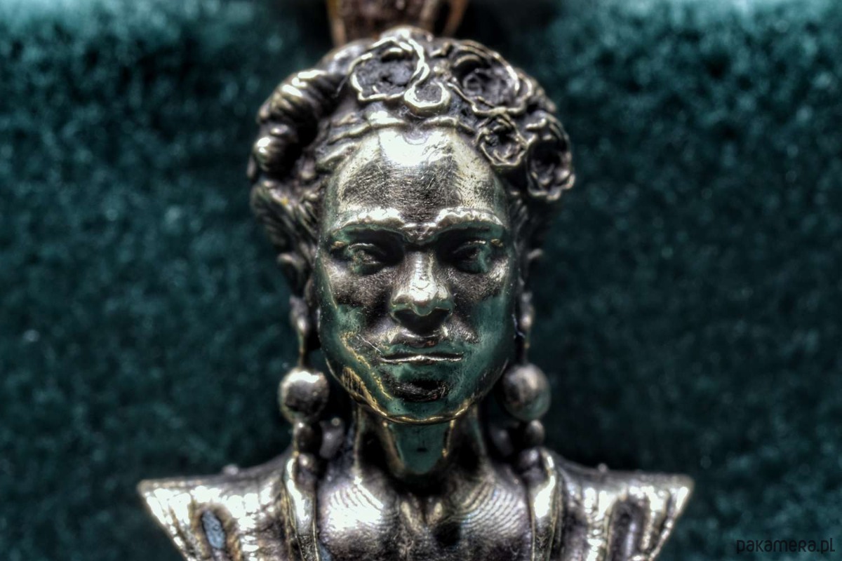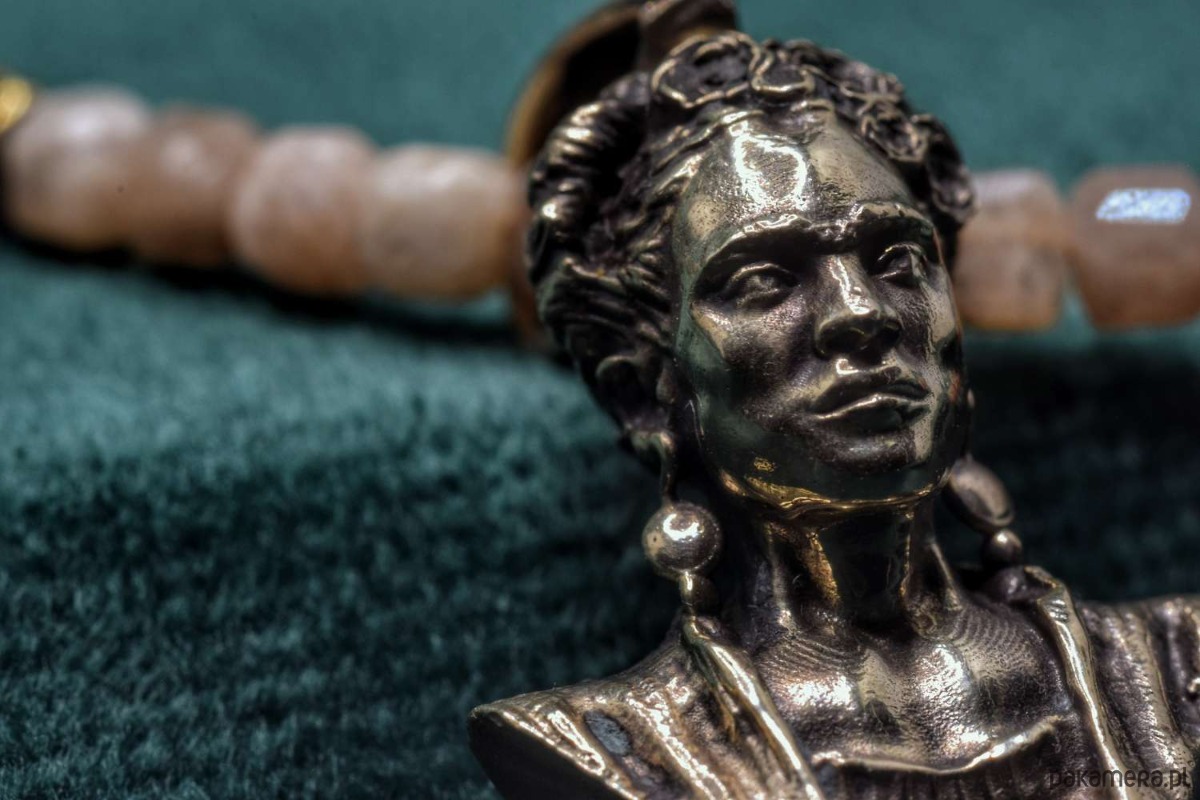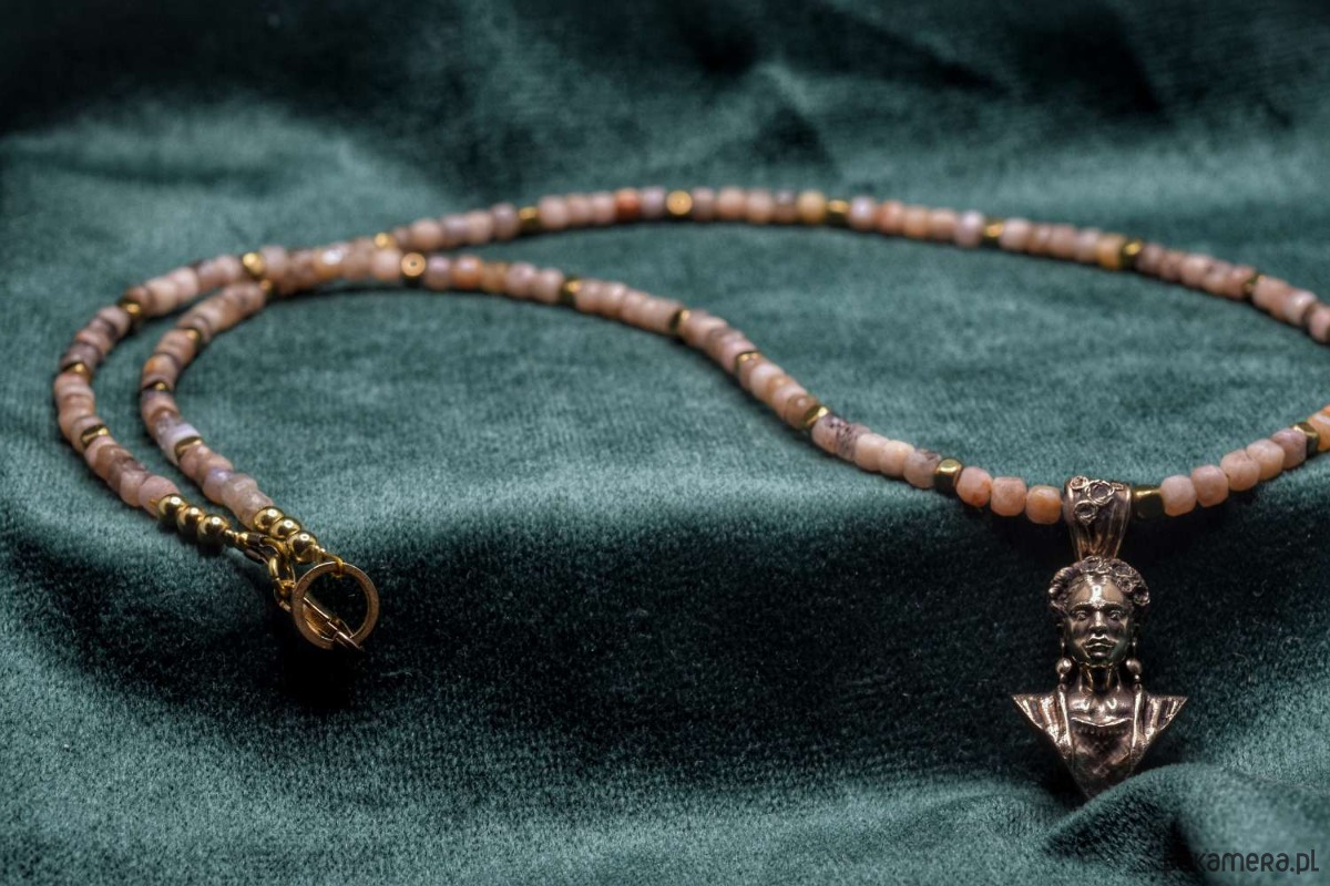 Naszyjnik z Fridą. Odlany z brązu. Na naturalnych kamieniach (hematyt oraz kamień słoneczny)