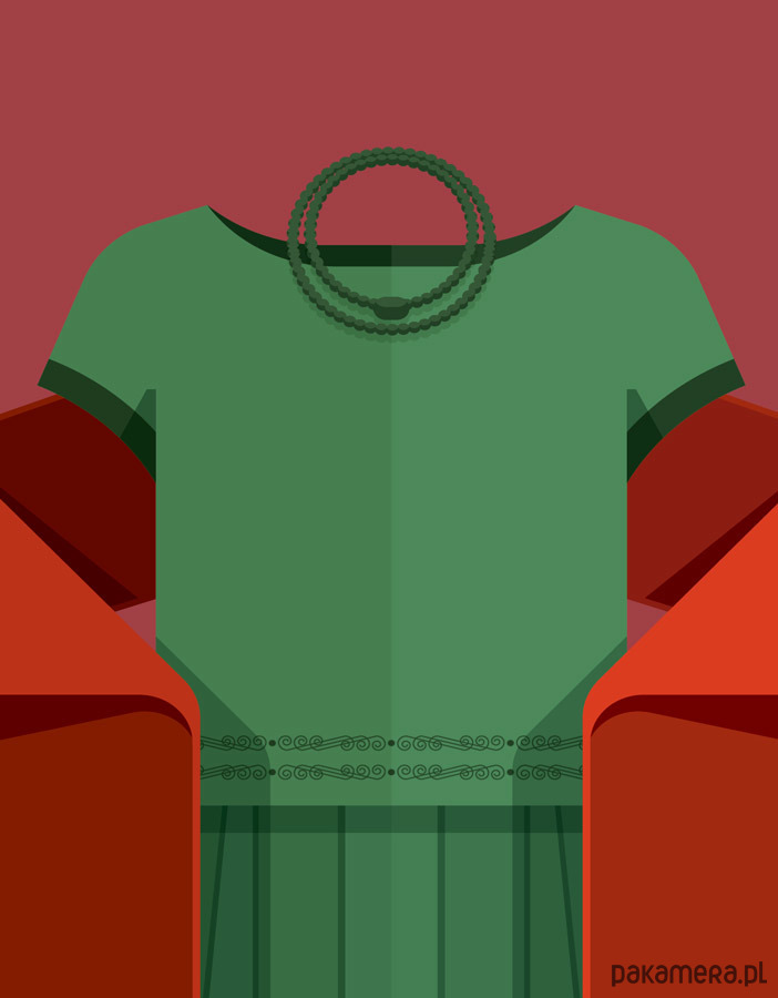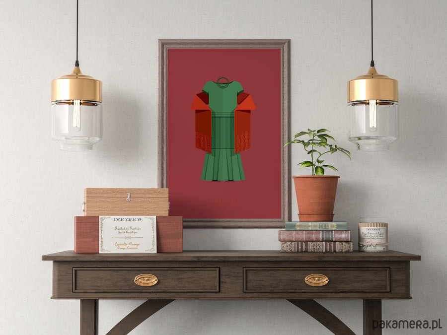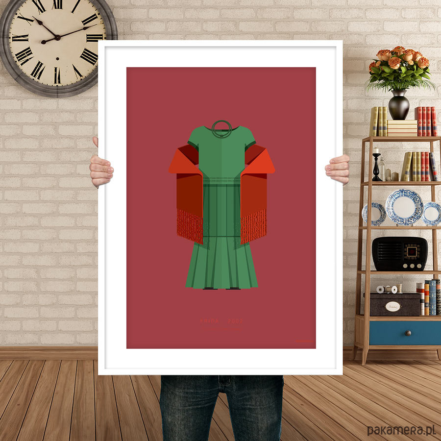 Plakat z autorską grafiką inspirowany filmem "Frida", reż. Julie Taymor. Pochodzi z serii "Cinema Costumes" (Kostiumy kinowe) i przedstawia strój Fridy Kahlo.