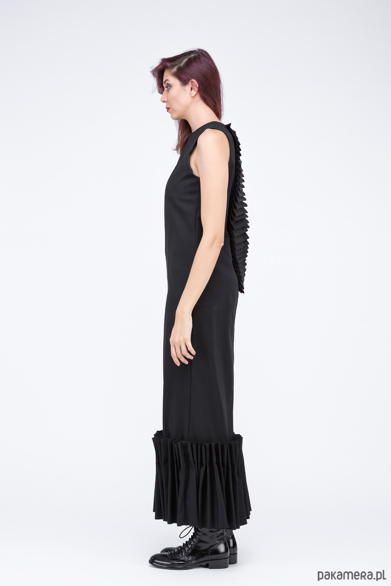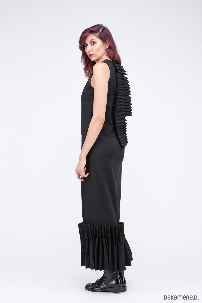 elegancka sukiena z kolekcji "Times up", uszyta z eleganckiej bawełny z nylonem i elastanem, u dołu falbana składana, z tyłu asymetryczny żabot, długość pęknięcia na tylnym szwie do spięcia i/lub ewentualnej modyfikacji,