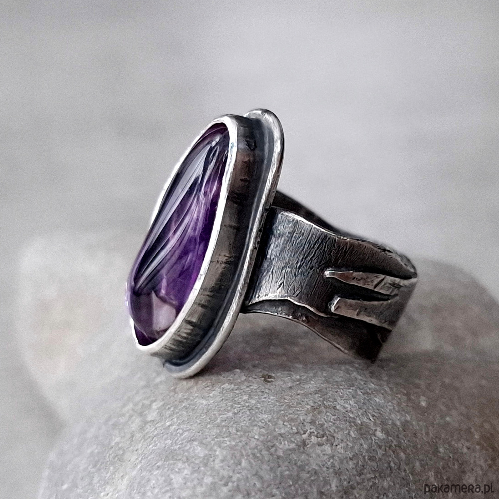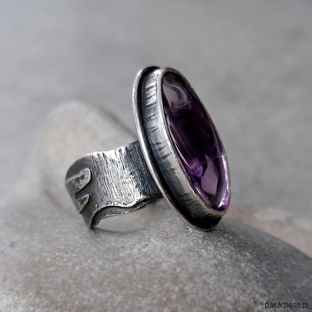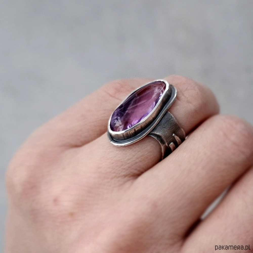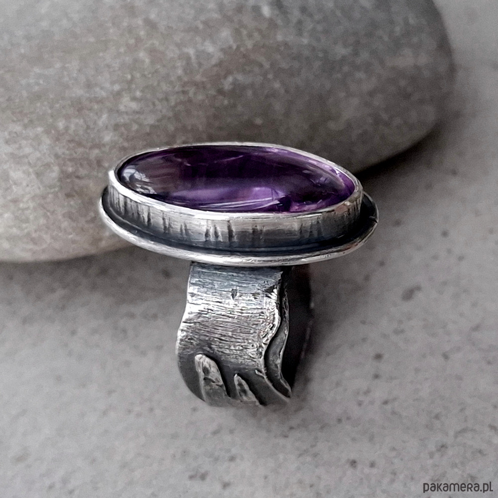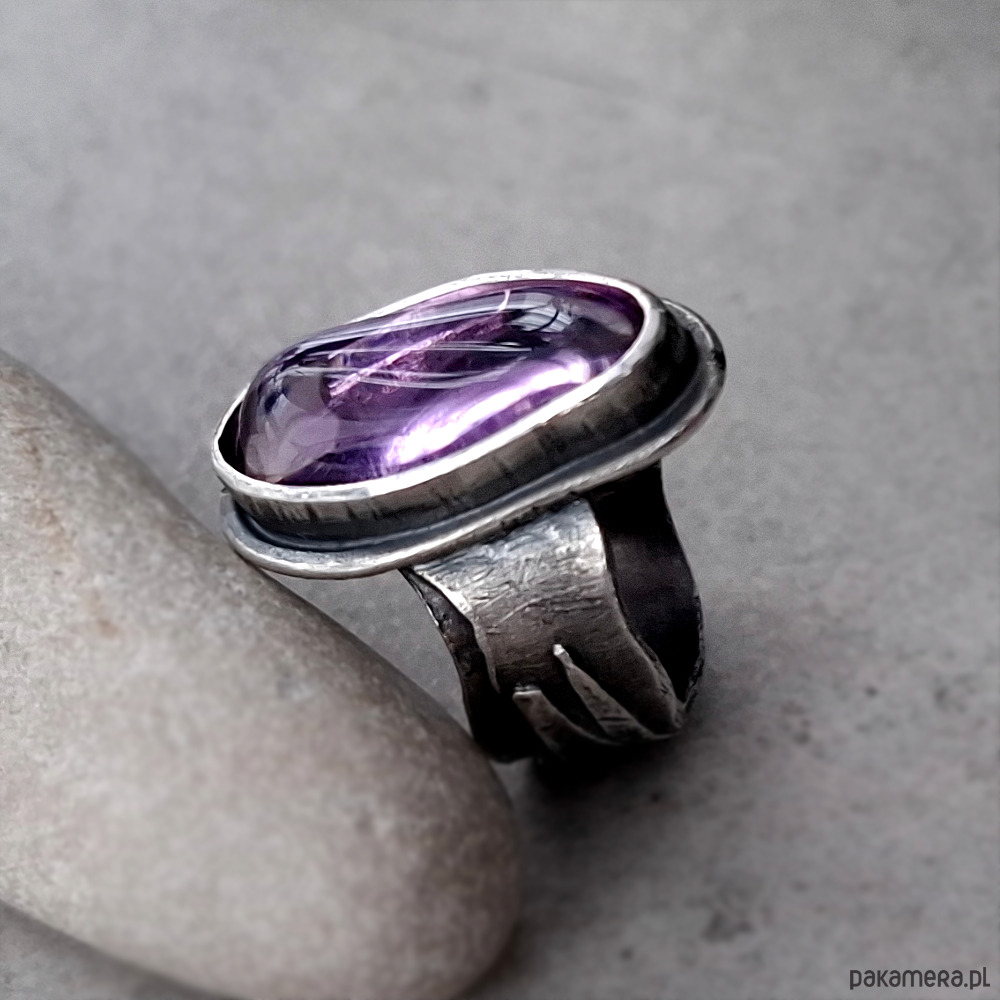 Okazały, fantazyjny, baśniowy, srebrny pierścień ozdobiony ametrynem. Pierścień w formie szerokiej wstęgi oplatającej cały palec dostosowuje się do rozmiaru. Srebro postarzane, mocno zoksydowane. Całość wykonana ręcznie ze srebra 925 w jednym niepowtarzalnym egzemplarzu. Szerokość ozdobnej obrączki w najszerszym miejscu: ok 9 mm, rozmiar korony pierścionka ok 12x24 mm. Rozmiar obrączki regulowany. Biżuteria zostanie ozdobnie zapakowana.
