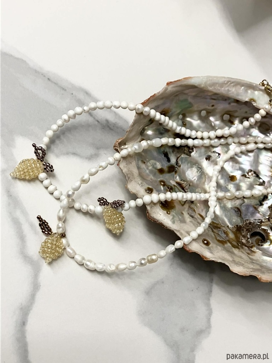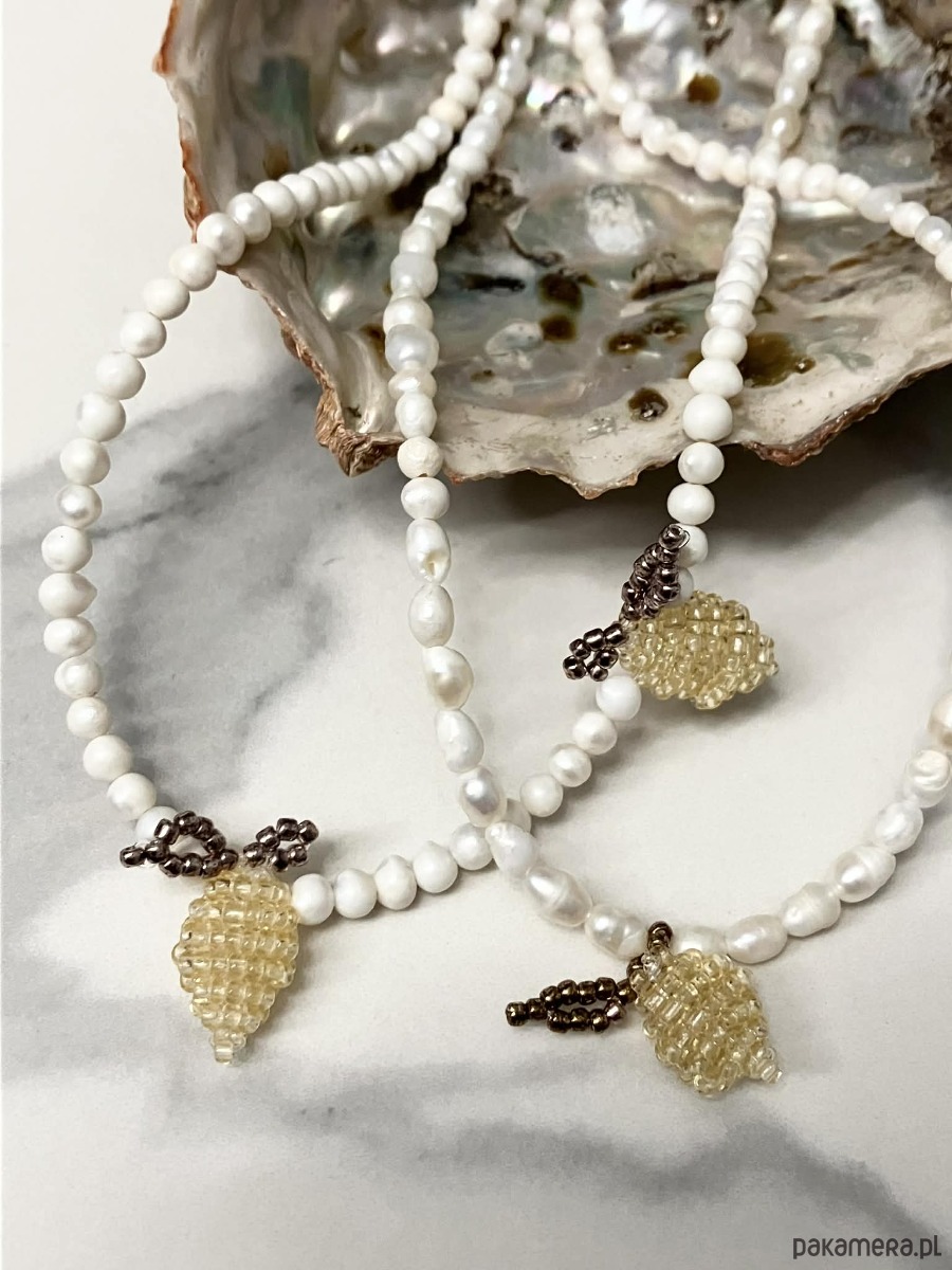Delikatny unikatowy, wykonany z pięknych Naturalnych Pereł Słodkowodnych w kolorze milky oraz japońskich koralików TOHO w kolorze transparentym stonowanym złotym z listkami w kolorze przepalony brąz