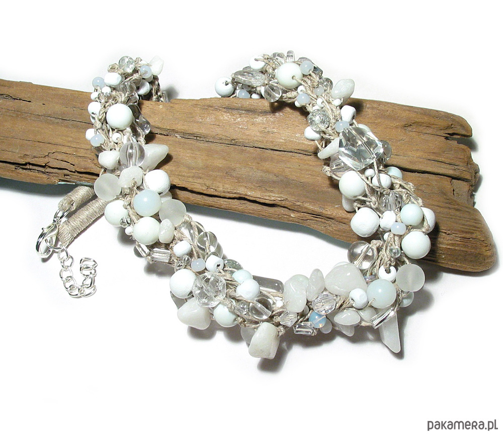 Subtelny lniany naszyjnik, w stonowanej eleganckiej gamie śnieżno białych bieli (drewno) połączonych z transparentnym szkłem, lodowym kwarcem i kryształem górskim. Naszyjnik o długości ok. 50 cm + dodatkowa regulacja zapięcia.