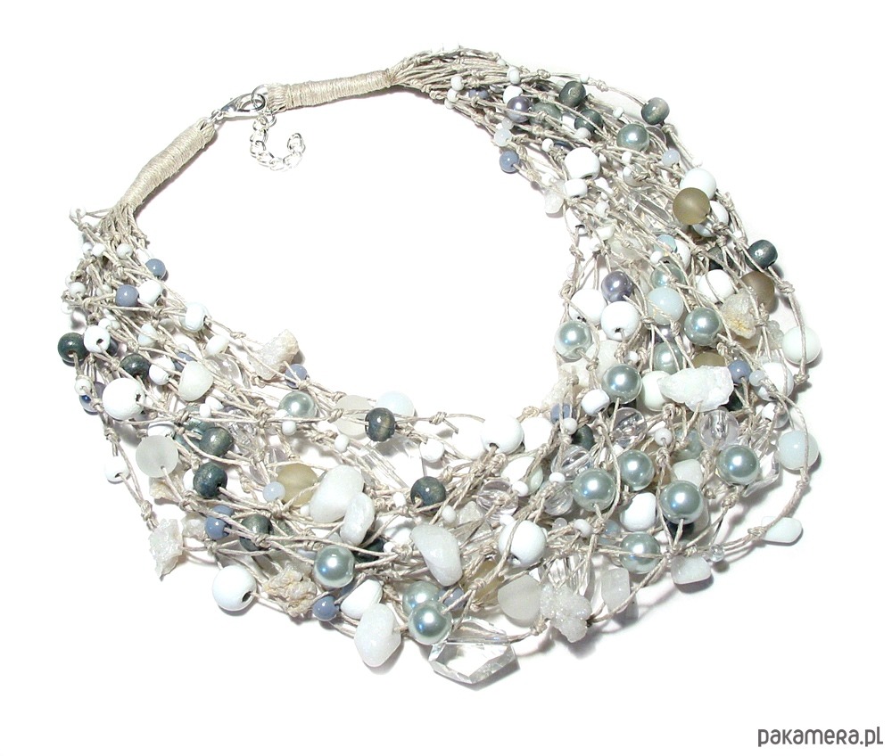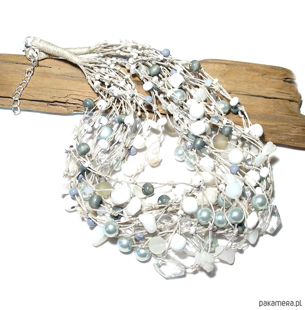 Lniany naszyjnik wykonany na naturalnej polskiej przędzy z elementów w kolorze bieli, transparentnego szkła z dodatkiem szarości..