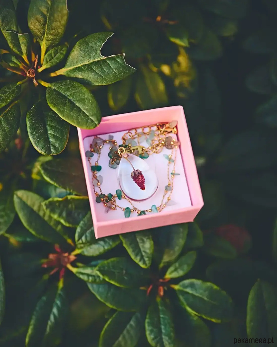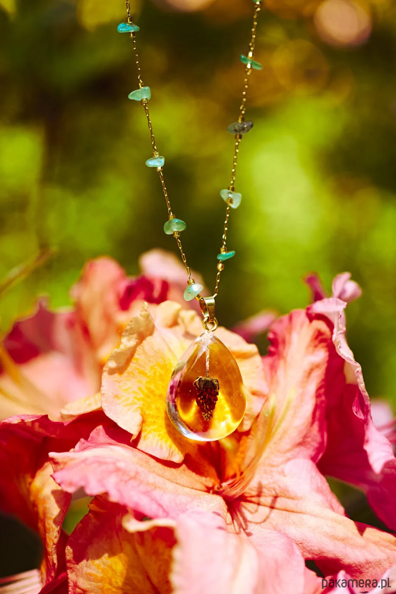 Przedstawiam naszyjnik z poziomką zamkniętą w przezroczystej żywicy, który stanowi wyjątkowy element każdej kolekcji biżuterii. Ten unikalny naszyjnik ma długość 42 cm z dodatkową regulacją 5 cm, co pozwala na idealne dopasowanie. Łańcuszek wykonany jest ze złotej stali nierdzewnej, a ozdobne zielone kamienie to awenturyn, znany ze swoich właściwości przynoszących szczęście i pozytywną energię.