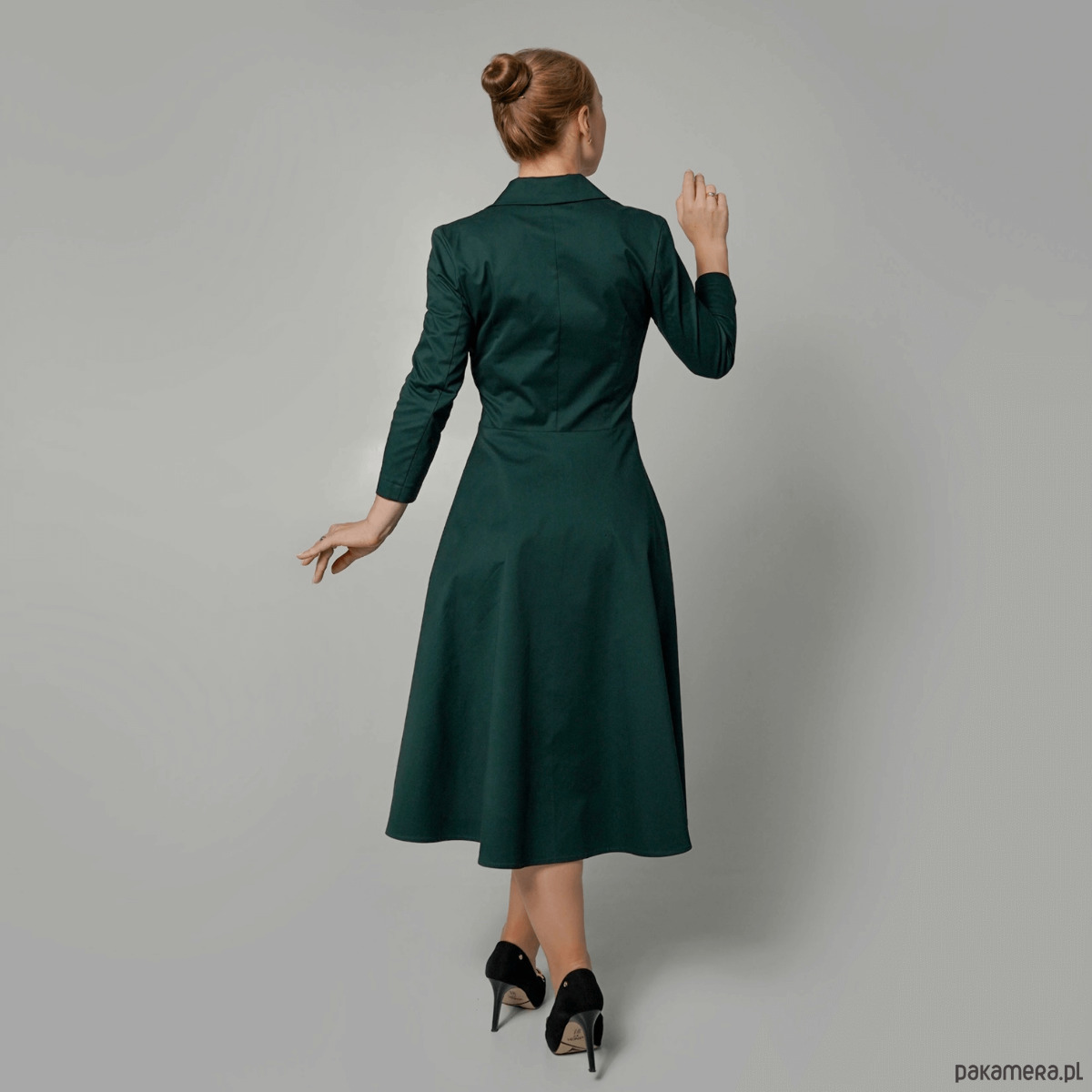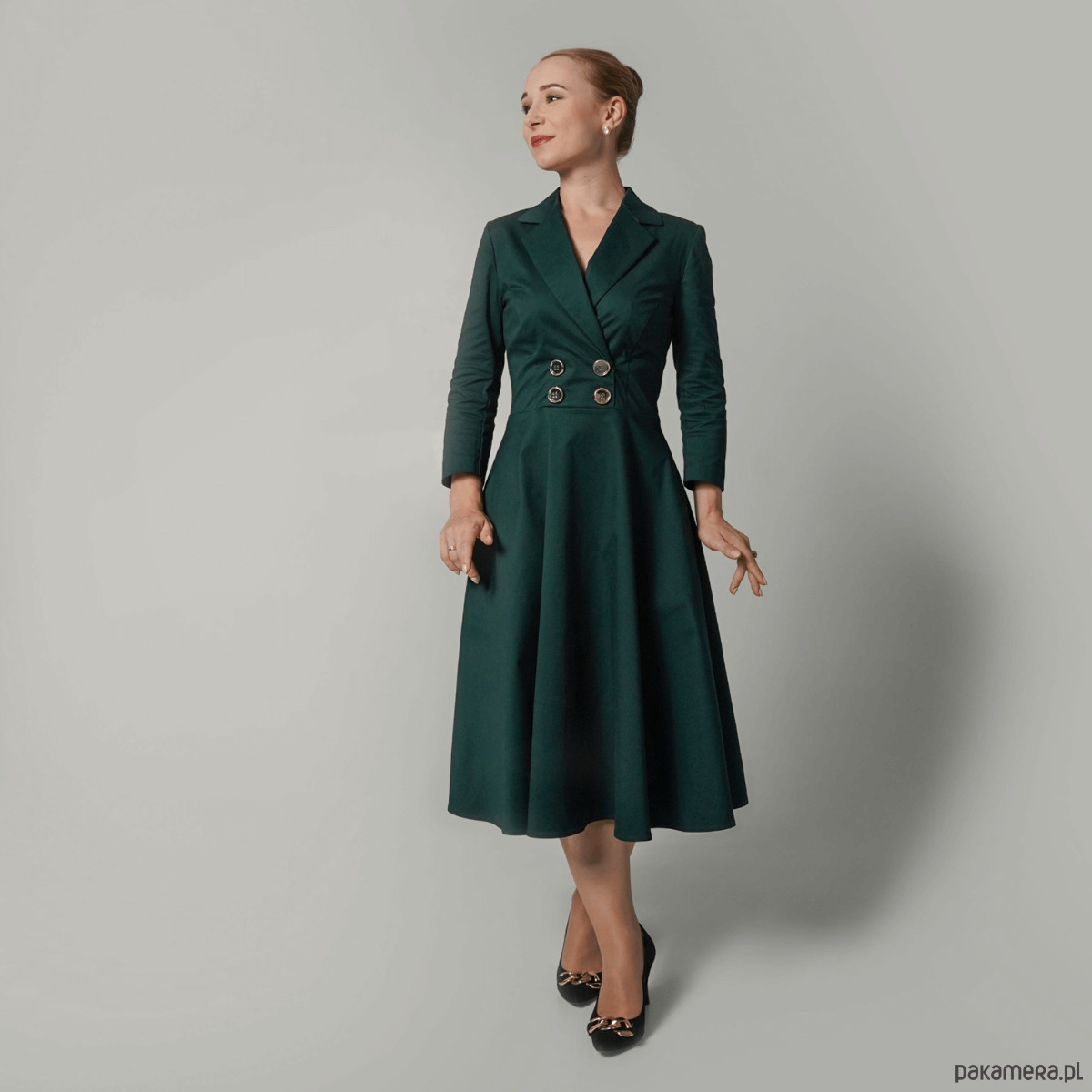 Elegancka sukienka marynarkowa dwurzędowa rozkloszowana butelkowa zieleń