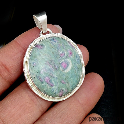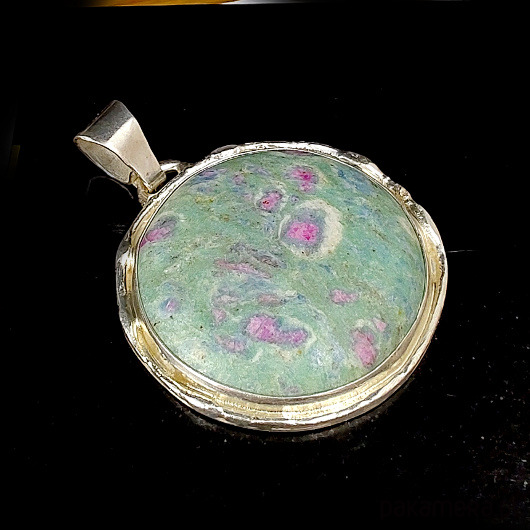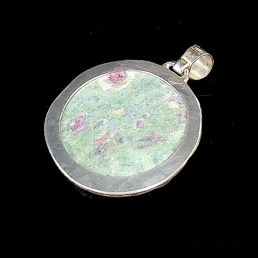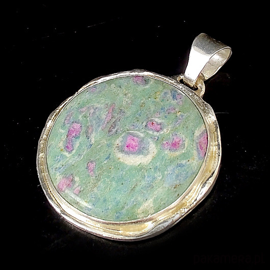 Okazały wisior z oprawionym w srebro próby 925 naturalnym fuchsytem z wrostami rubinów. Przepiękny malowniczy okaz. Wymiary oprawy 35 mm.Z krawatką długość 45 mm.Waga 17 g. Wisior zapakowany zostanie w ozdobne pudełeczko.