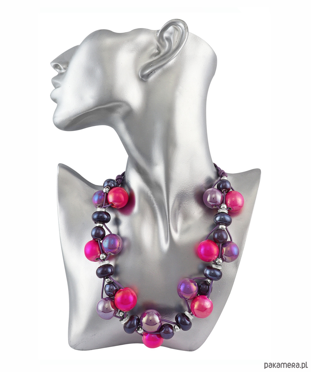 Naszyjnik w kolorze fioletu i fuksji. Wykonany z korali ceramicznych ( kula 12 mm-18 mm), naturalnego rzemienia oraz elementów ozdobnych metalowych w kolorze srebra. Długość naszyjnika ok. 55 cm + 3 cm łańcuszek do regulacji. Istnieje możliwość wykonania naszyjnika w innych rozmiarach oraz fasonach, prosimy o kontakt. Naszyjnik zapakowany w opakowanie prezentowe.