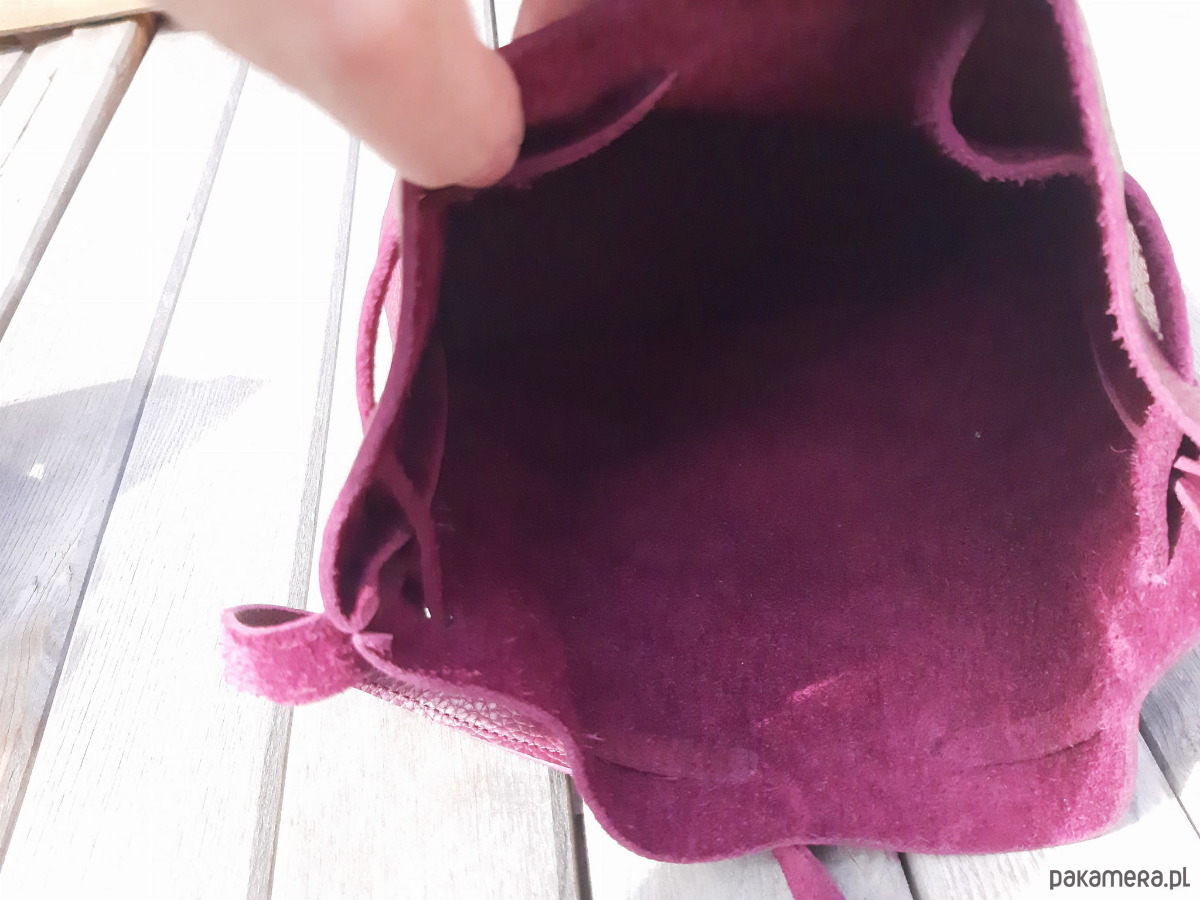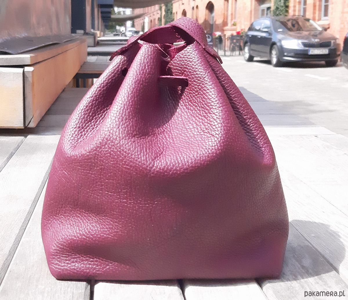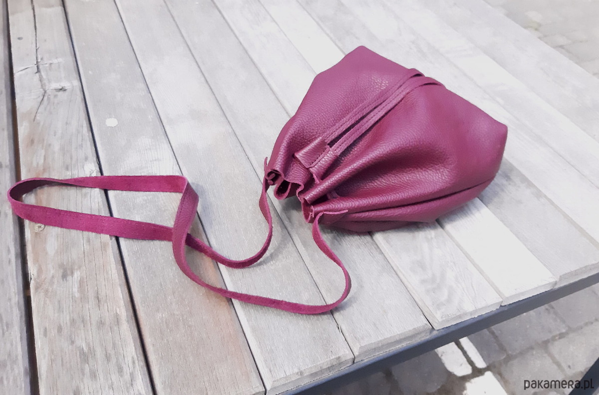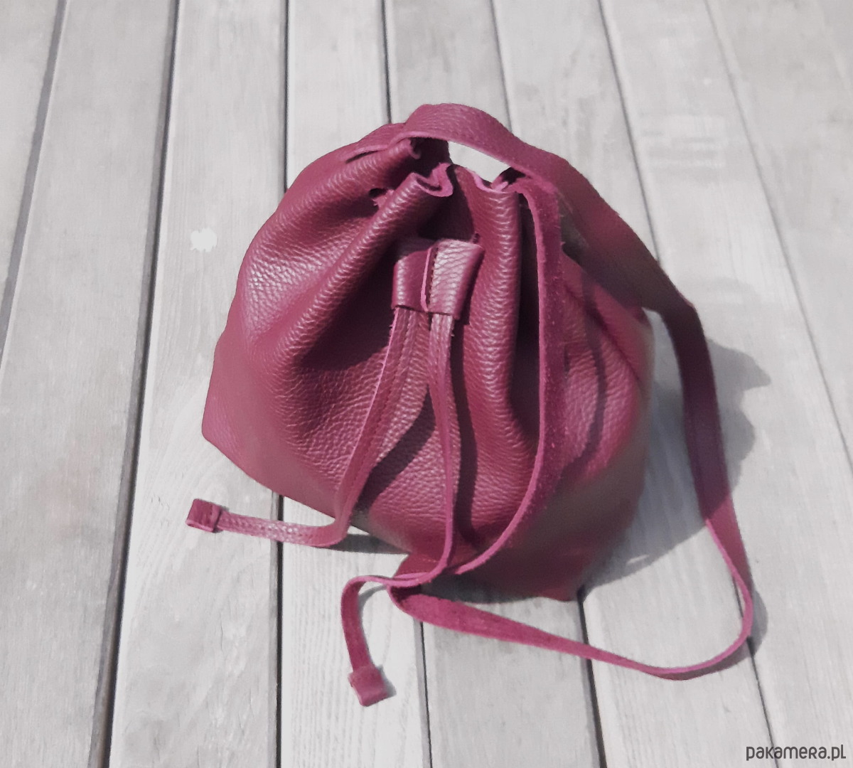 Mała torebka typu bucket bag ściągana na troczki. Uszyta z naturalnej miękkiej skóry. Kolor głęboka ciemna fuksja. Wewnątrz surowa skóra. Pasek dł. 95 cm nie regulowany.