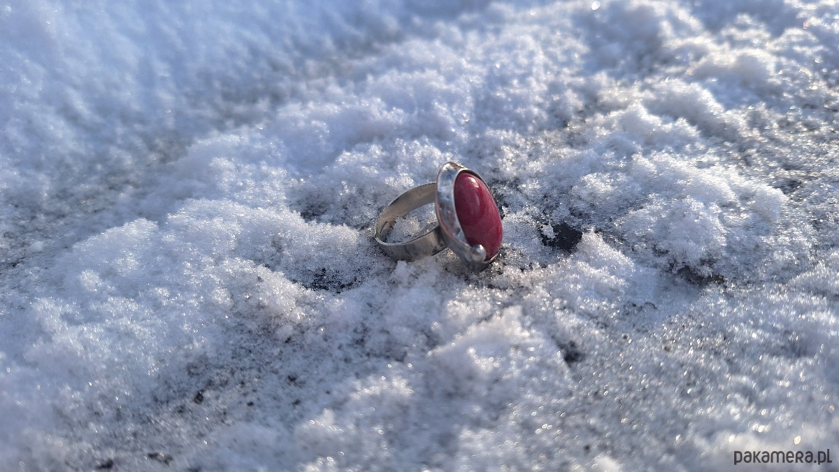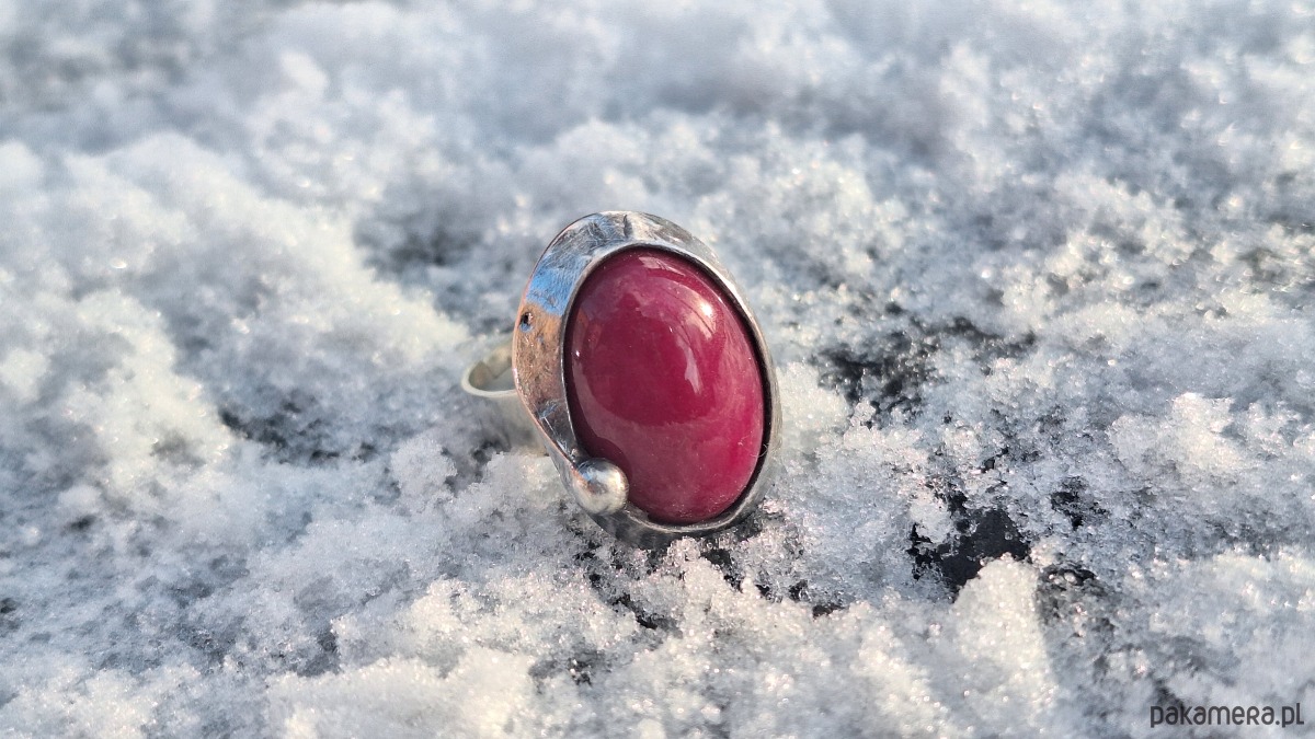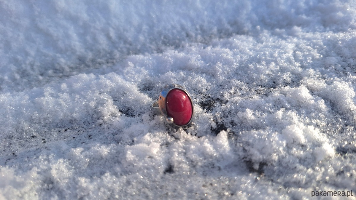 Pierścionek wykonany z miedzi, cyny i jadeitu. Wymiary ok. 2 na 1.5 cm. Regulowany. Nie jest ciężki.