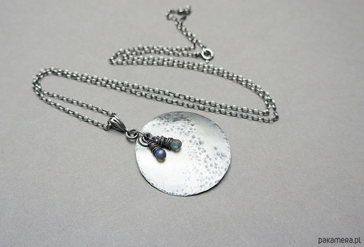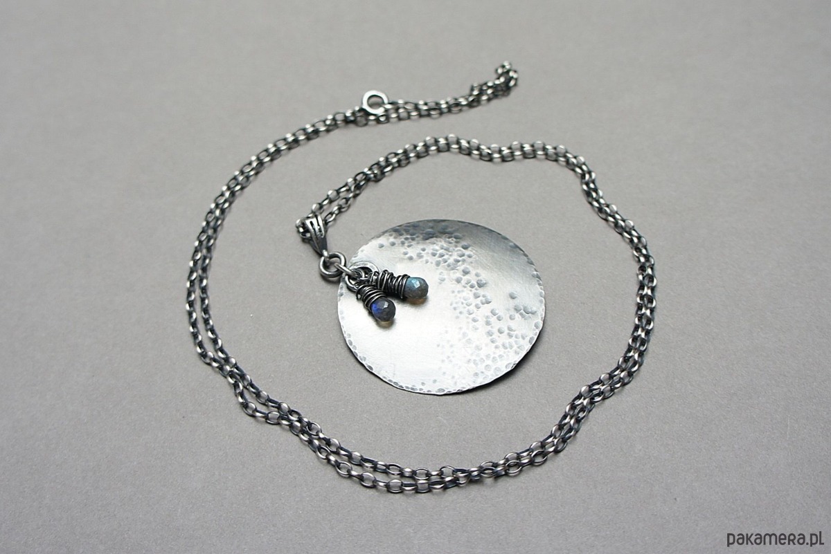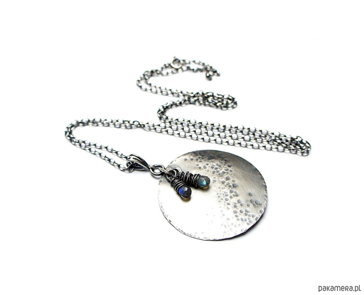 Naszyjnik wykonany od podstaw ze srebra [pr. 925] w połączeniu z fasetowanymi kropelkami labradorytów [około 8mm]. Średnica srebrnej blaszki [40mm]. Srebro oksydowane i przetarte. Całkowita długość naszyjnika 70cm. Biżuteria ozdobnie zapakowana.