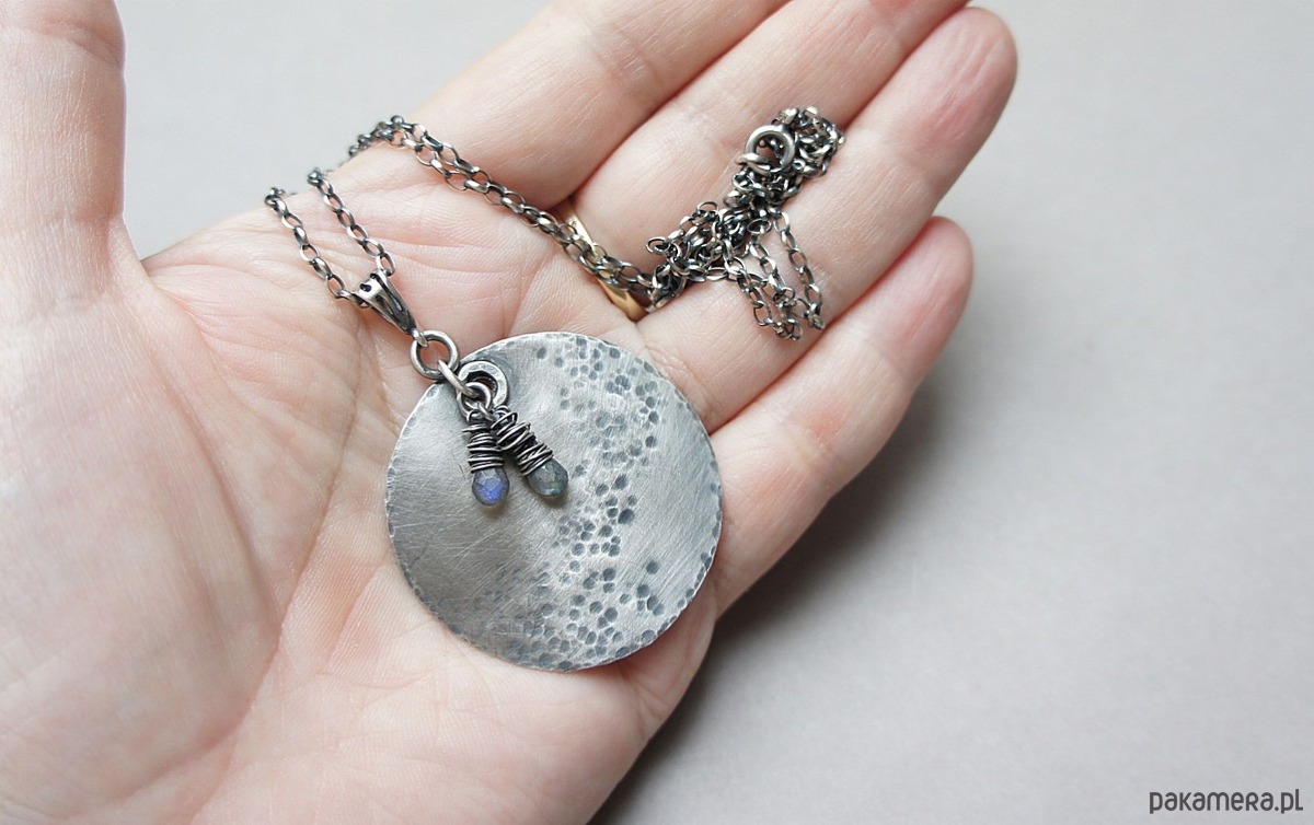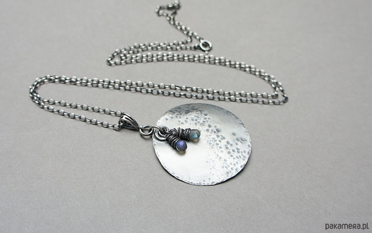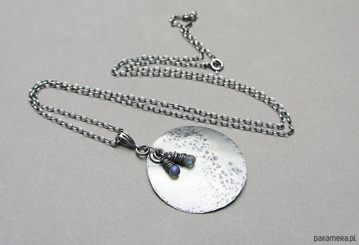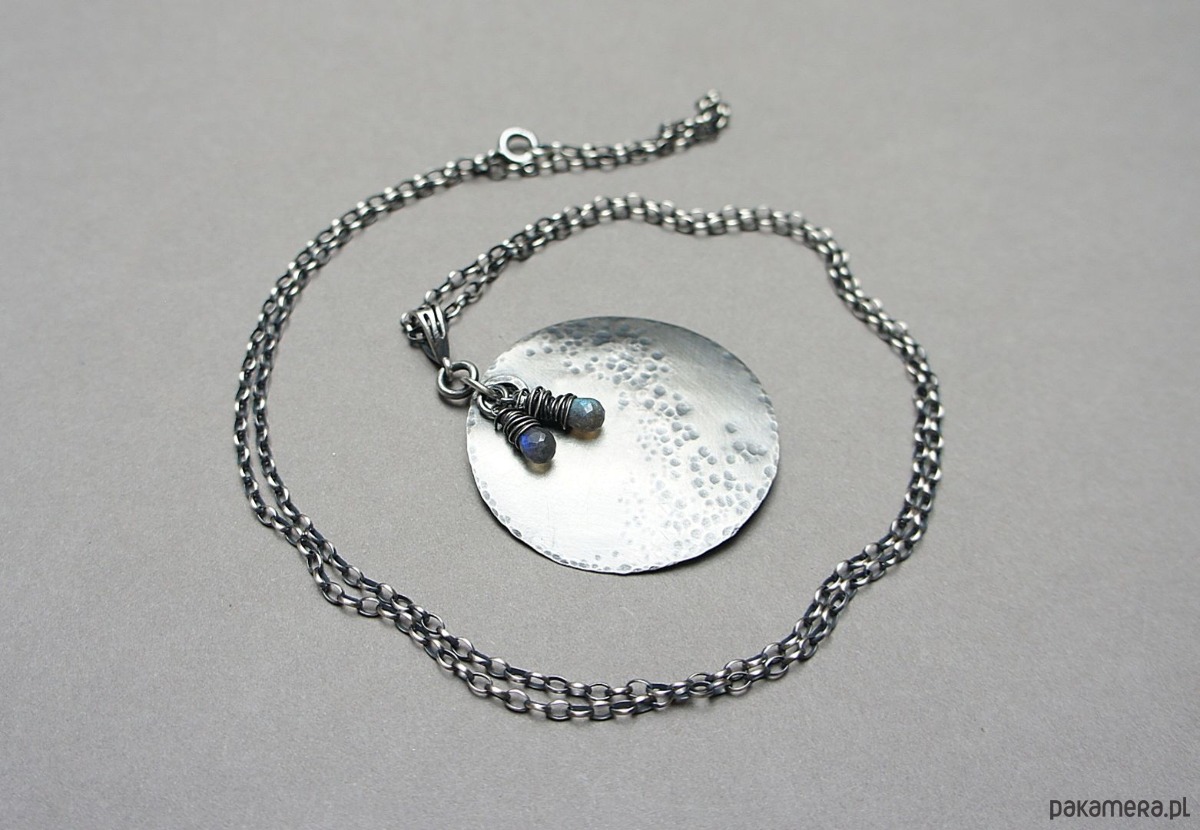 Naszyjnik wykonany od podstaw ze srebra [pr. 925] w połączeniu z fasetowanymi kropelkami labradorytów [około 8mm]. Średnica srebrnej blaszki [40mm]. Srebro oksydowane i przetarte. Całkowita długość naszyjnika 70cm. Biżuteria ozdobnie zapakowana.