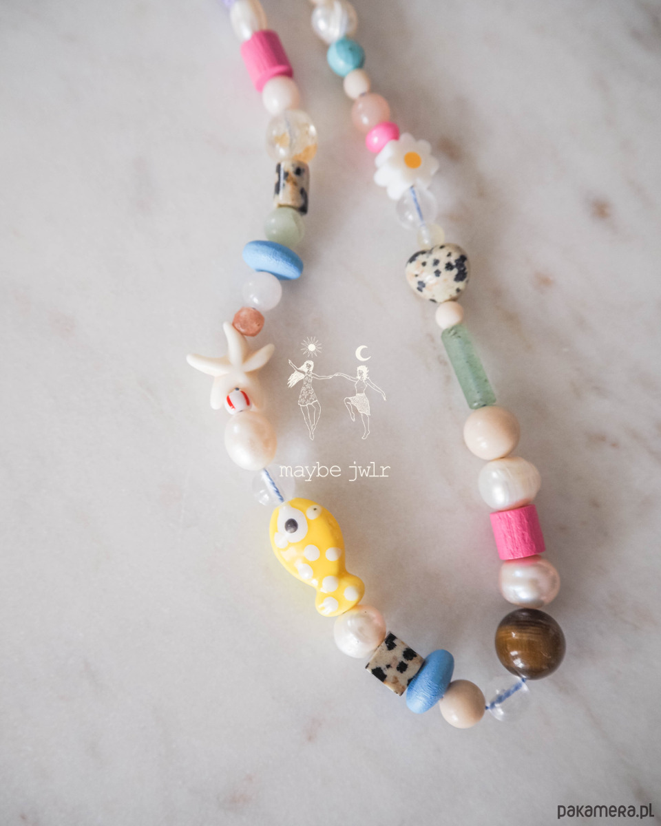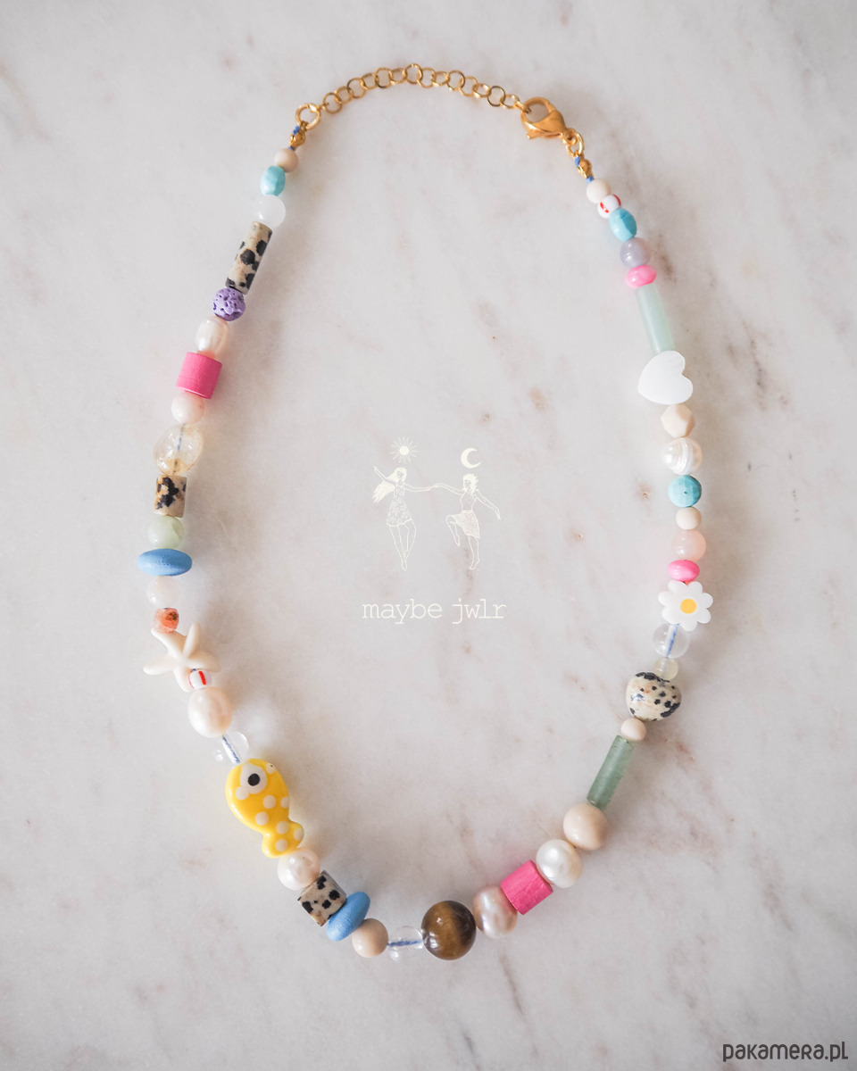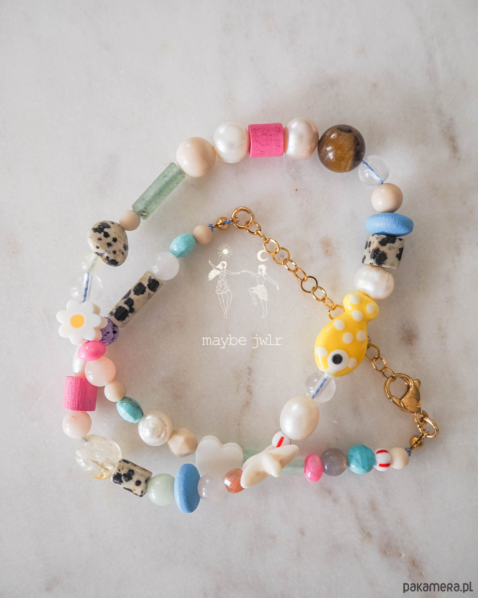 awenturyn zielony, koraliki lampwork, jadeity, jaspisy o wielu strukturach, perły, oko tygrysie, magnezyt, muszle, kamienie rzeczne, howlit, drewno i inne.
