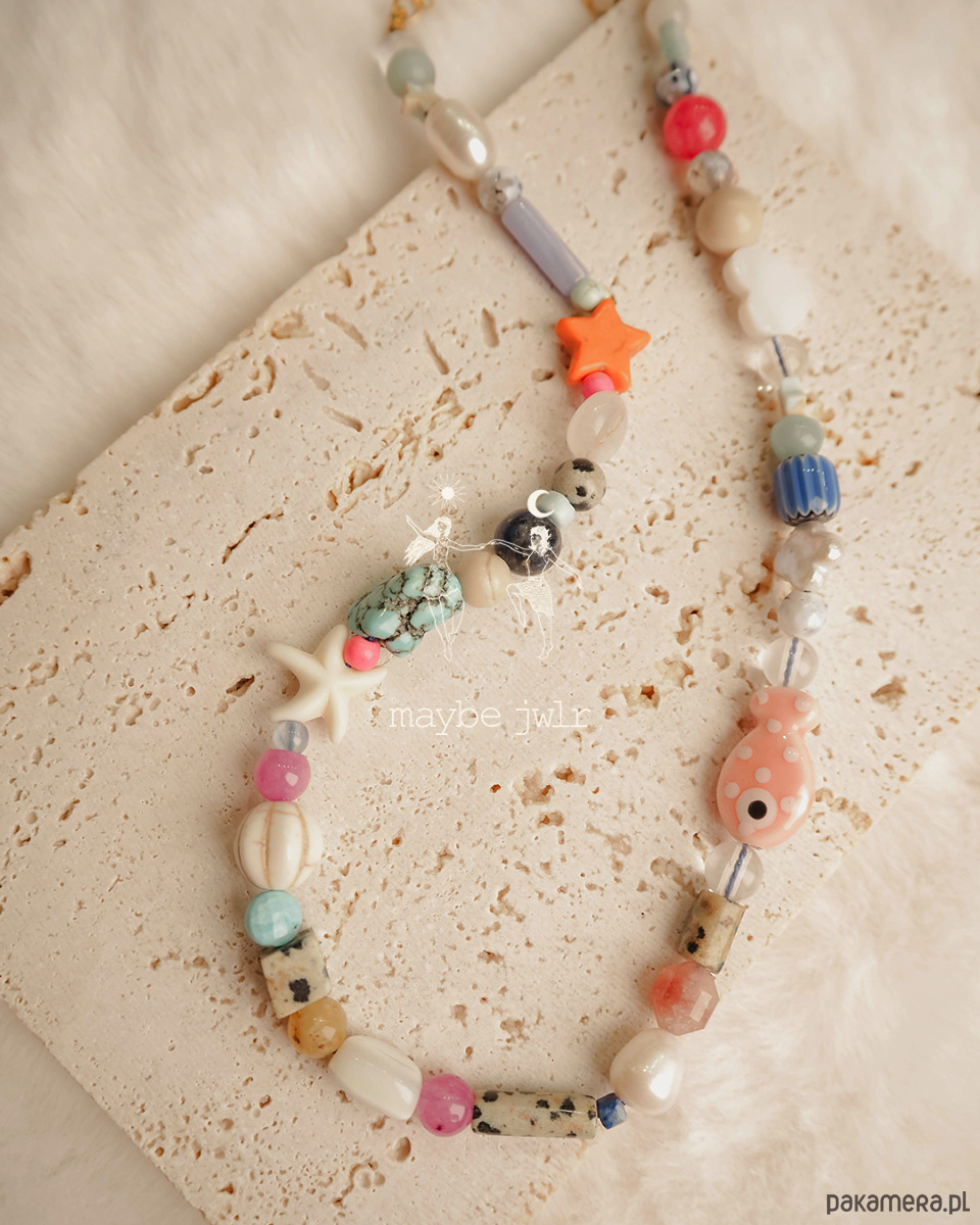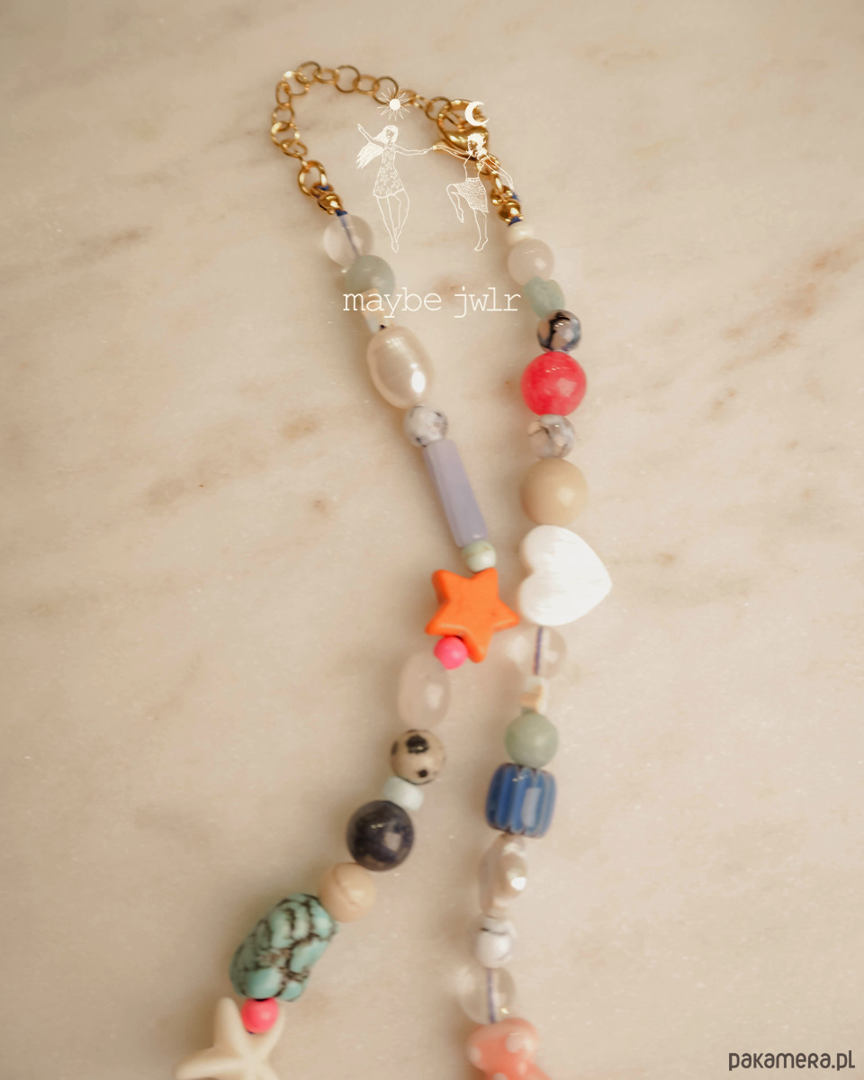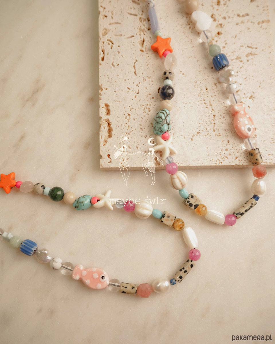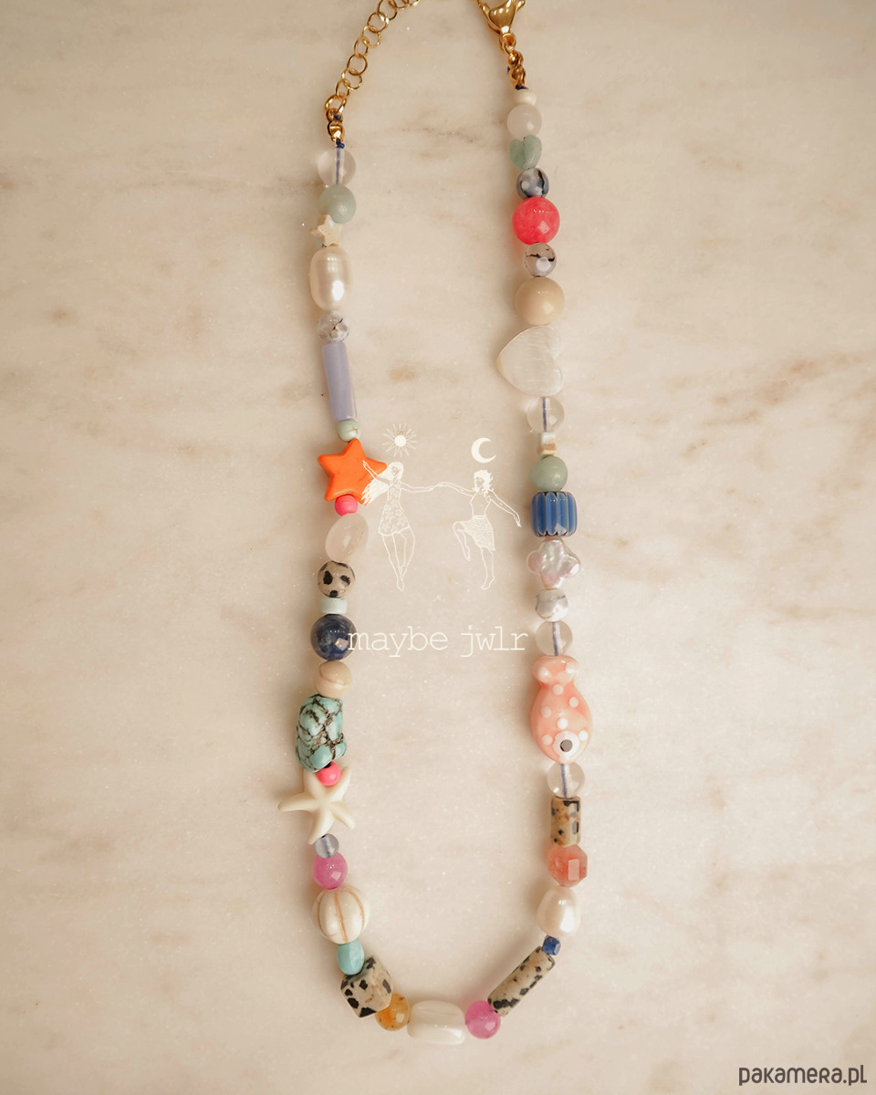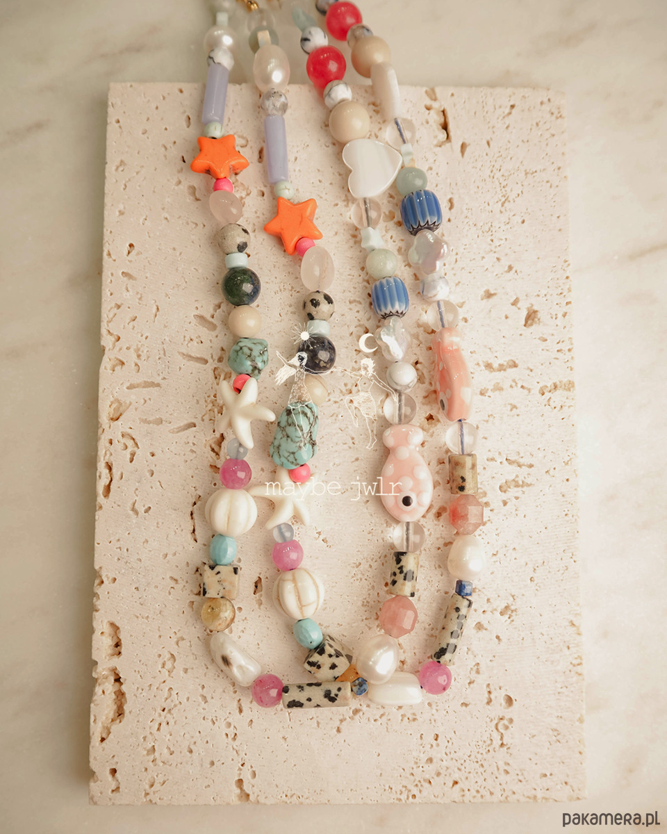 awenturyn zielony, koraliki lampwork, jadeity, jaspisy o wielu strukturach, perły, lapis lazuli, magnezyt, muszle, kamienie rzeczne, howlit i inne.