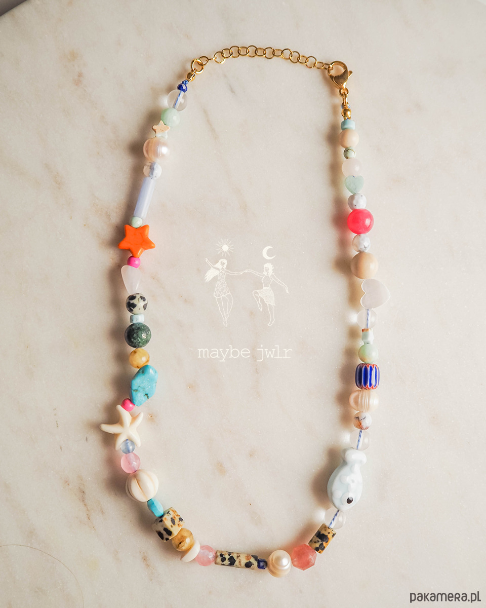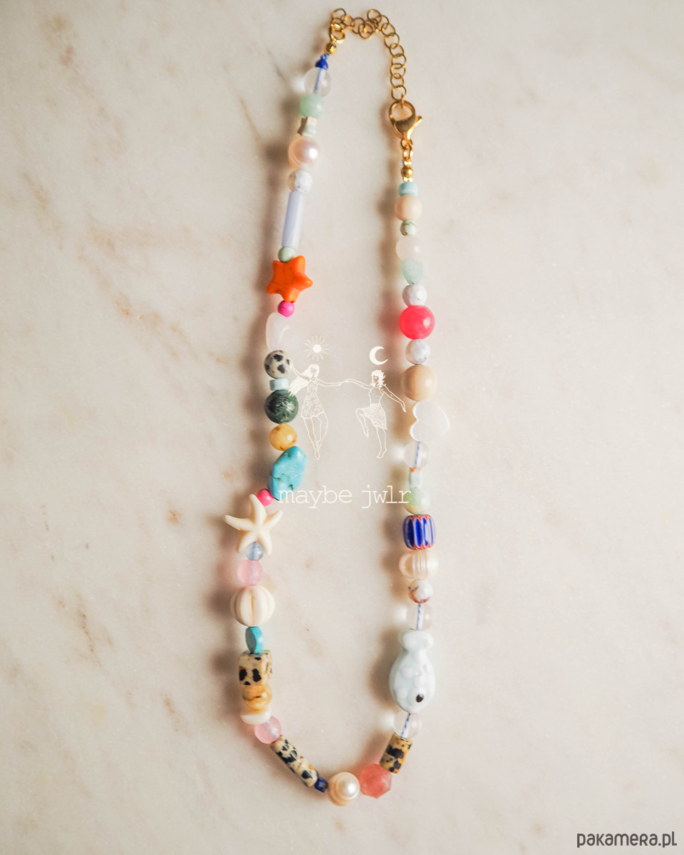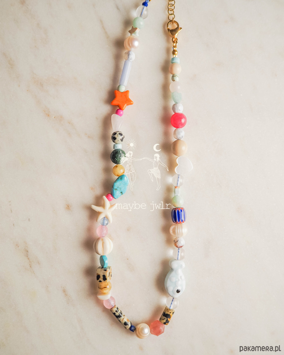 awenturyn zielony, koraliki lampwork, jadeity, jaspisy o wielu strukturach, perły, lapis lazuli, magnezyt, muszle, kamienie rzeczne, howlit i inne.