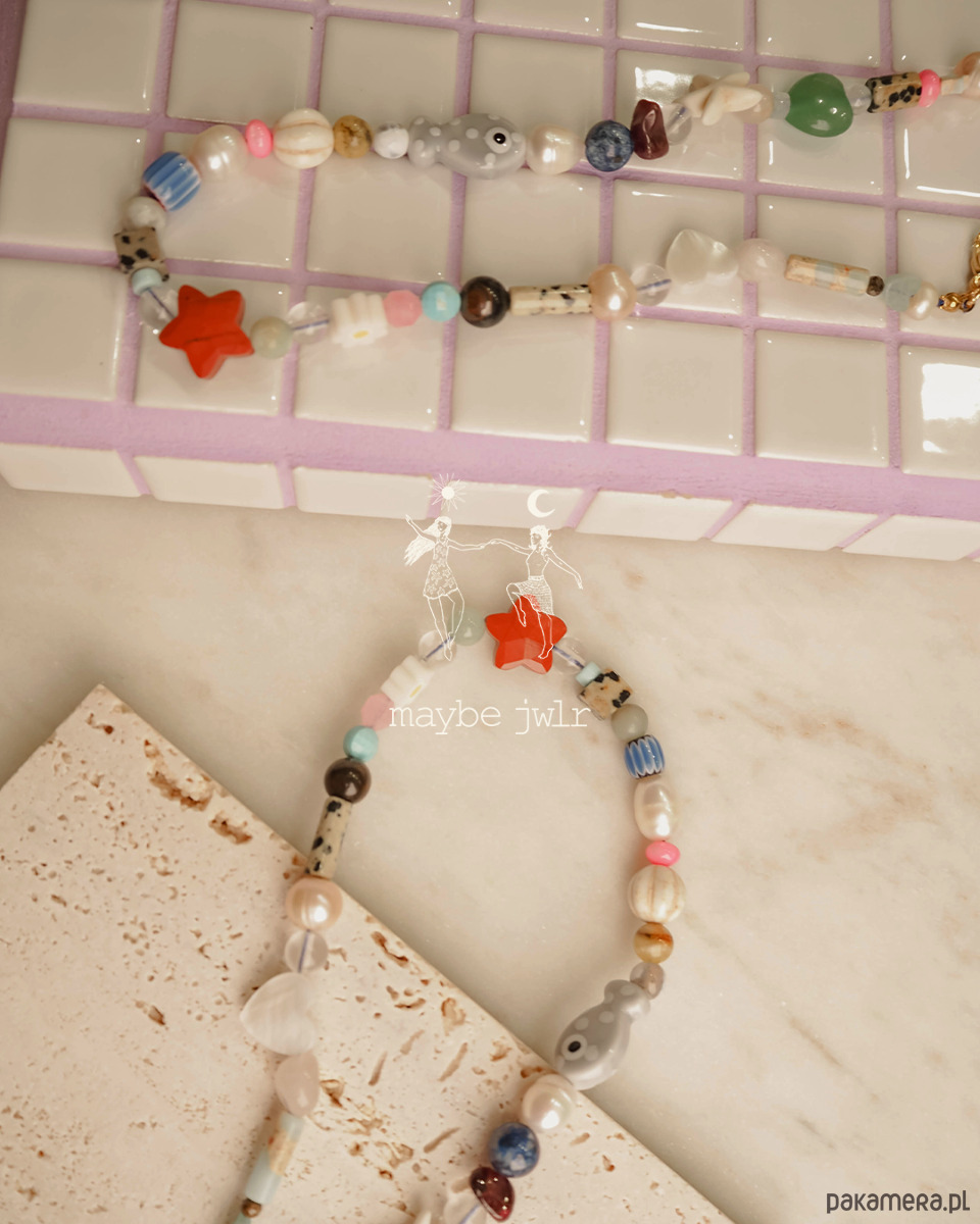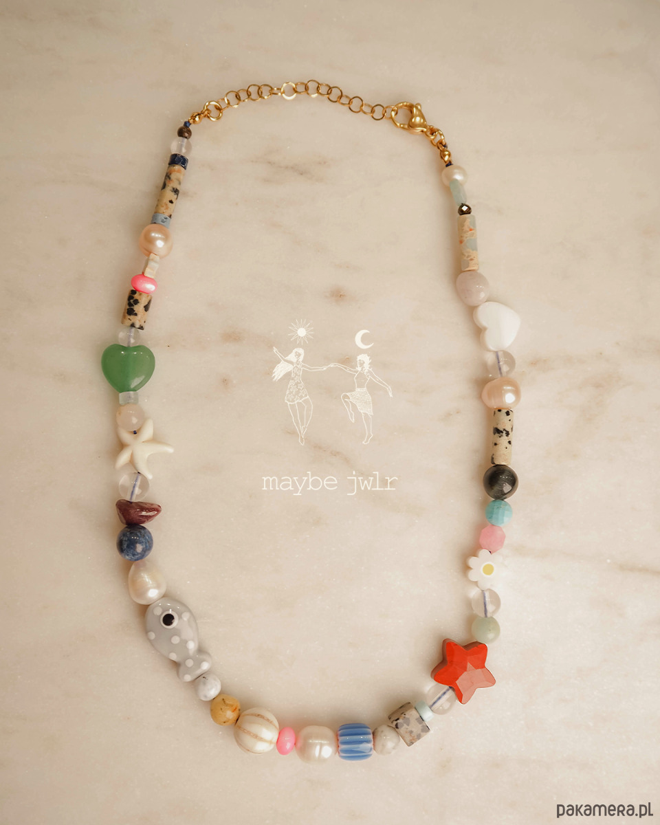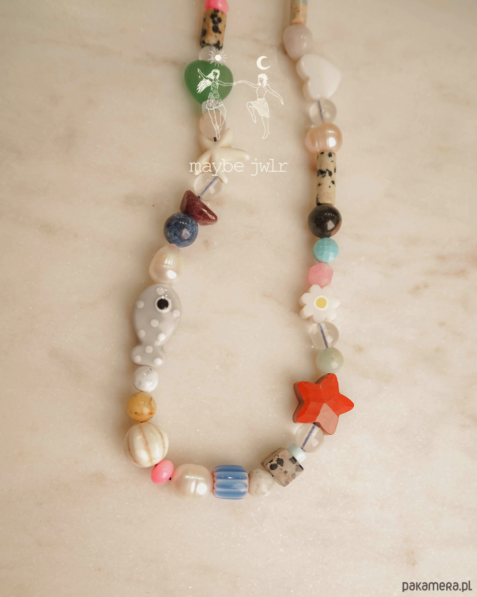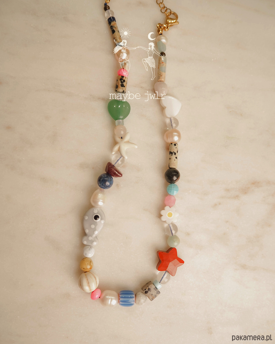 awenturyn zielony, koraliki lampwork, jadeity, jaspisy o wielu strukturach, perły, lapis lazuli, magnezyt, muszle, kamienie rzeczne, howlit i inne.