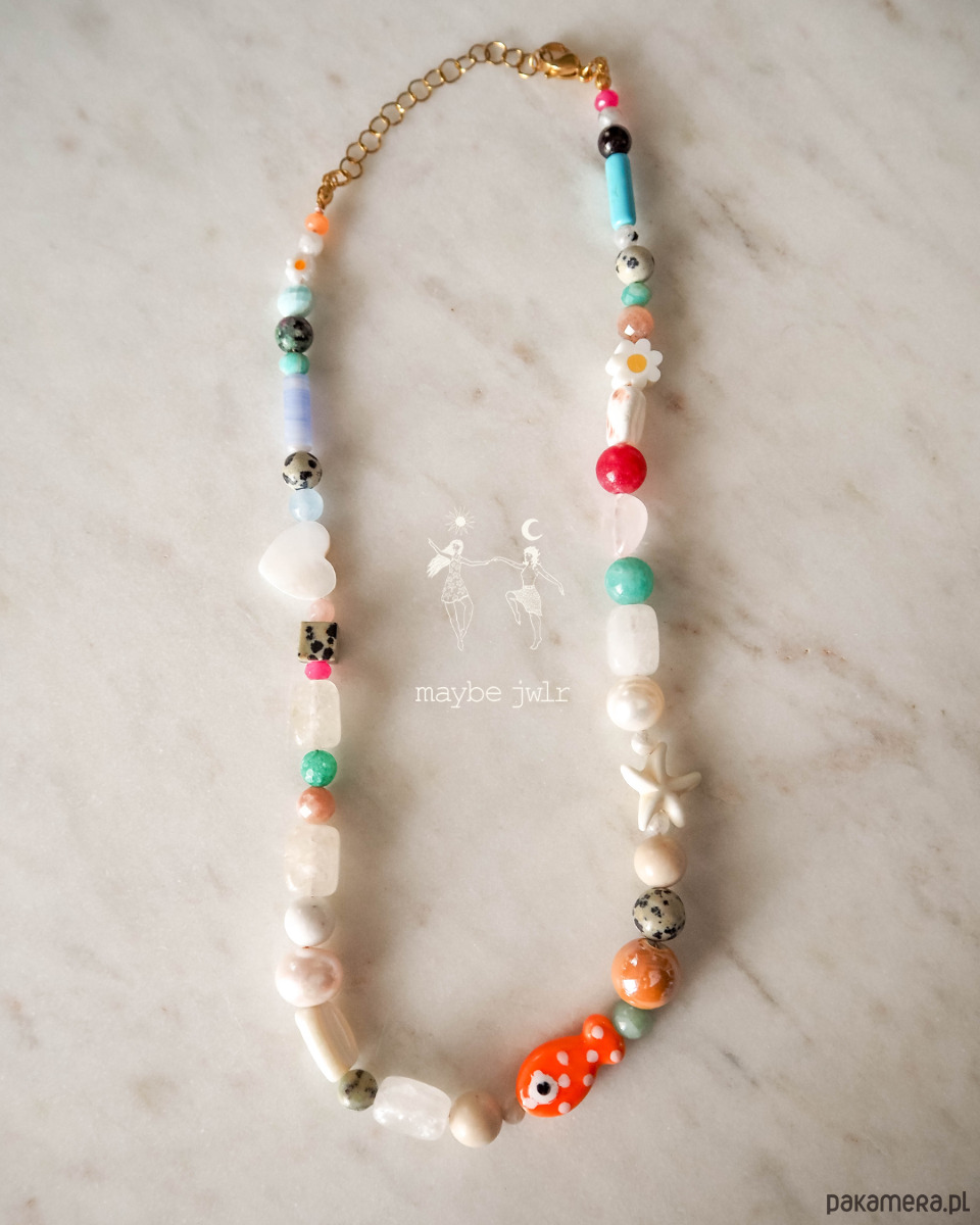Koraliki ceramiczne rybka, serduszko, słupki, kulki, są to szklane elementy, dlatego obchodź się z naszyjnikiem bardzo delikatnie.