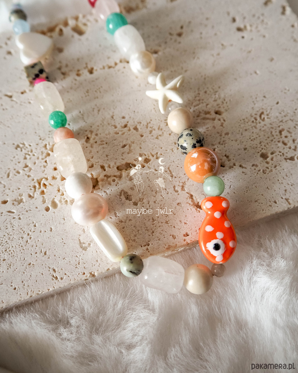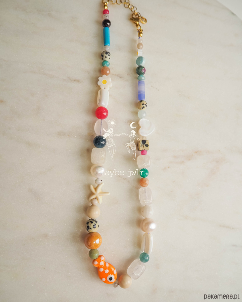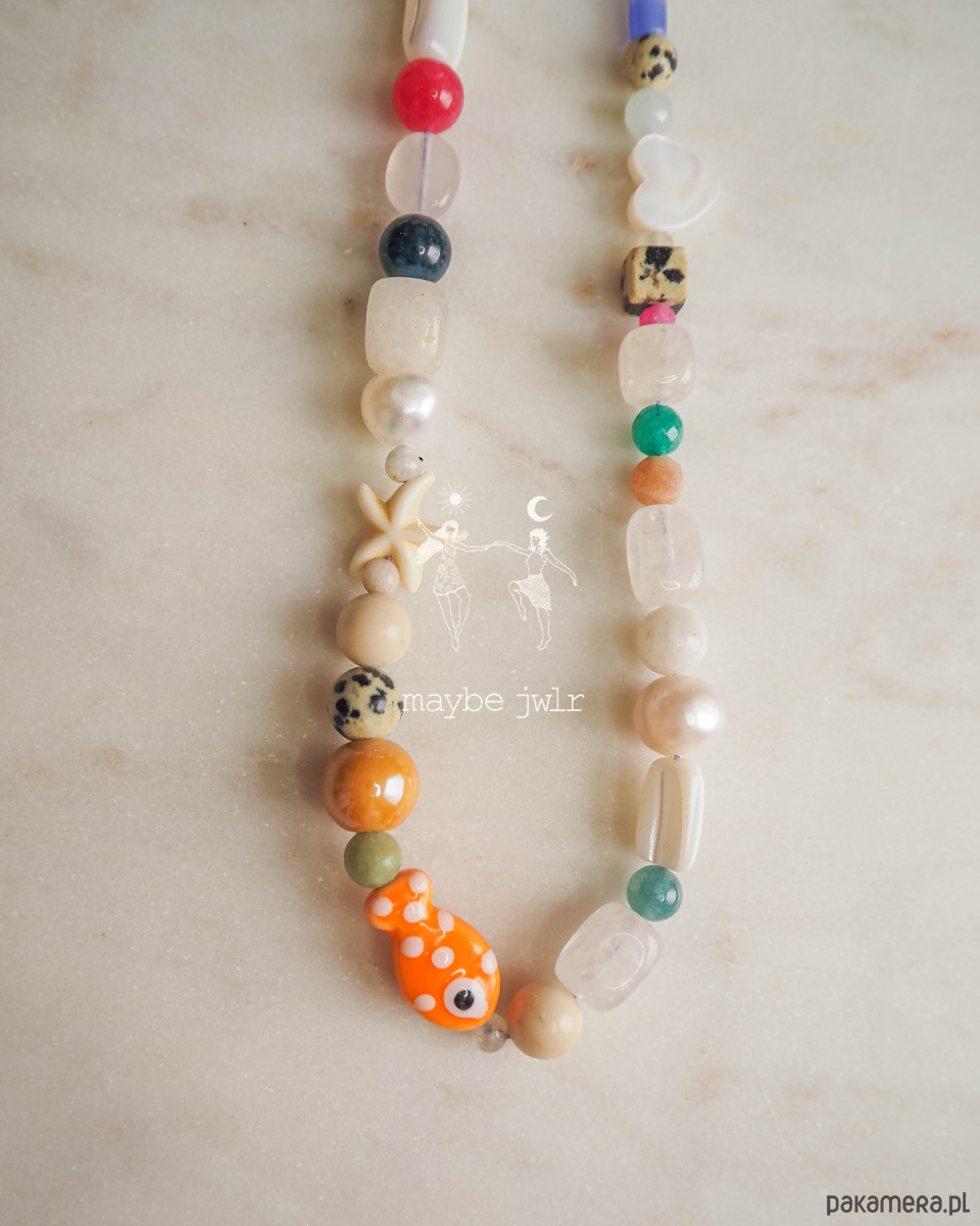 Koraliki ceramiczne rybka, serduszko, słupki, kulki, są to szklane elementy, dlatego obchodź się z naszyjnikiem bardzo delikatnie.