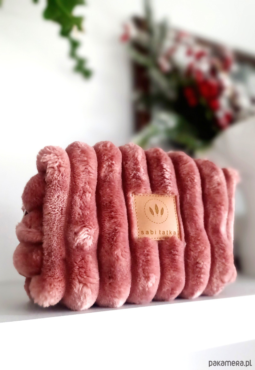 Średniej wielkości kosmetyczka z grubej futerkowej tkaniny.