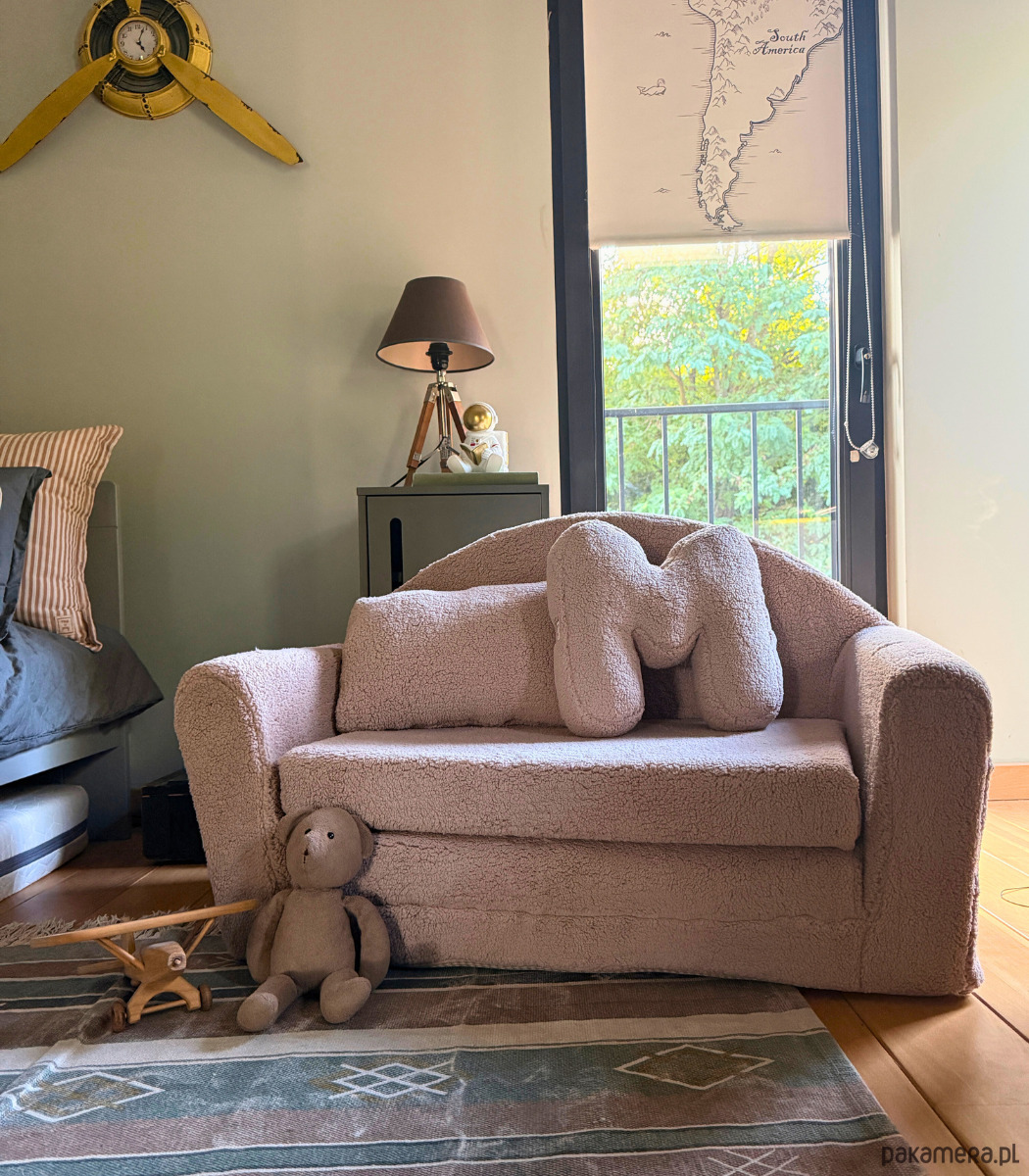 Mini sofa została wykonana z wysokiej jakości pianki, natomiast pokrycie futrzanej dzianiny. Z boku znajduje się kieszonka na drobiazgi, np. na pierwszą książeczkę. Szerokość sofy pozwala wygodnie usiąść dwójce dzieci a opcja rozłożenia sprawdzi się podczas zabawy czy popołudniowej drzemki.