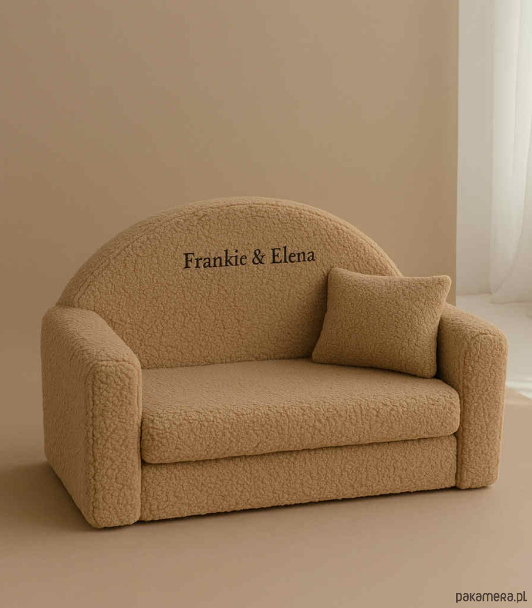 Futrzana rozkładana mini sofa z imieniem beżowa