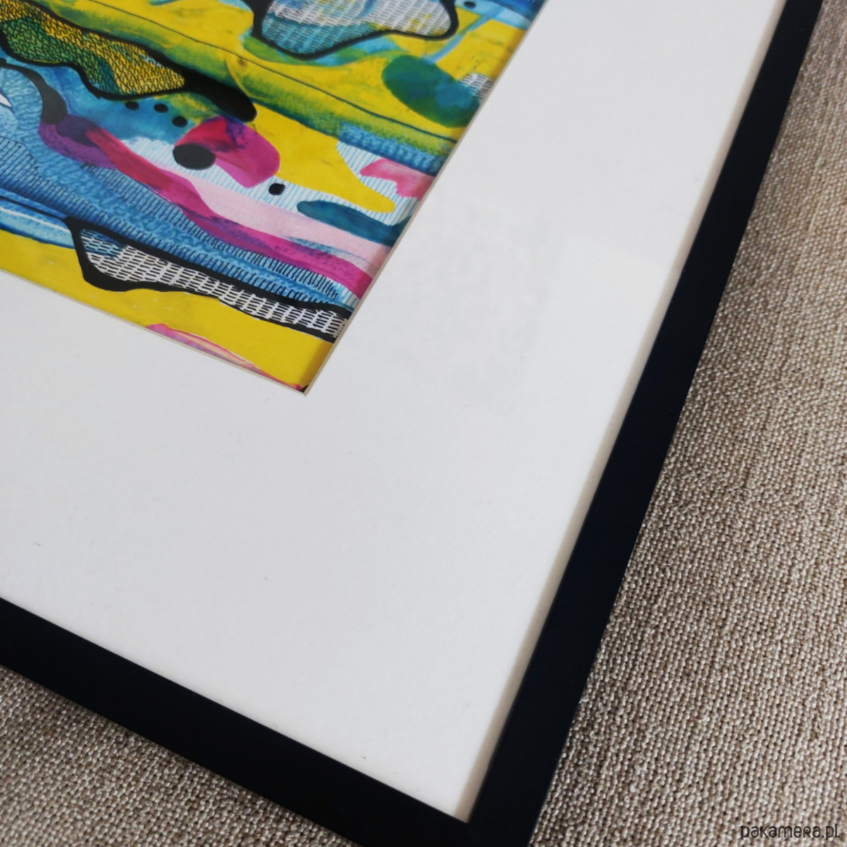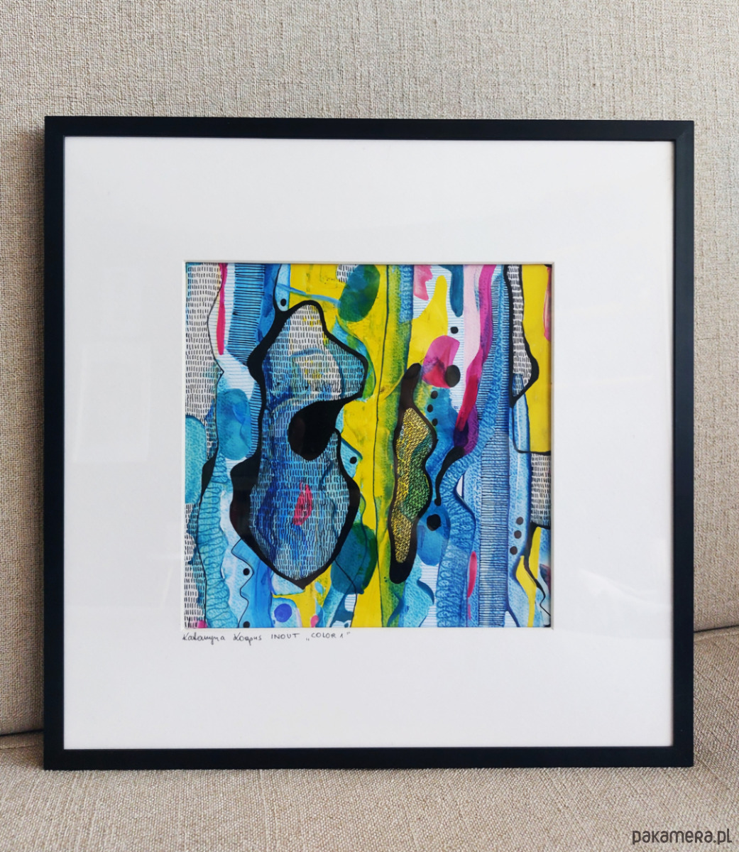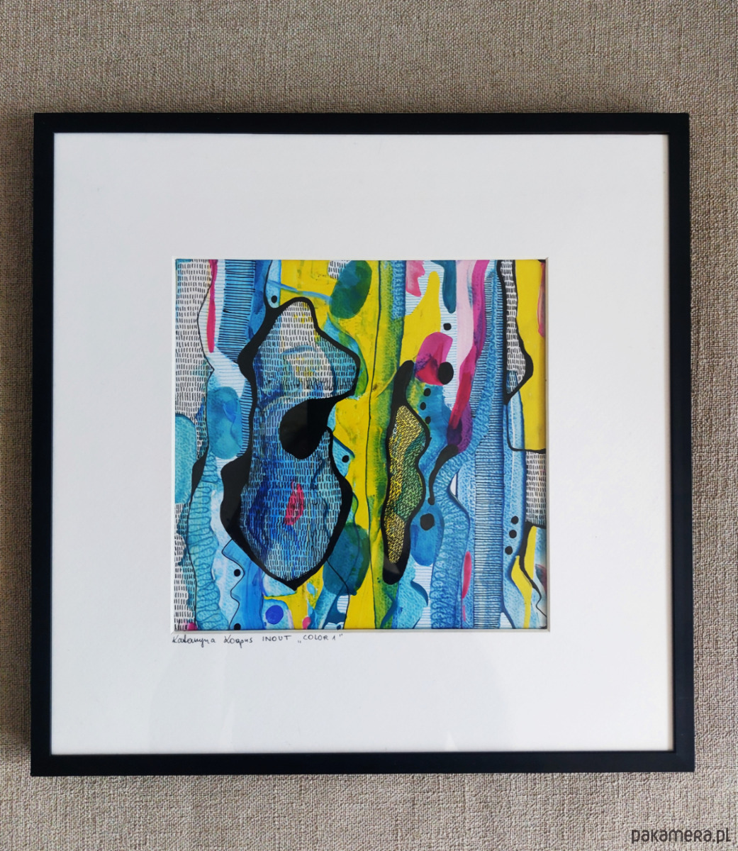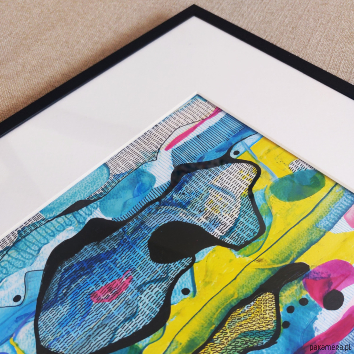 FUZJA to abstrakcja ręcznie malowana na grubym papierze. Oprawiona jest w kwadratową ramkę w kolorze czarnym oraz białe passepartout, które podkreśla żywą kolorystykę całości.