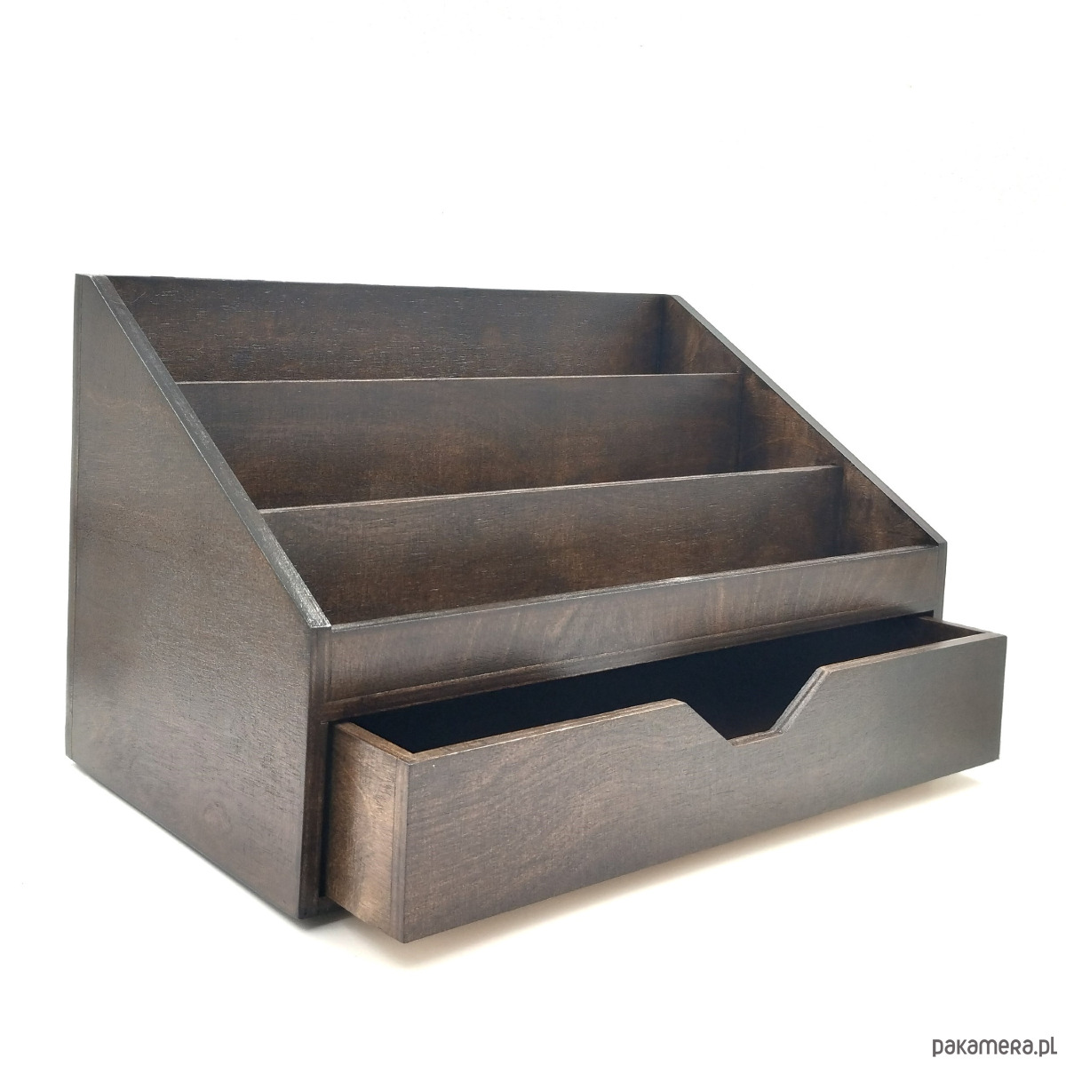 Organizer wykonany jest z drewnianej sklejki, malowany na ciemny brąz (wenge).
