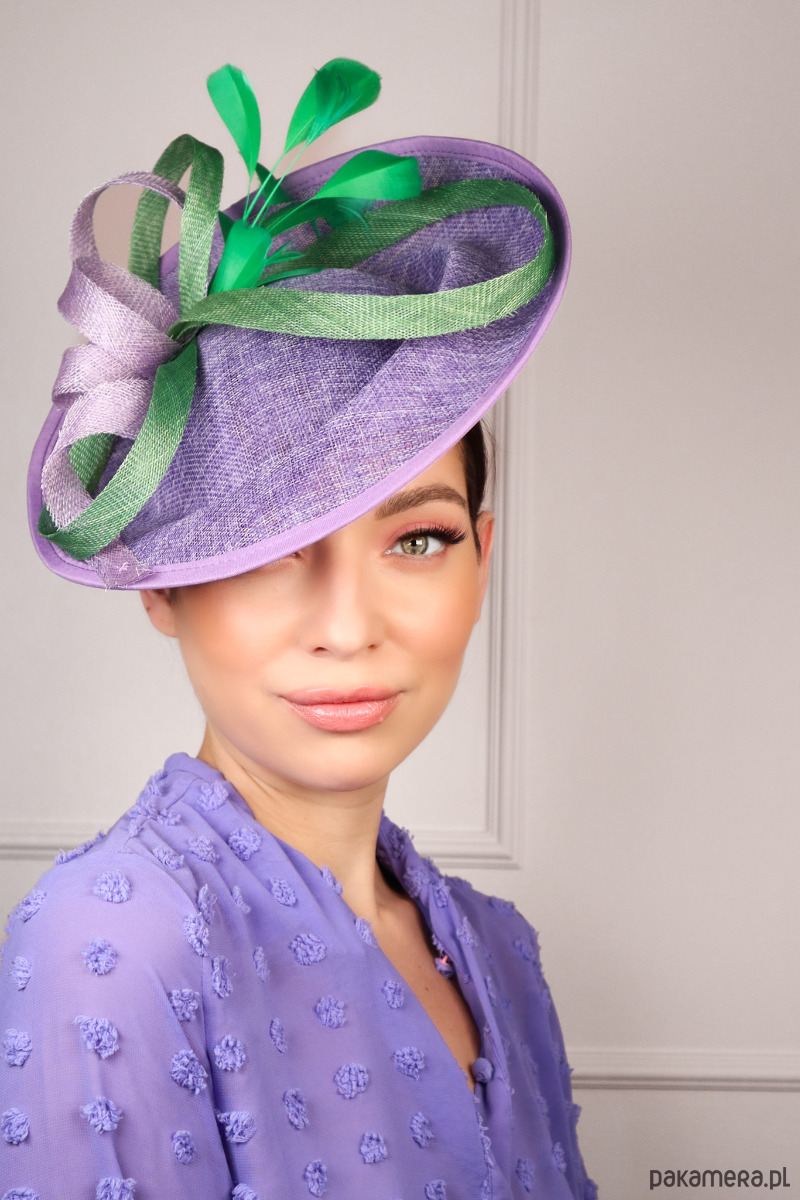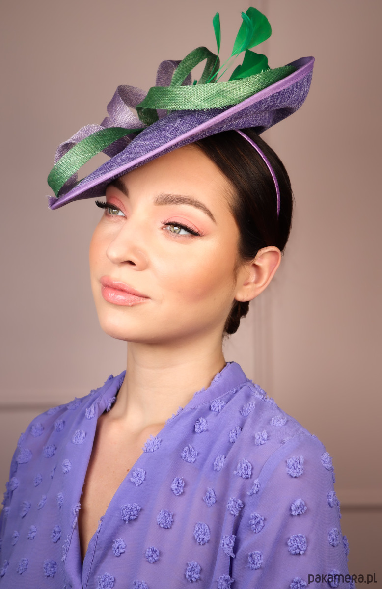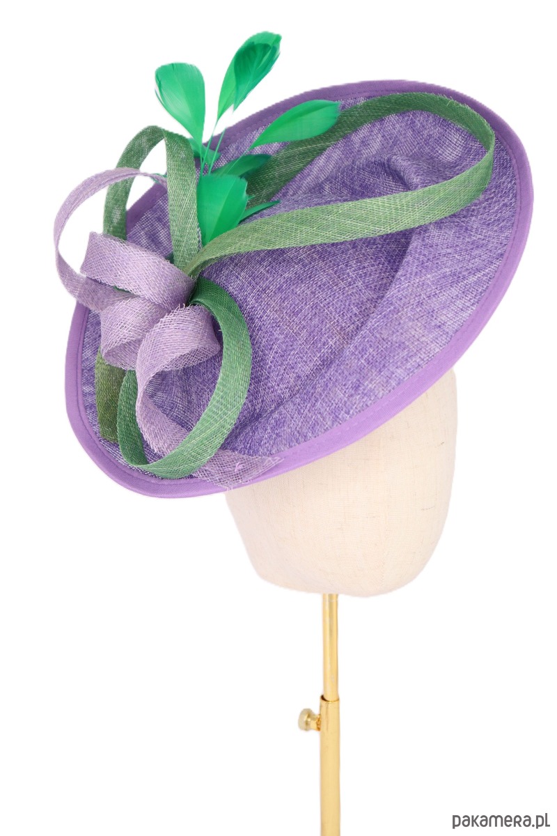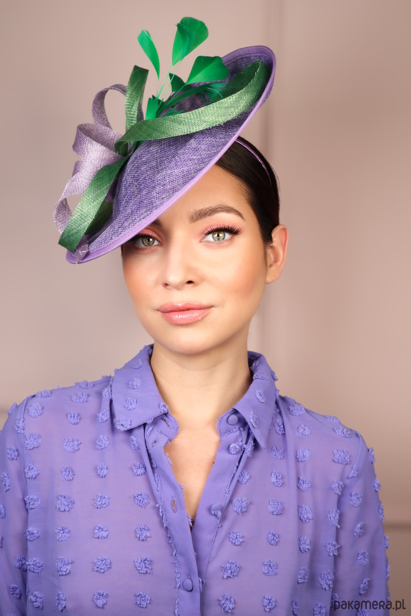 Zdobienie: Fantazyjne, dynamiczne upięcie z pasm sinamay w kolorze fioletu i zieleni, zwieńczone smukłymi piórkami.