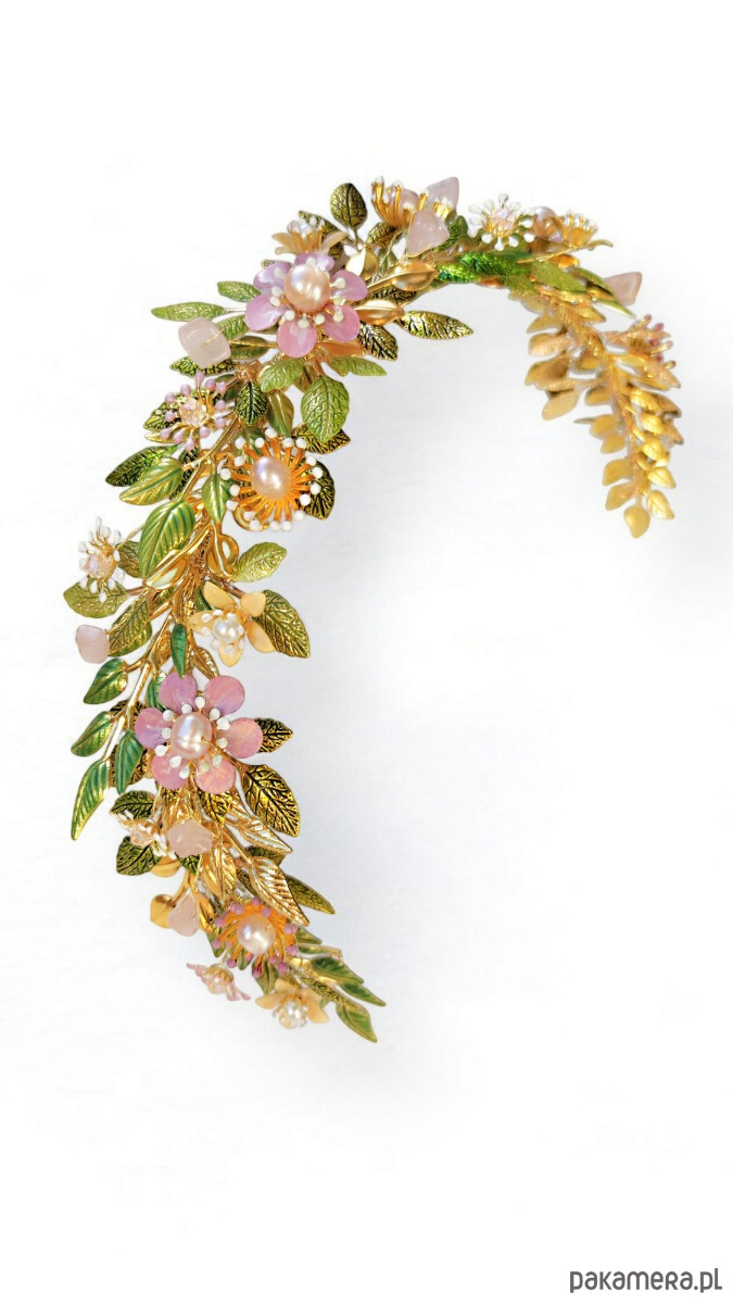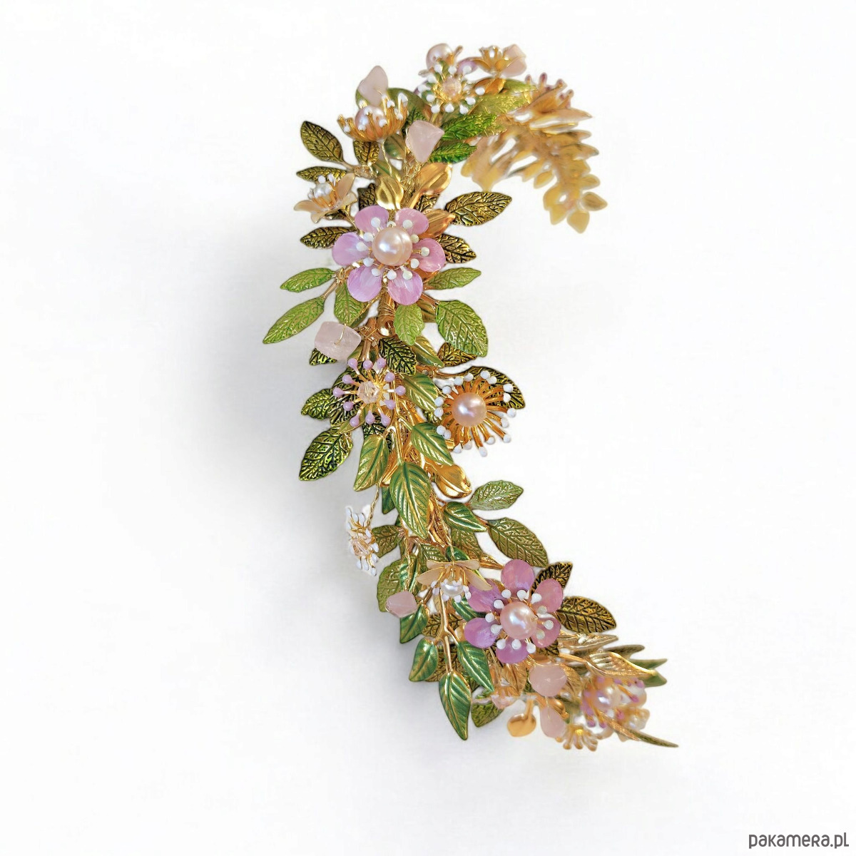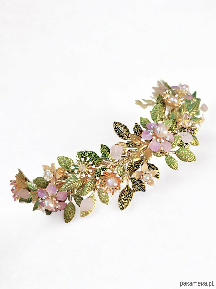 Luksusowe akcenty w postaci naturalnych różowych pereł oraz kwarcu różowego wprowadzają nutę elegancji i harmonii. Gałązka ma długość 31 cm i szerokość 3,5–4 cm, co pozwala na wszechstronne upięcia – zarówno nad kokiem, jak i jako subtelną opaskę w luźnych włosach.