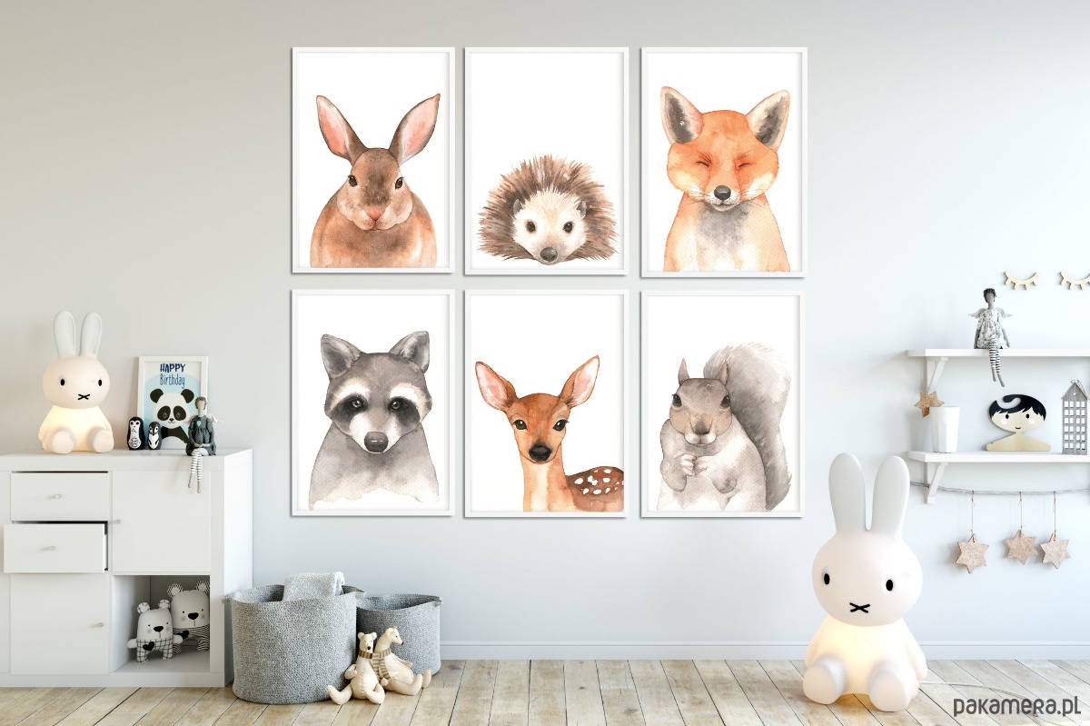 Zestaw 6 plakatów z akwarelowymi leśnymi zwierzakami na białym tle. Prosty sposób na stworzenie galerii obrazków w pokoju dziecka.